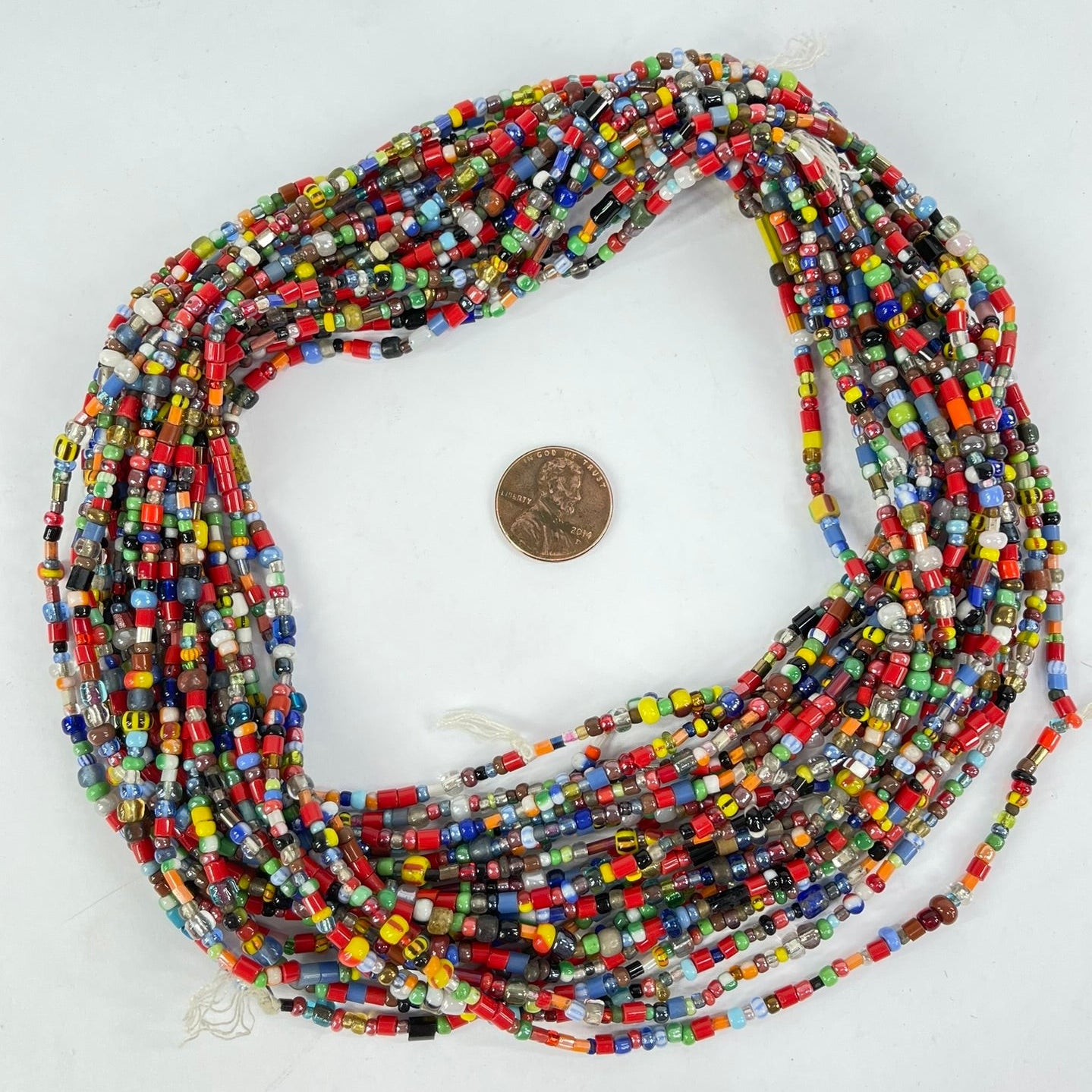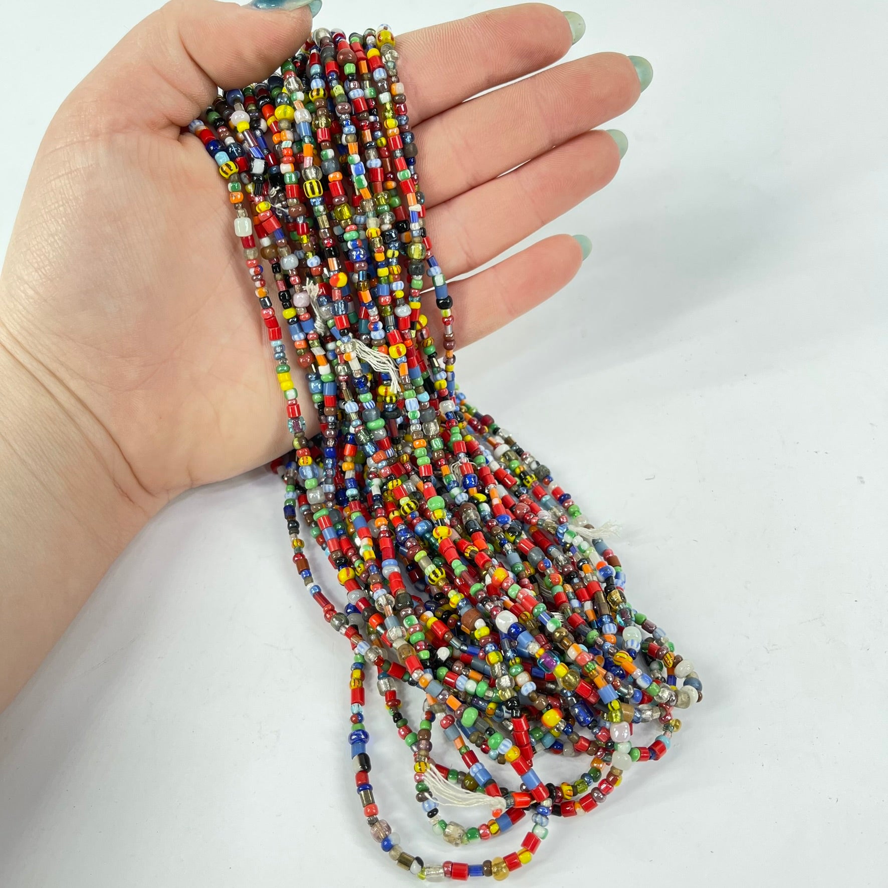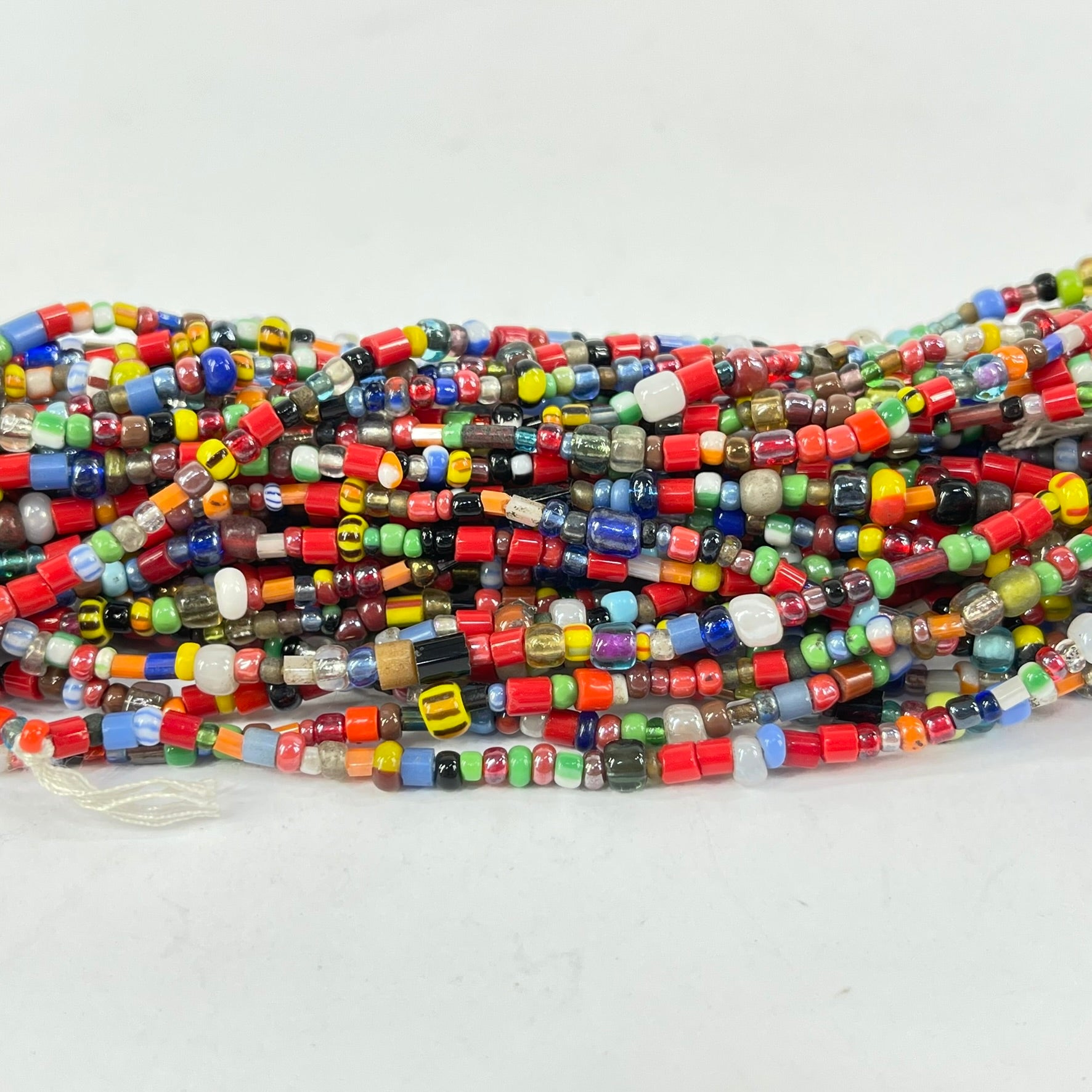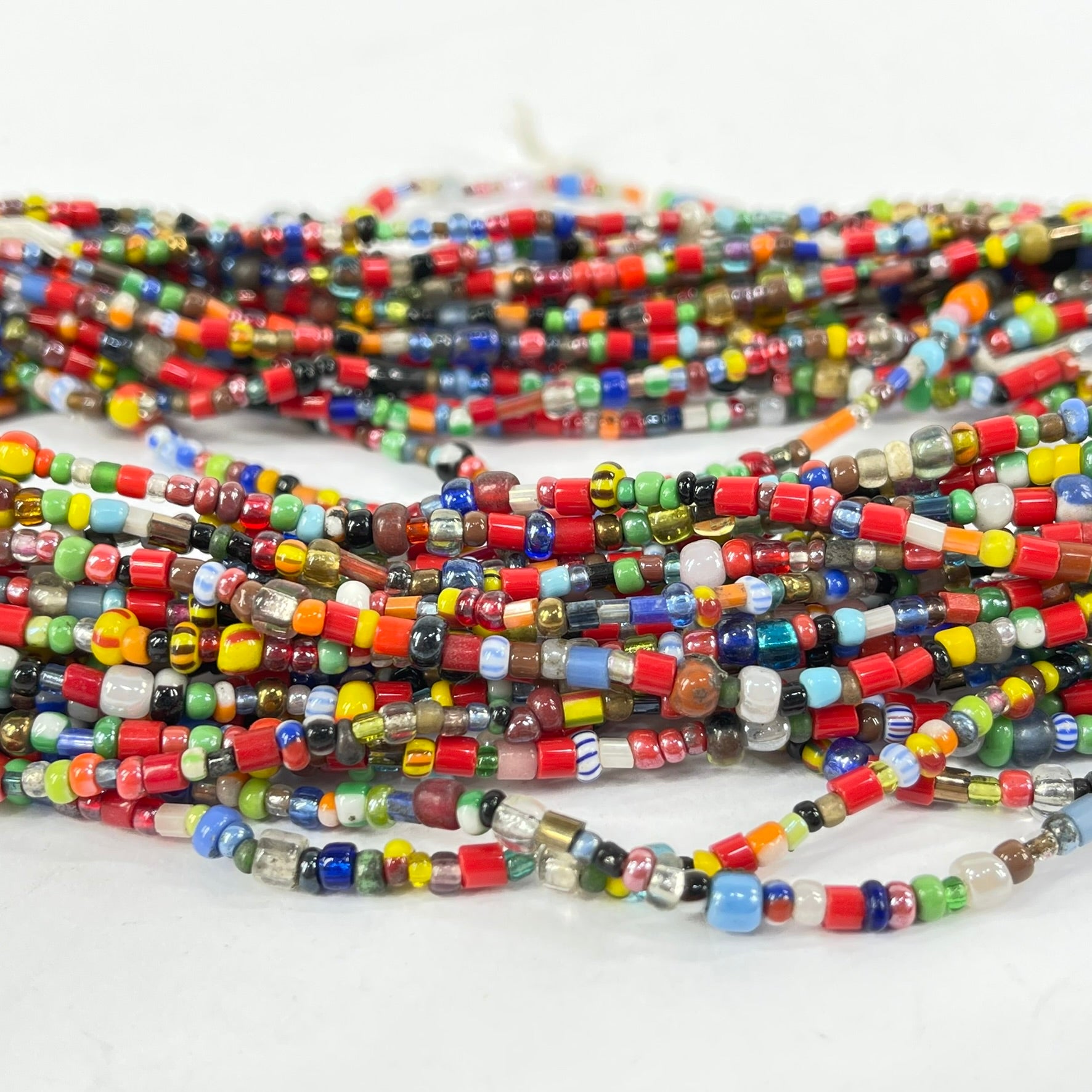 Christmas Love Beads are easily recognized by their unique multicolored “confetti” pattern, created by rolling molten glass over tiny chips of contrasting colored canes. Each bead is distinct, with lively splashes of red, green, yellow, white, blue, and more—giving the strand its festive, holiday-like appearance and the nickname “Christmas” beads.