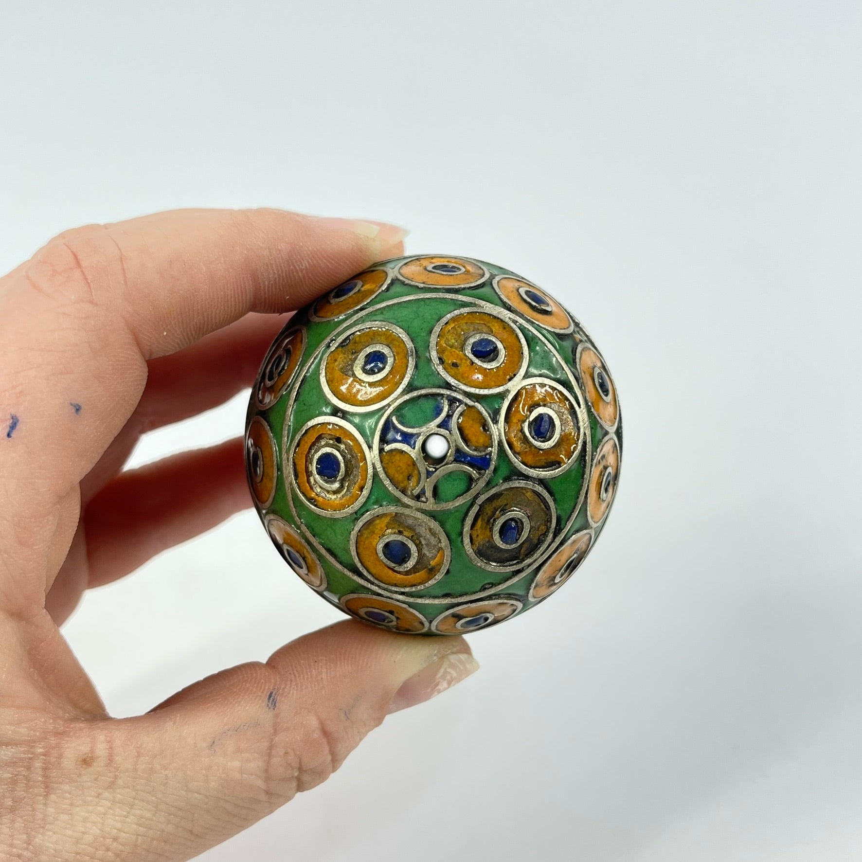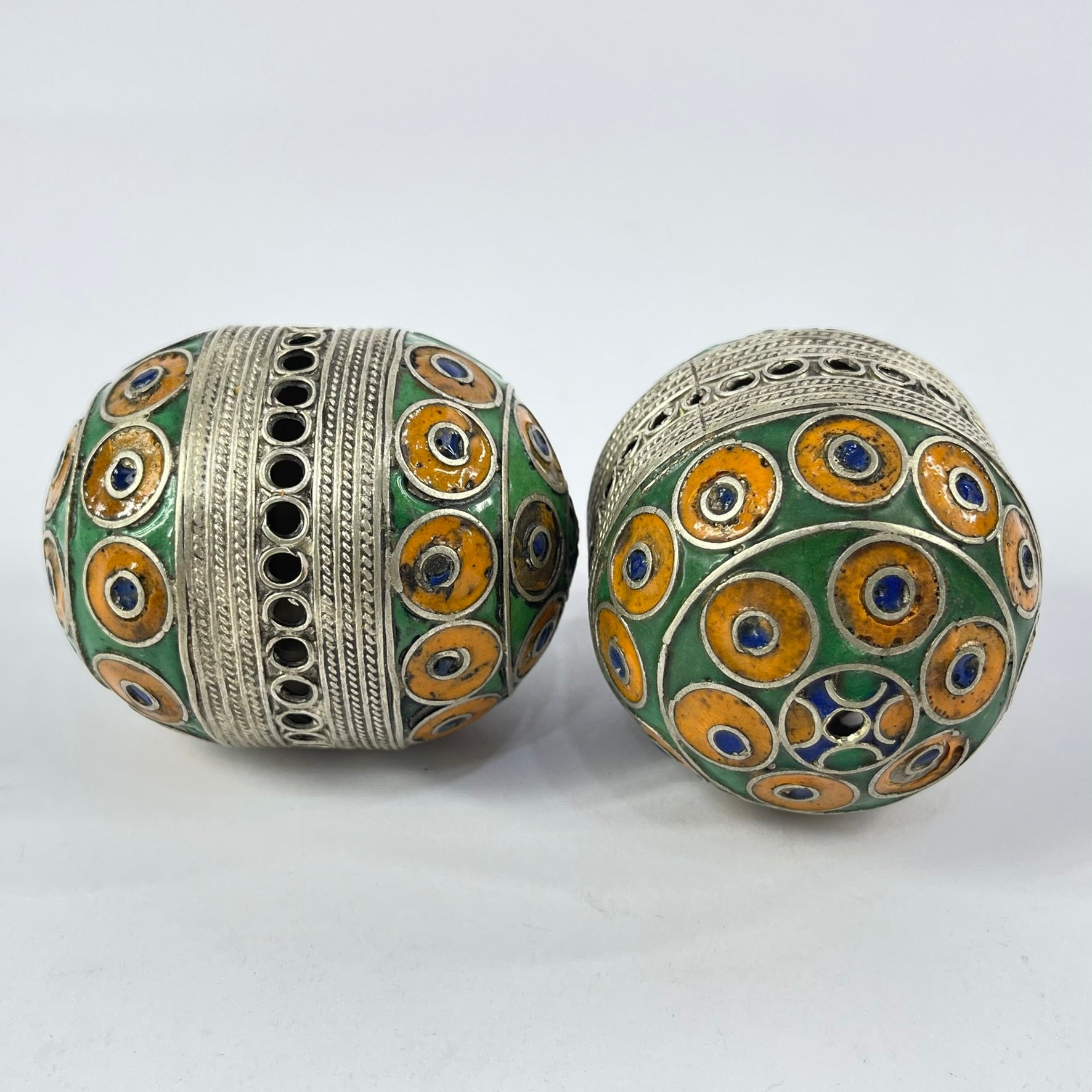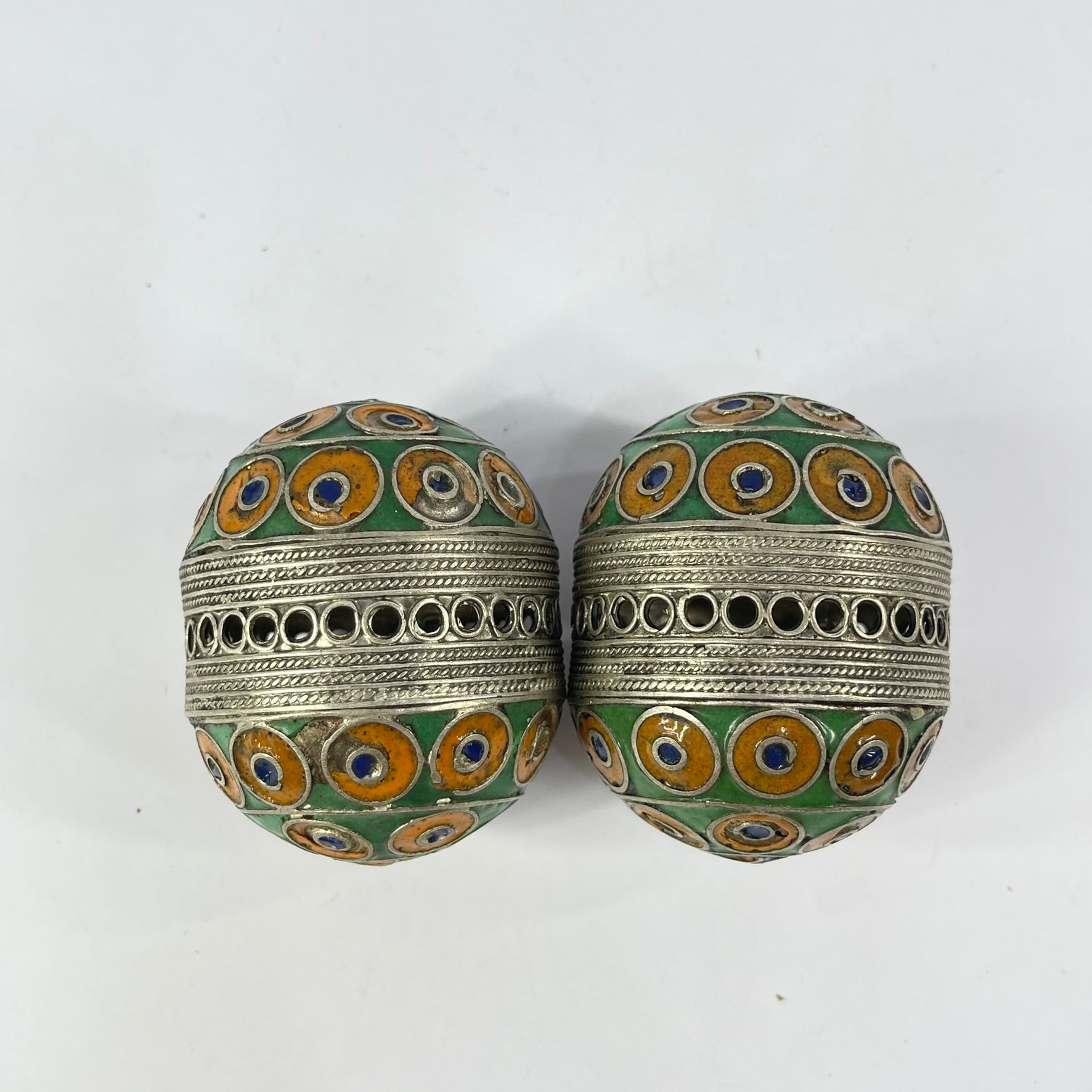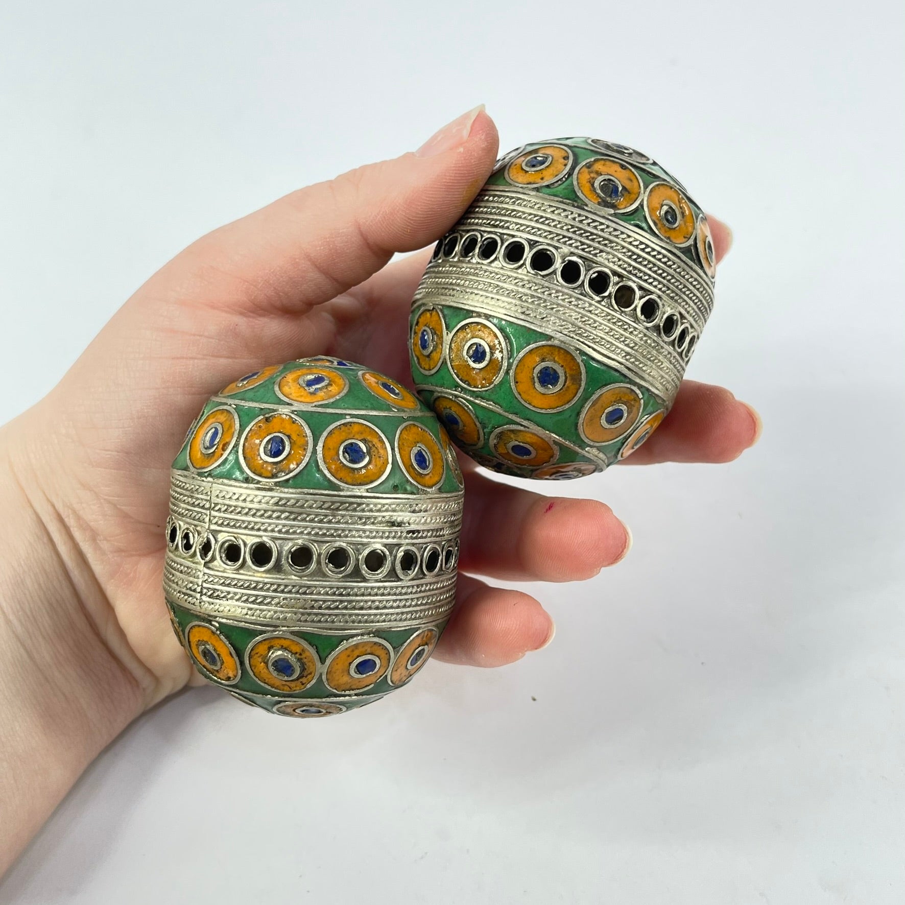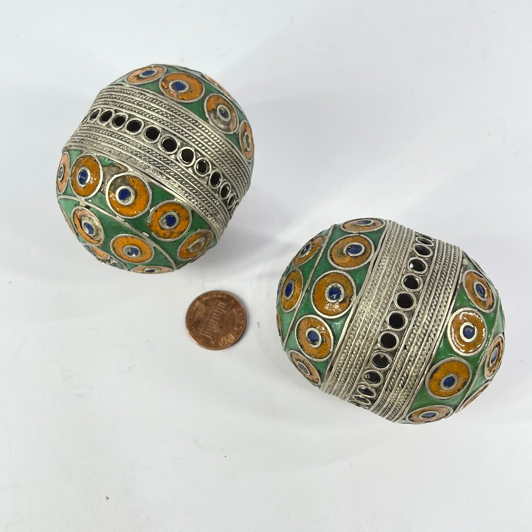 2 Moroccan Metal Enamel Huge Green and Orange Trade Bead