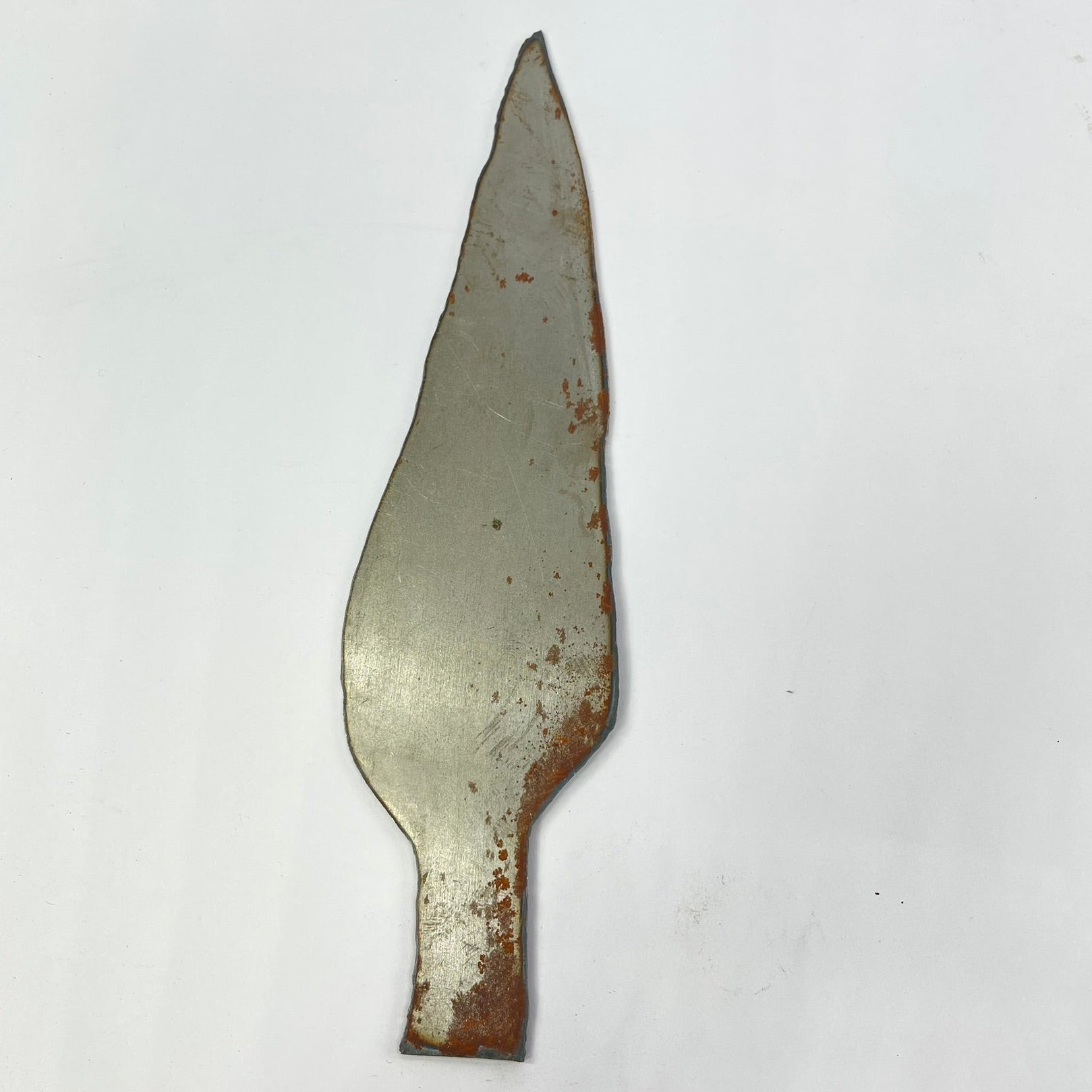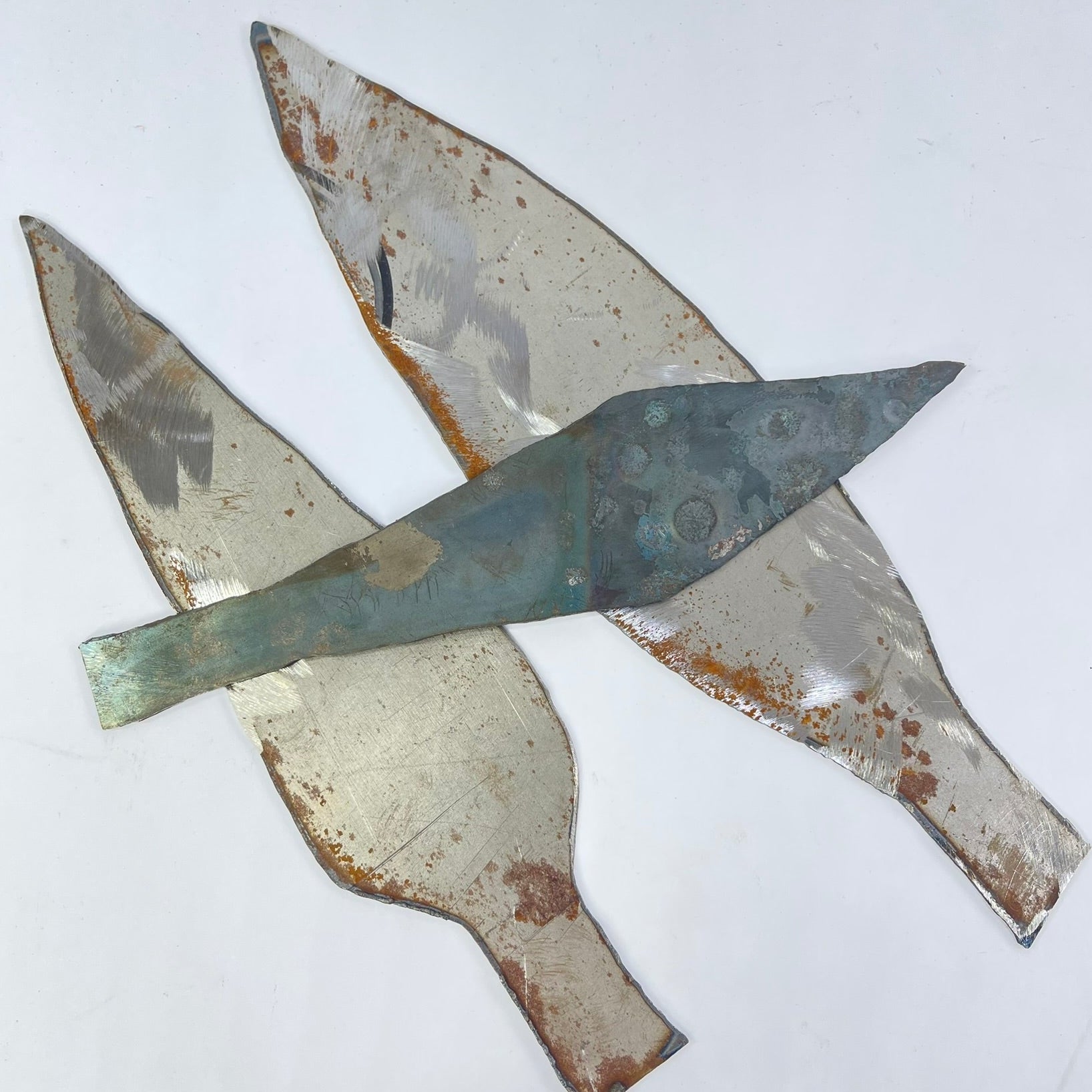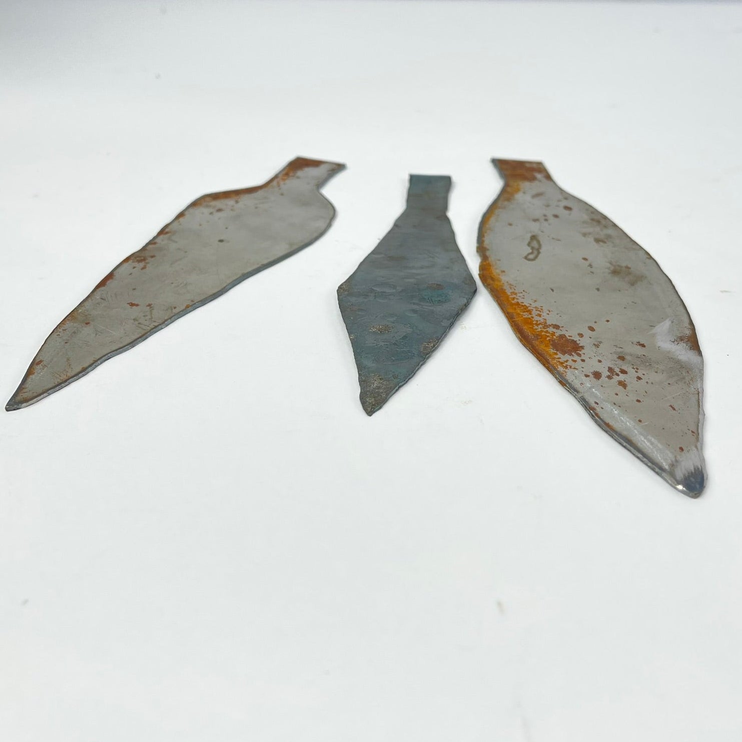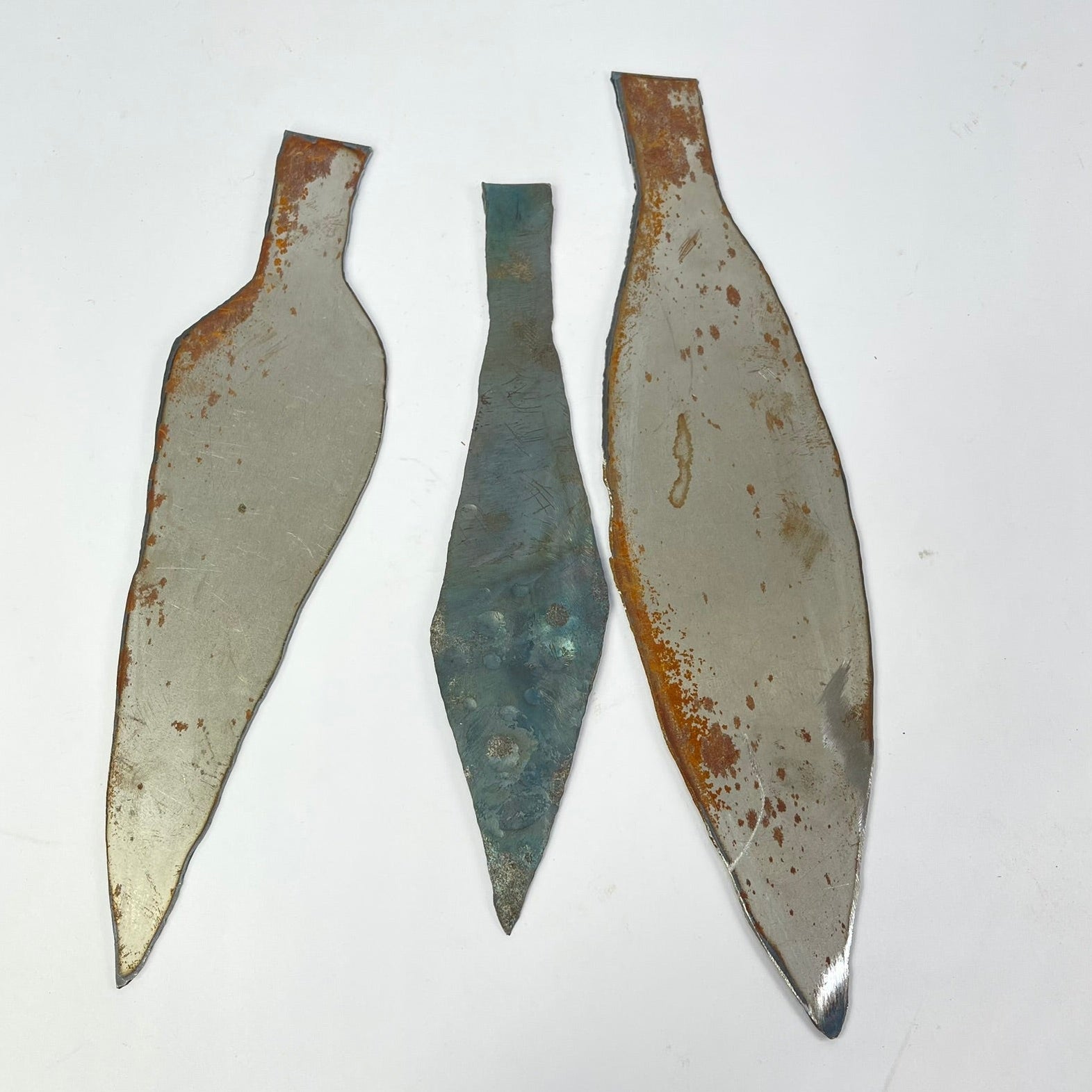 This set includes three handmade metal spearheads, each with a distinct shape and surface character. Forged from metal and left with visible hammer marks, oxidation, and natural patina, the pieces reflect traditional handcrafting techniques and age-related wear.