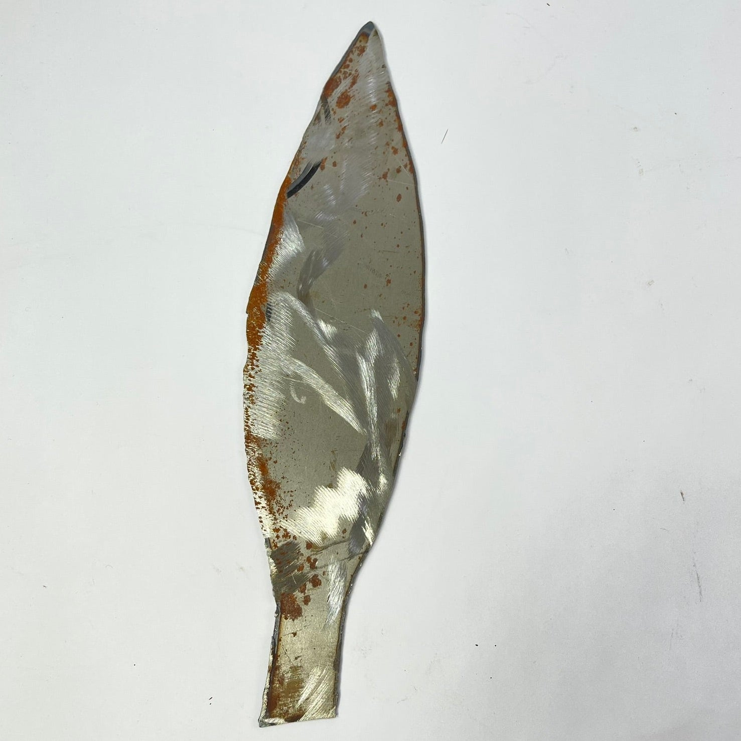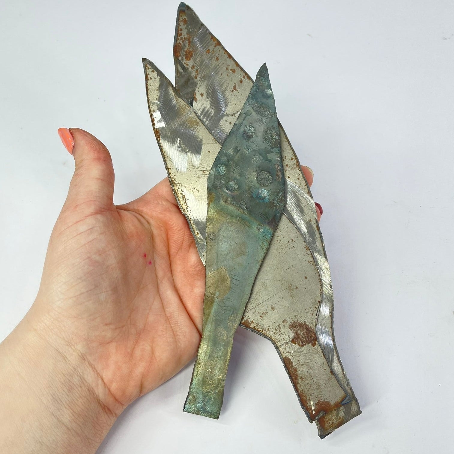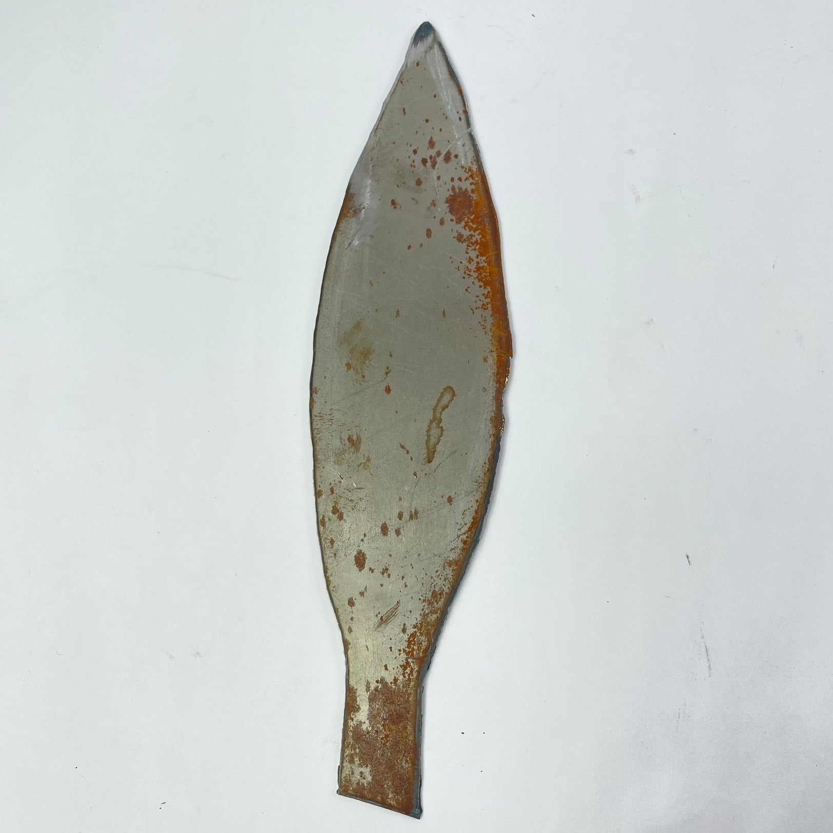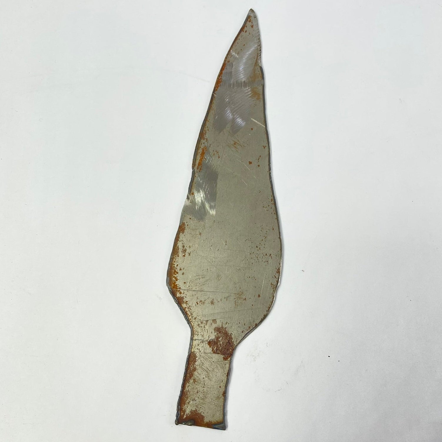 This set includes three handmade metal spearheads, each with a distinct shape and surface character. Forged from metal and left with visible hammer marks, oxidation, and natural patina, the pieces reflect traditional handcrafting techniques and age-related wear.