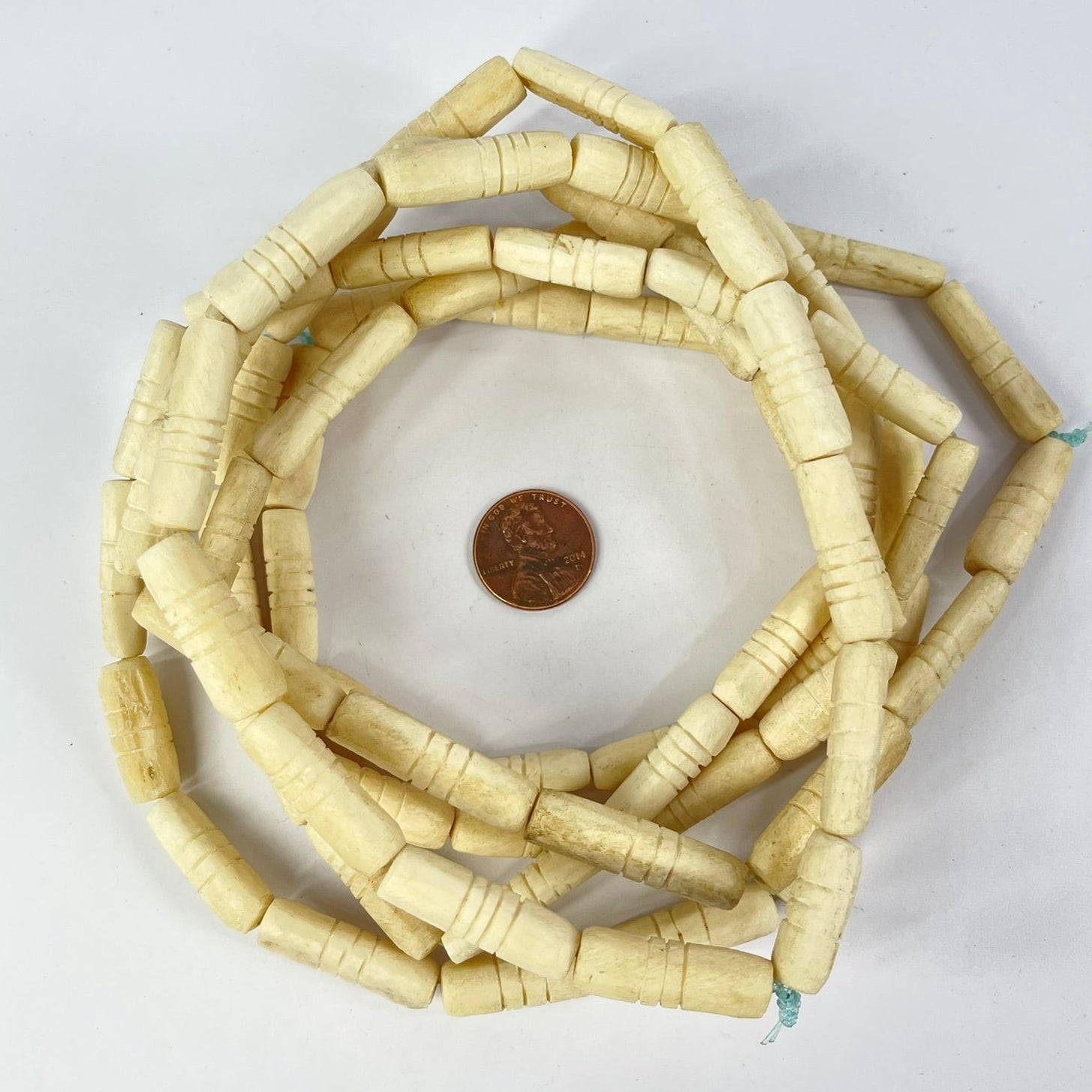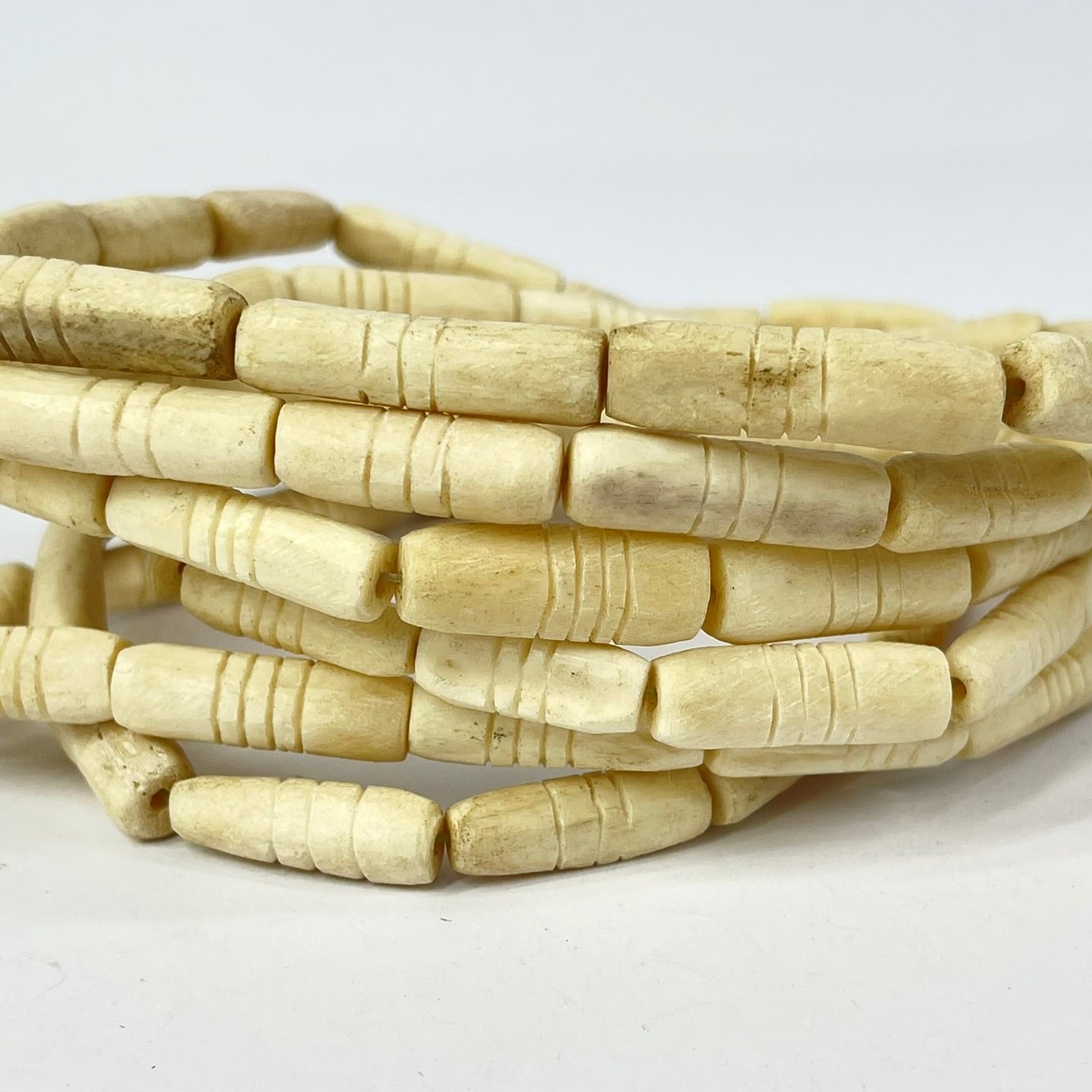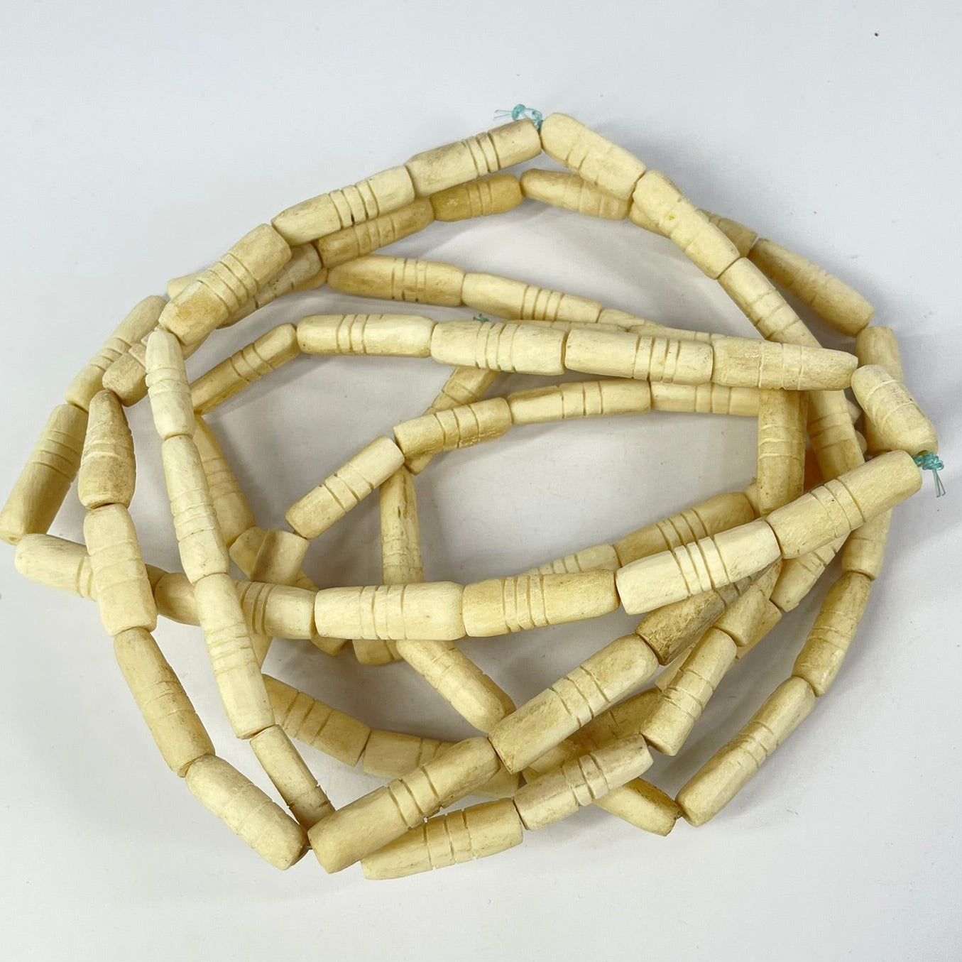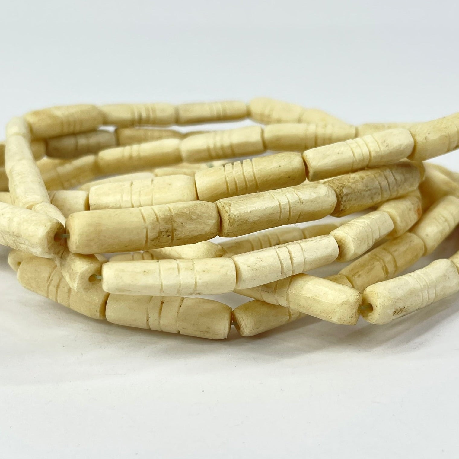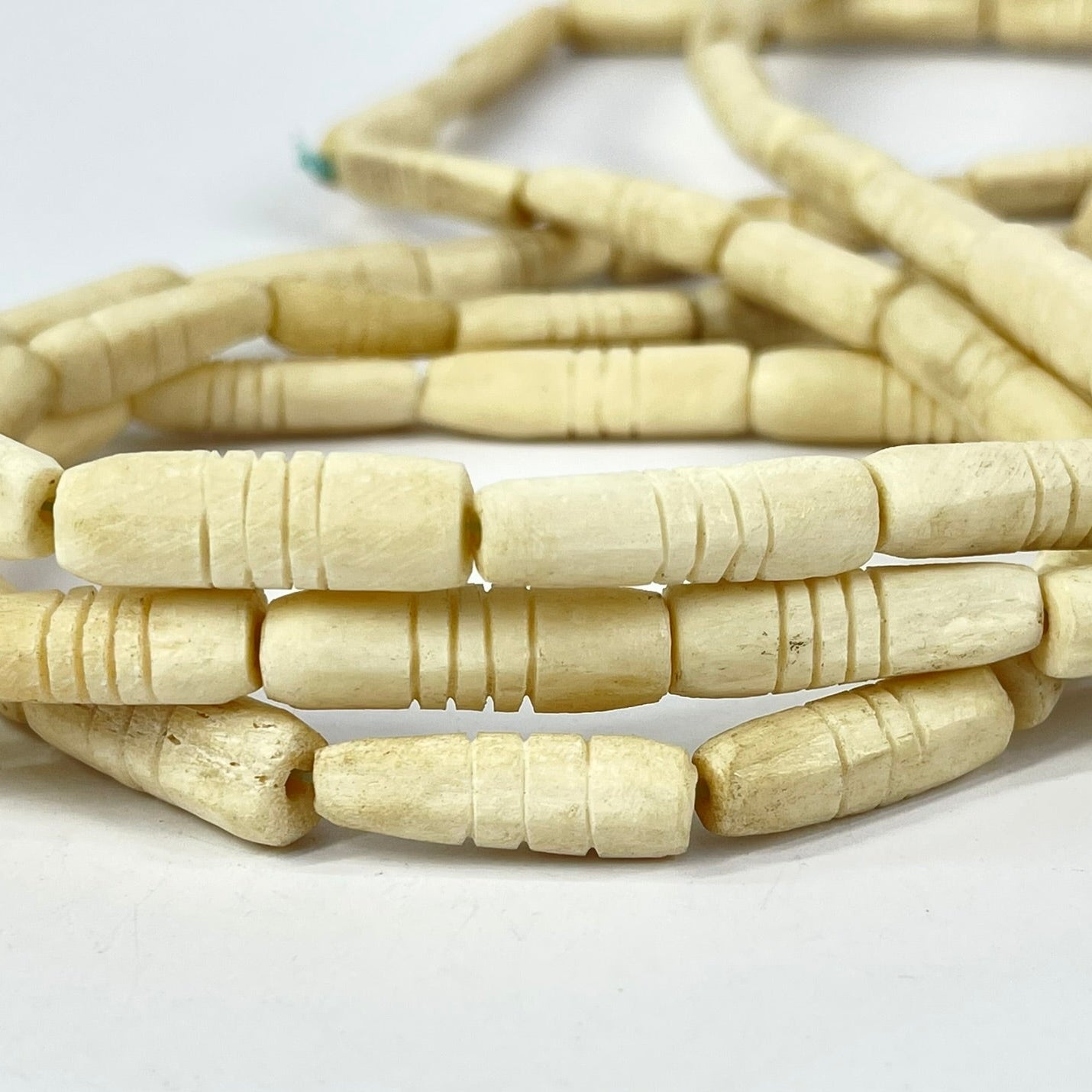 White carved bone beads from Nigeria are intricately crafted beads made from the bones of animals such as cows, camels, or buffalo. These beads are often used in traditional African jewelry, such as necklaces and bracelets, and are prized for their durability and natural texture. They can also be used in a variety of crafting projects and are popular among jewelry makers and collectors alike.
