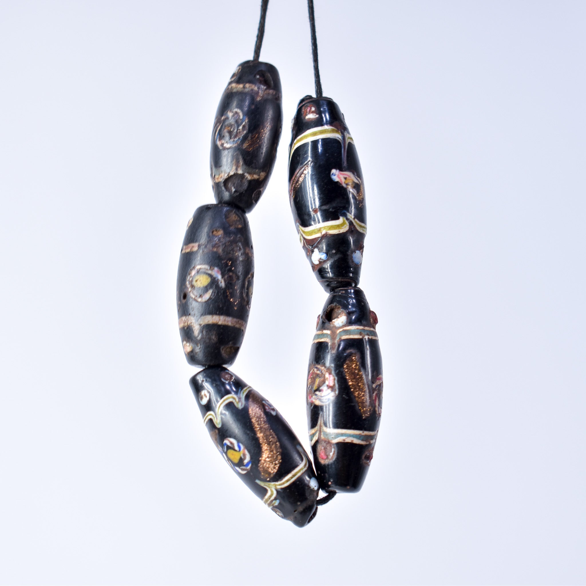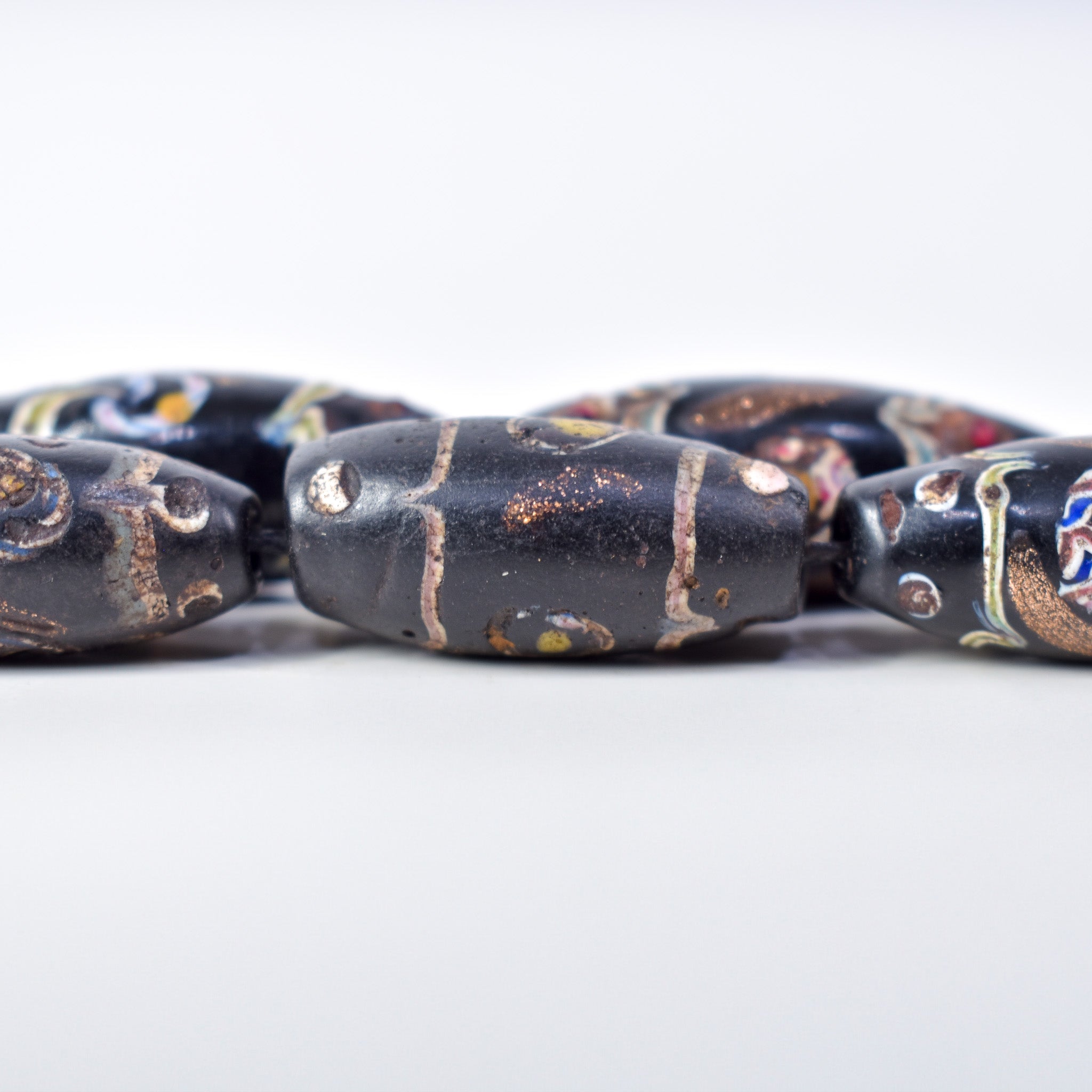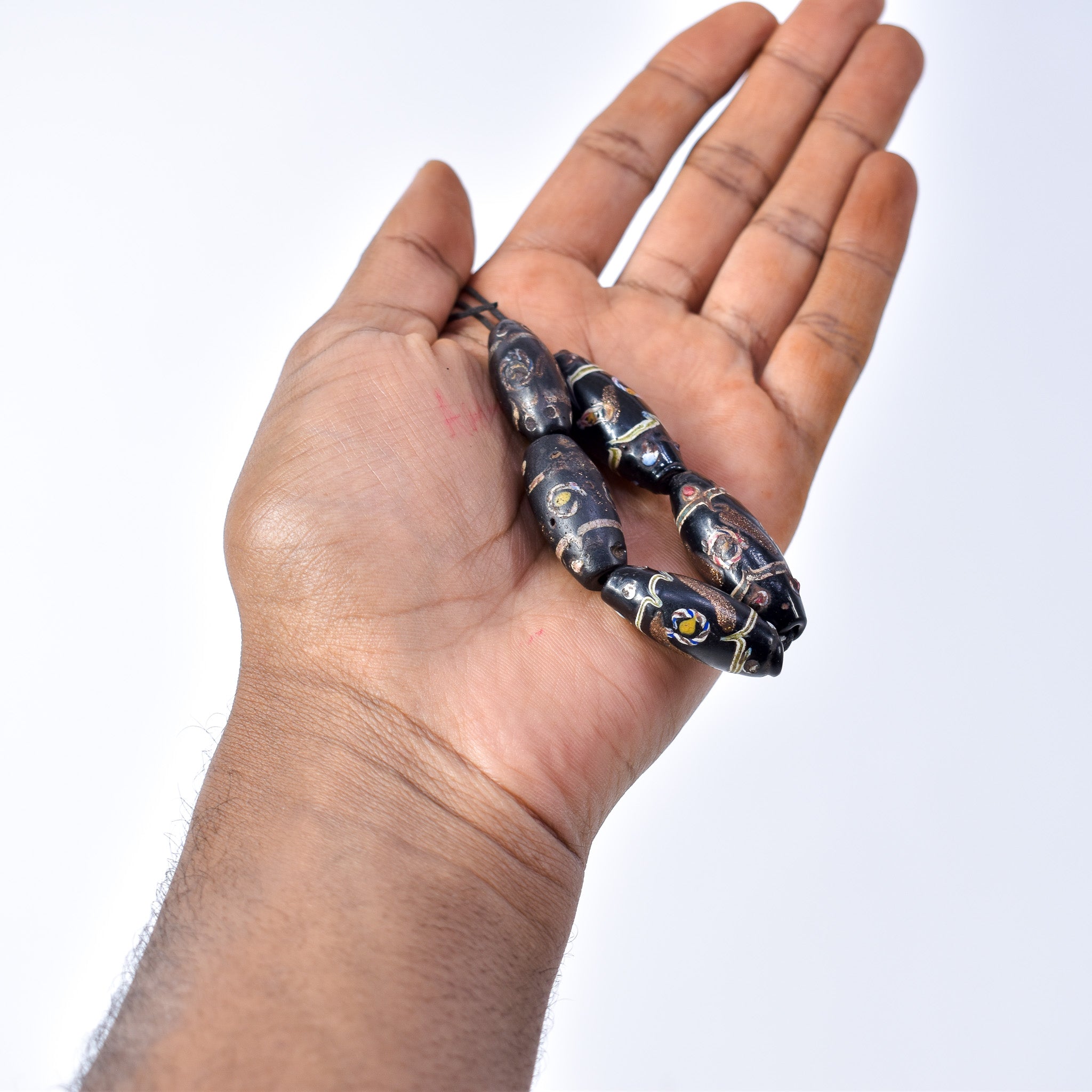 "Trade Beads" refer to beads primarily produced in Venice, Bohemia, and other European countries from the late 1400s to the early 1900s, traded in Africa and the Americas. The peak of this trade occurred from the mid-1800s to the early 1900s, with the Venetians dominating production. J.F. Sick and Co. and Moses Lewin Levin played significant roles as bead brokers/importers. The beads gained renewed popularity in the late 1960s when they were exported from Africa to the U.S. and Europe. The term "Trade Beads" became widely used, and they were also known as "Love Beads" during the Hippie era. As demand grew, specific names like "Russian Blues" and "Dutch Donuts" emerged, contributing to the beads' collectability. Today, these beads are highly sought after, with some styles becoming rarer as African traders venture deeper into the continent to find them.
