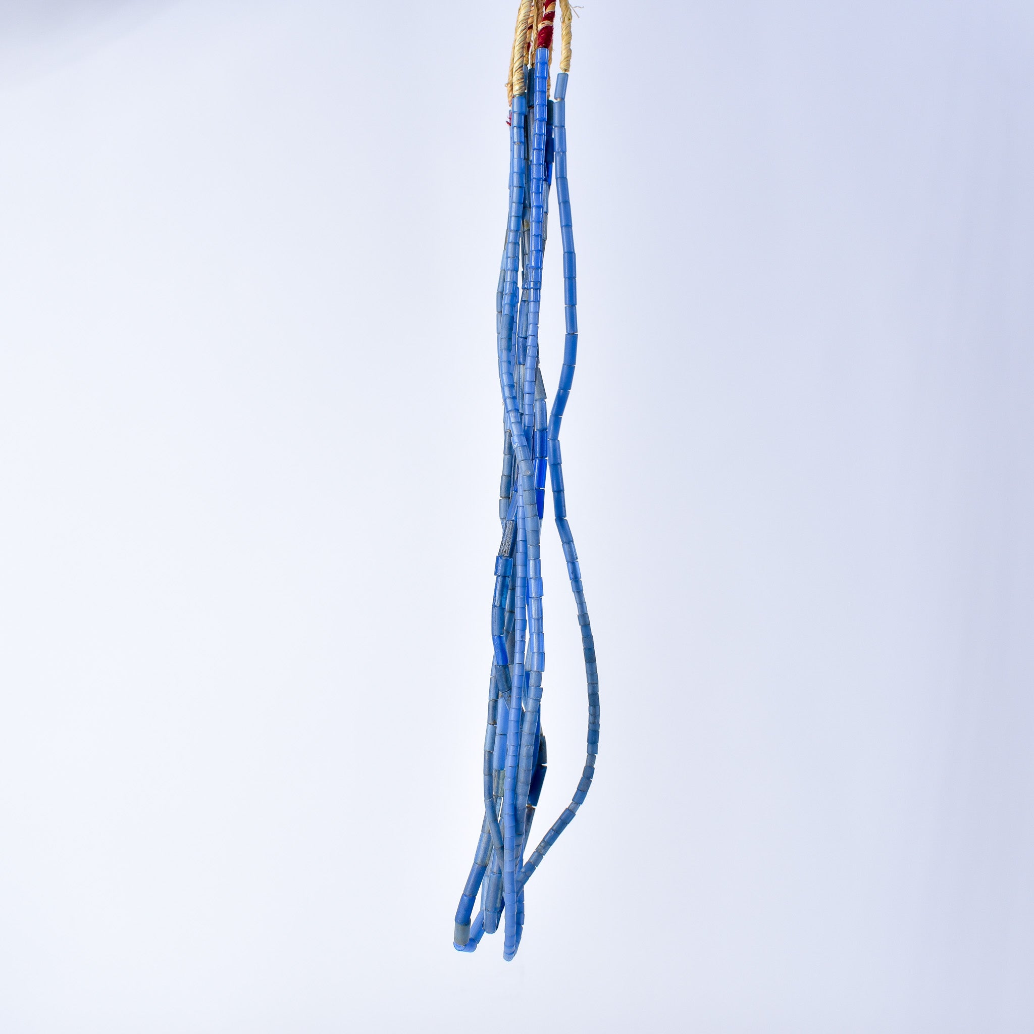 Bida blue glass trade beads, originating from the city of Bida in present-day Nigeria and produced in the late 19th century, are a distinctive type of decorative glass bead with historical significance as currency and trade items in West Africa. Renowned for their vibrant blue color and unique shapes crafted through the wound glass technique, these beads were formed by heating a glass rod and wrapping it around a metal wire, then cooling and cutting it to size. Highly valued for their decorative appeal, they were utilized in traditional ceremonies and worn as jewelry by both men and women. Playing a pivotal role in the trans-Saharan trade network, connecting West Africa with North Africa and the Middle East, these beads were exchanged for commodities like salt, gold, and slaves, and used to pay tribute to local rulers. Presently, Bida blue glass trade beads continue to be produced in West Africa, featuring in both traditional and contemporary African jewelry designs and are sought after by collectors for their cultural and historical significance.