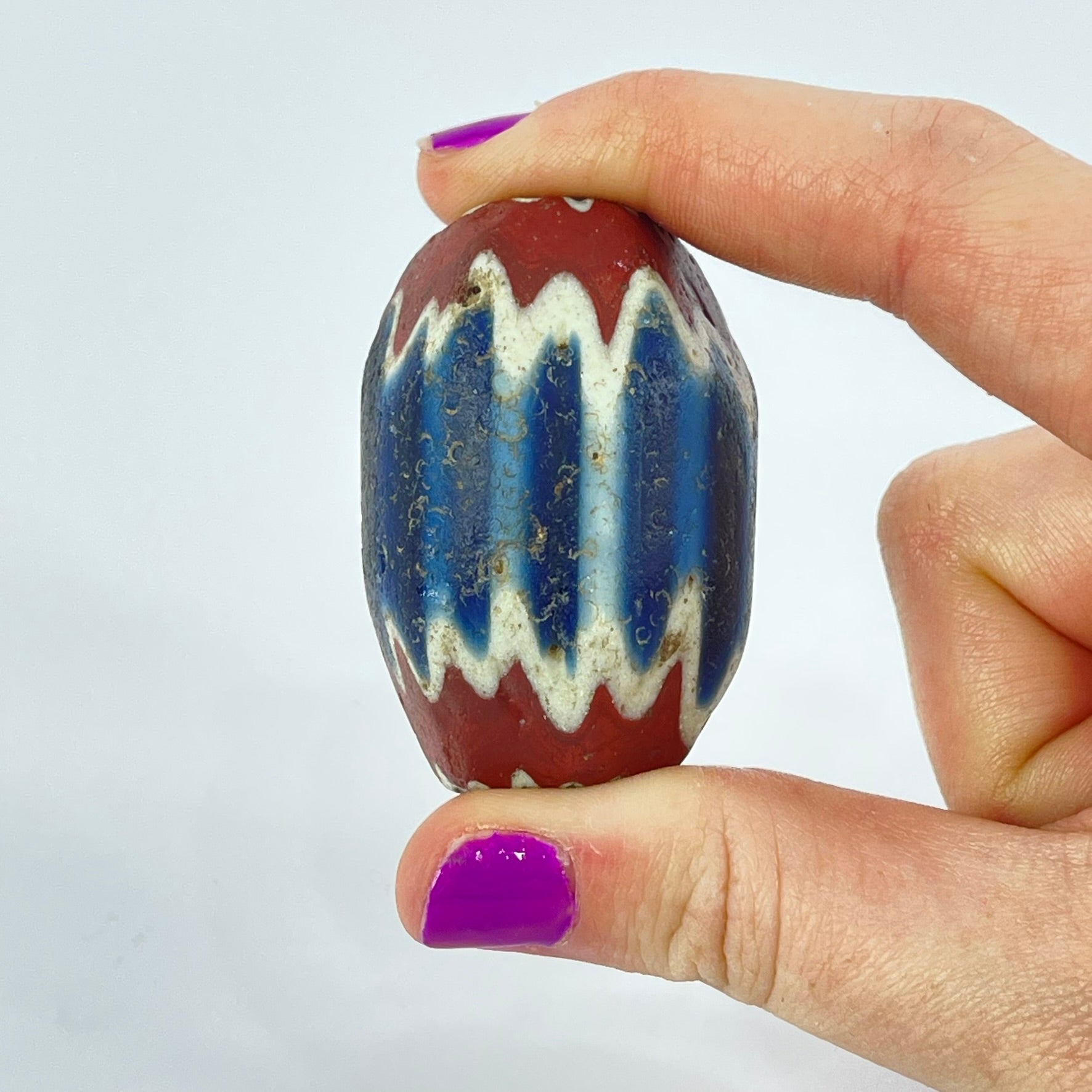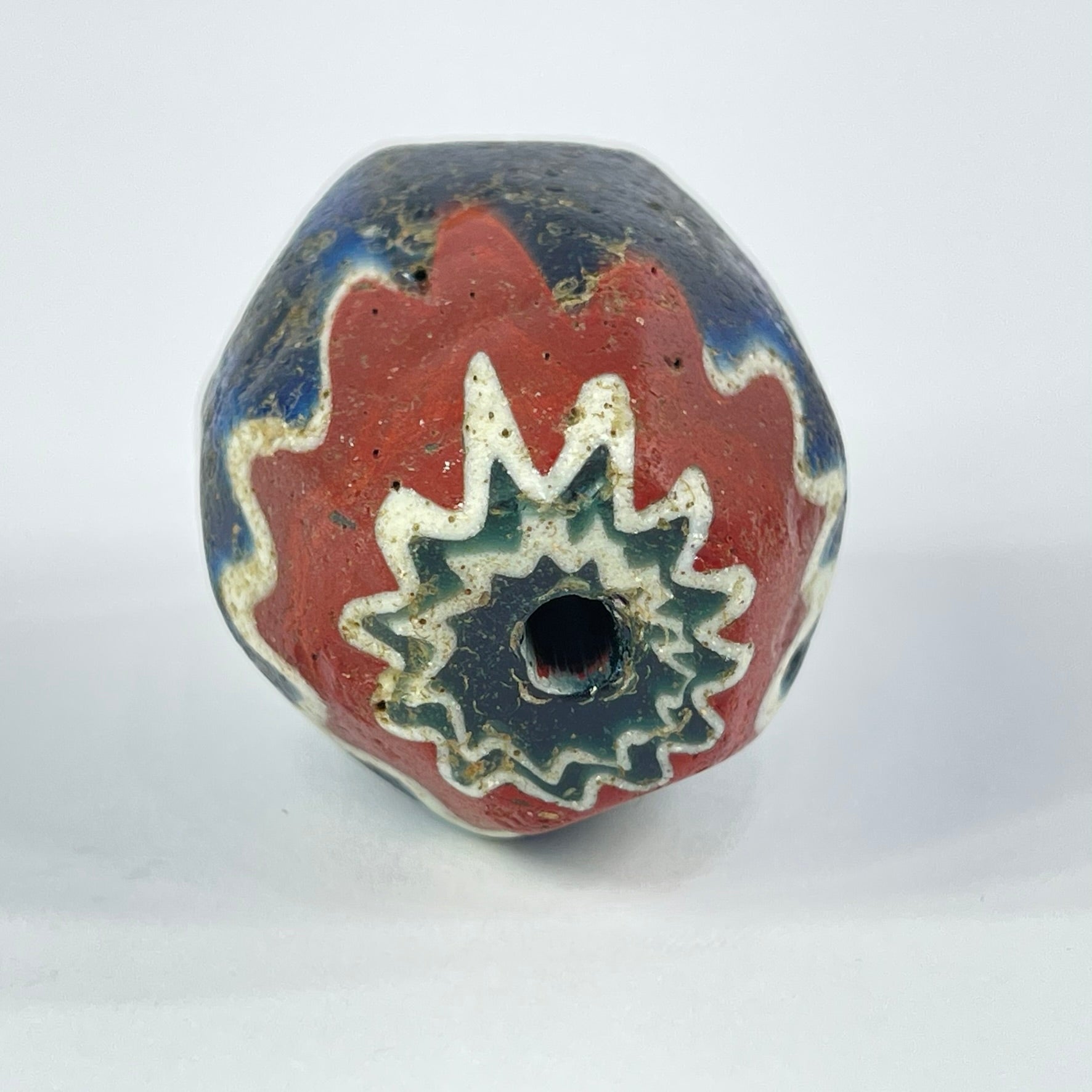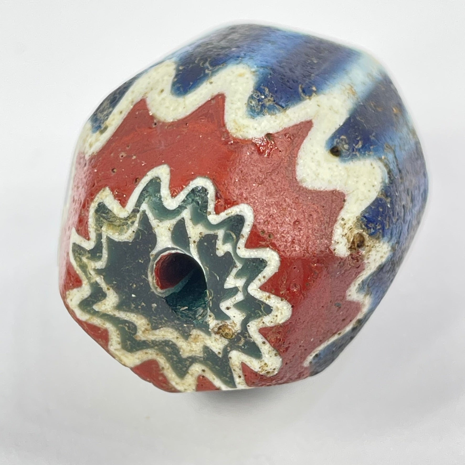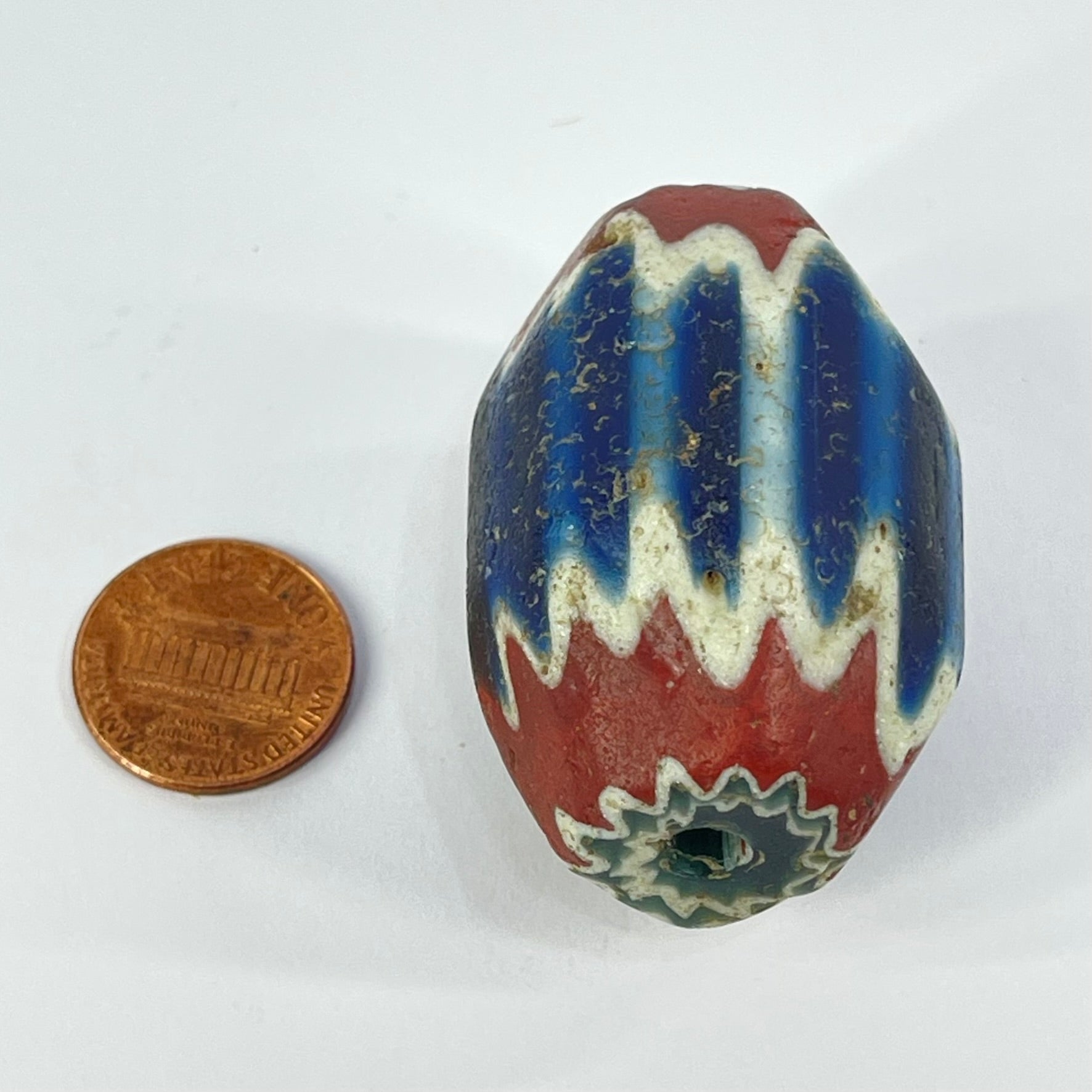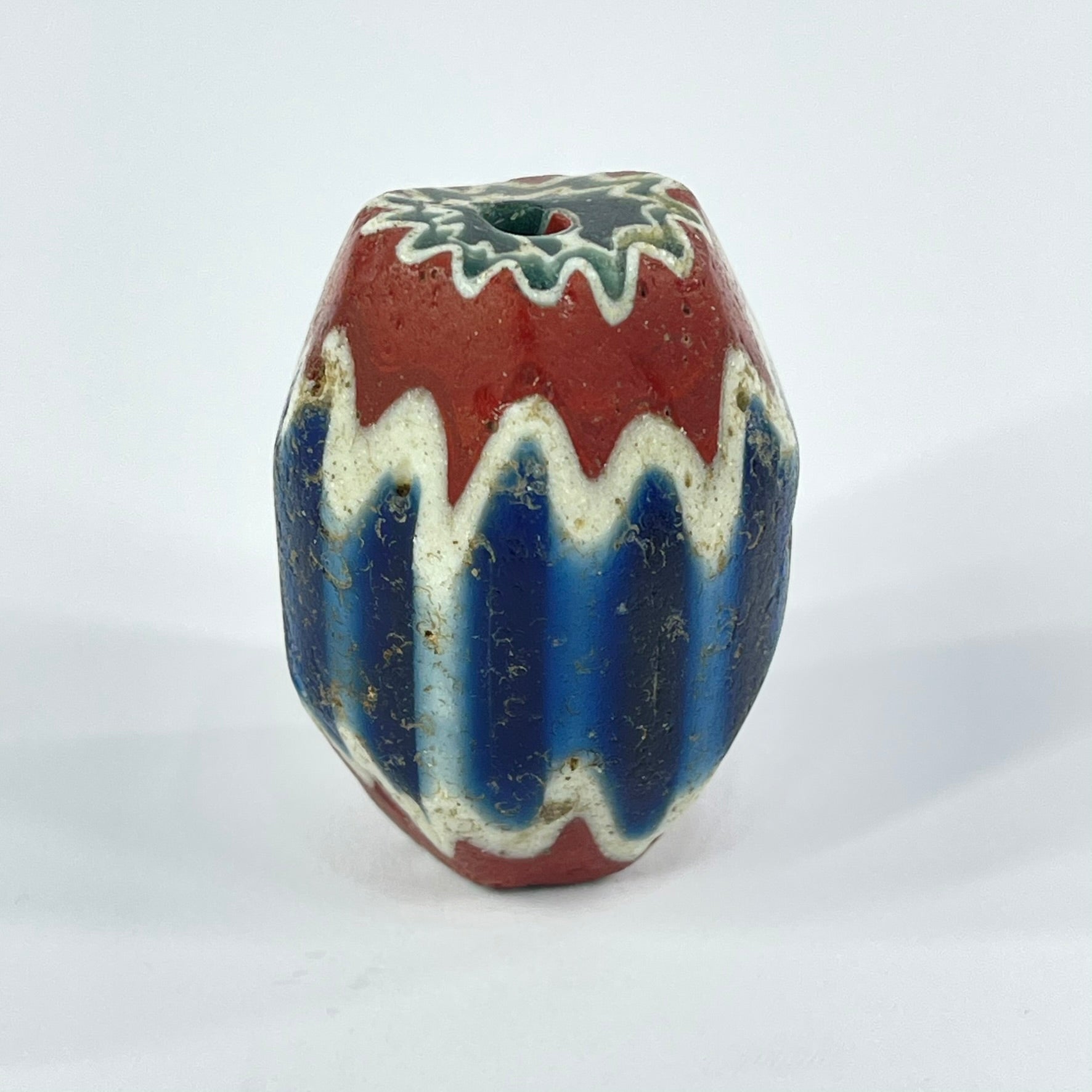 Highly prized in the African trade, chevron beads became symbols of status and adornment across West Africa. The crisp layered pattern and visible age wear make this a striking example of one of the most iconic trade beads ever produced.