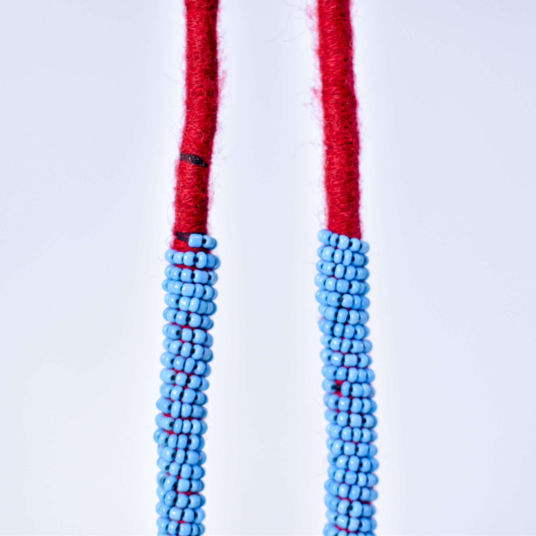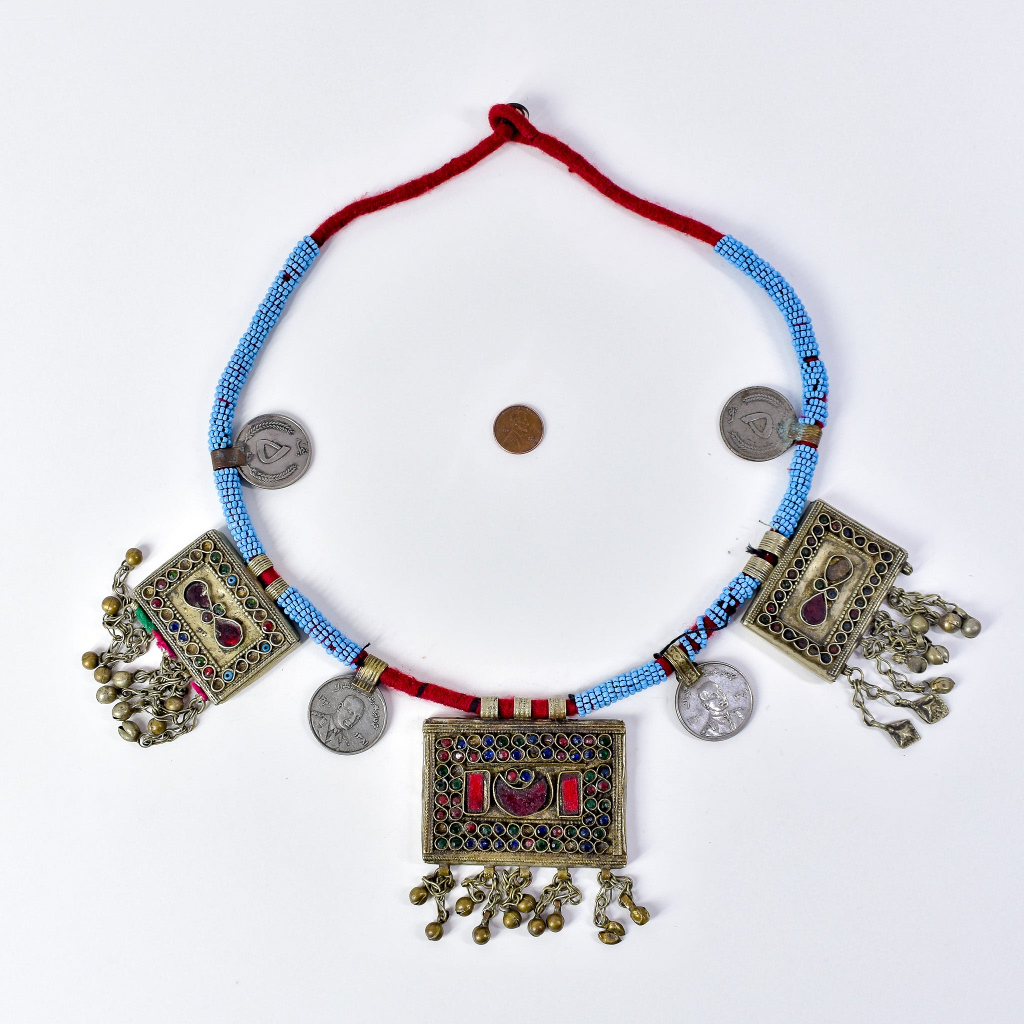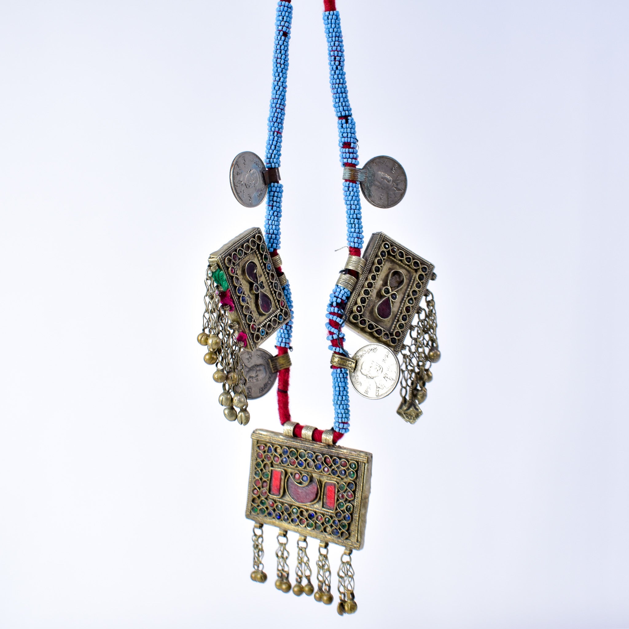This striking vintage necklace originates from the nomadic Kuchi people of Afghanistan, known for their bold, vibrant jewelry that blends cultural symbolism with everyday adornment. The piece features a series of rectangular pendants, each accented with detailed metalwork, paired with dangling coin pendants that add rhythmic movement and sound when worn. Interspersed among the pendants are blue glass beads, lending a vivid pop of color that contrasts beautifully with the aged patina of the metal.