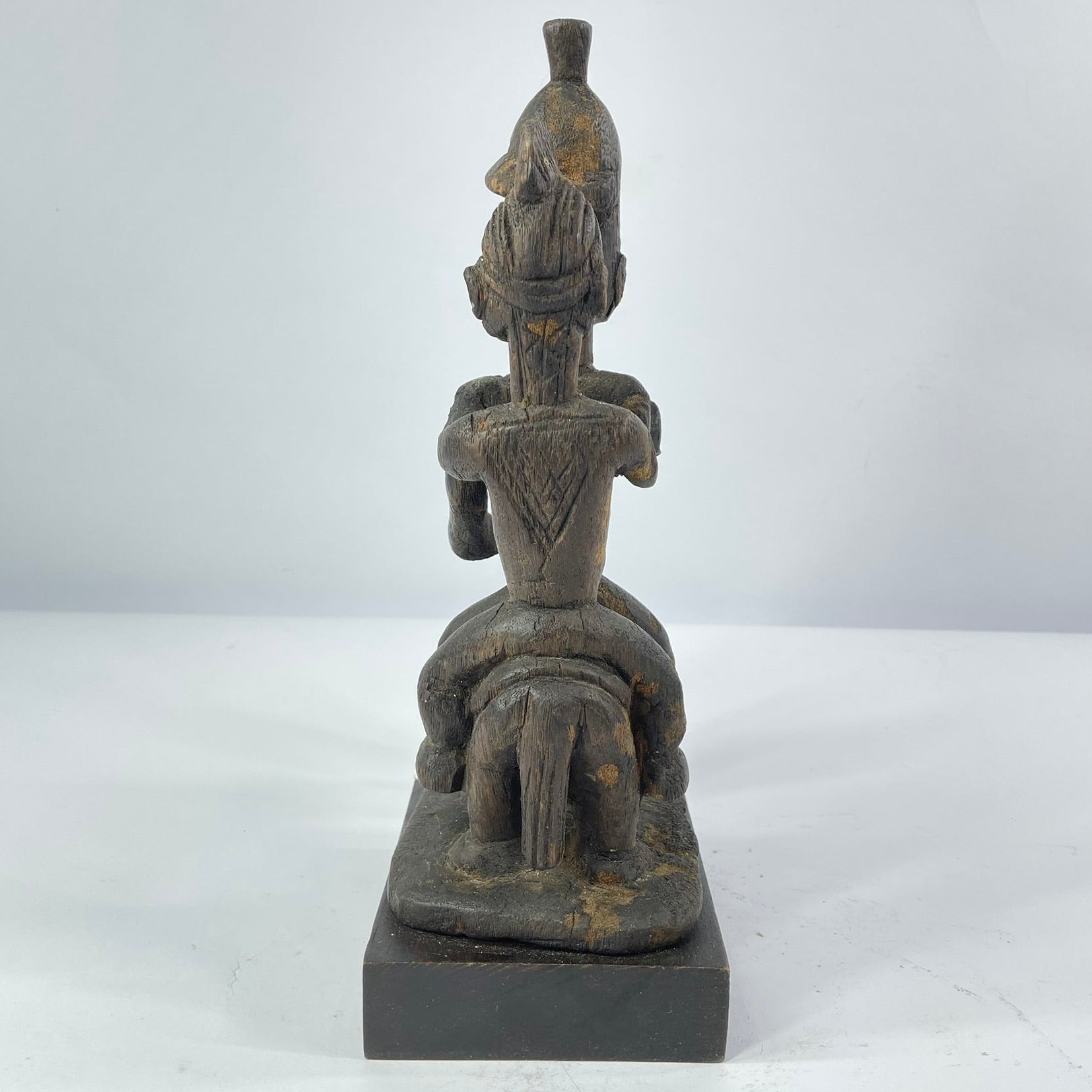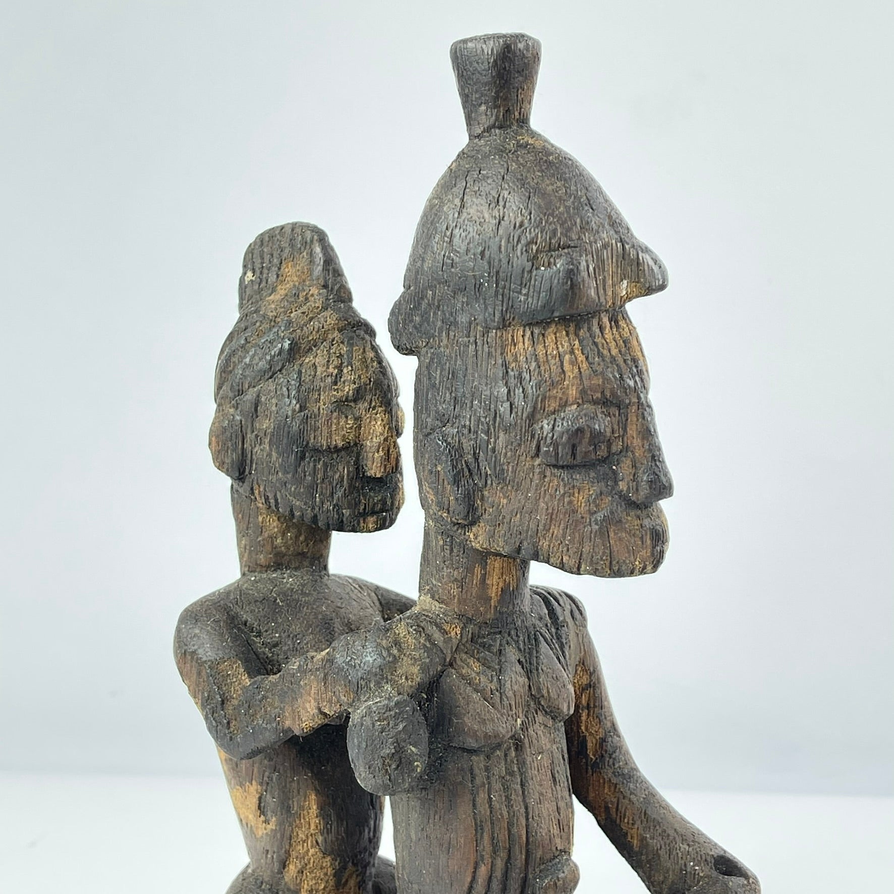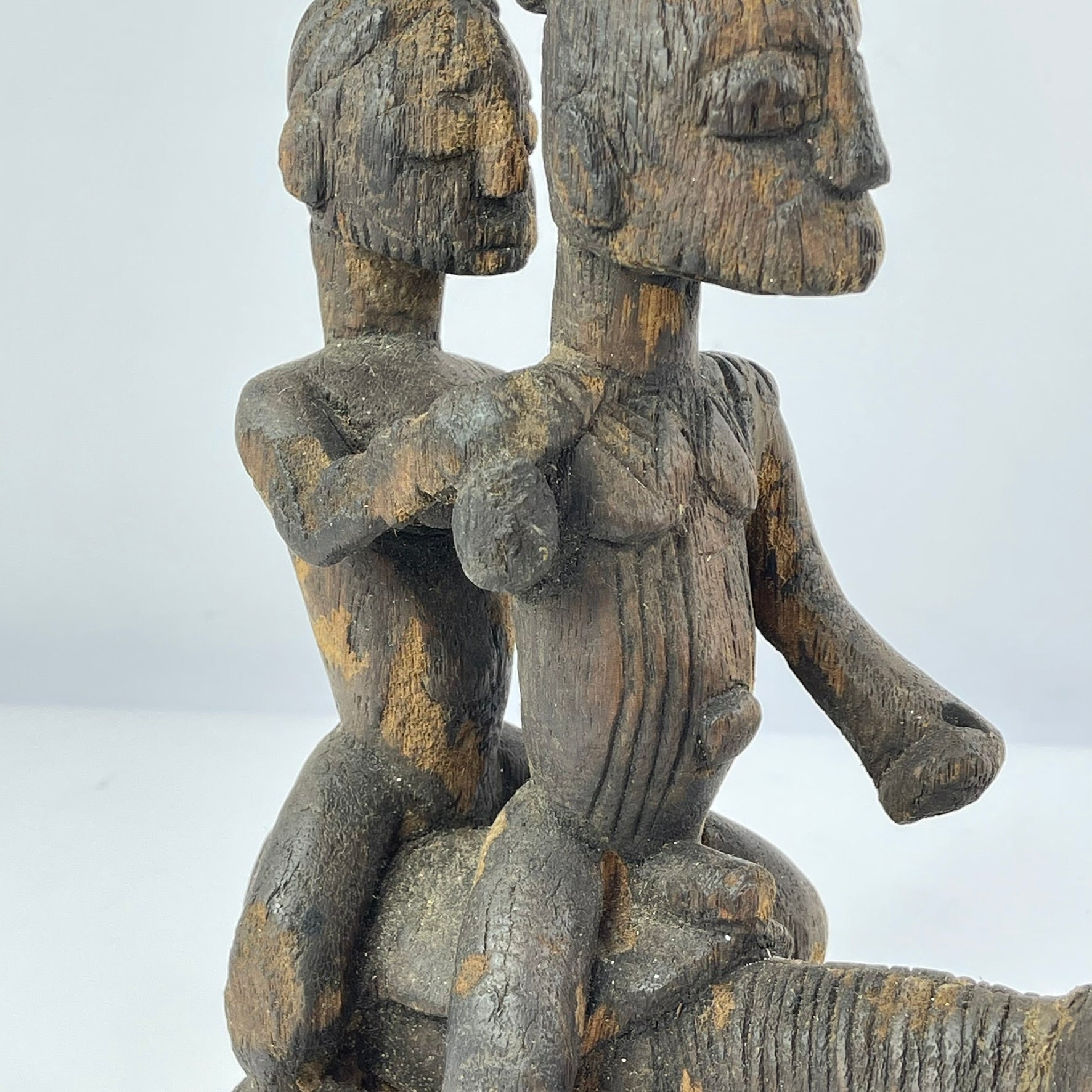 Sculptural works attributed to the Eloyi are relatively rare and are often characterized by compact, expressive forms, attenuated proportions, and schematic facial features. Figures frequently appear in dynamic groupings that may reference social relationships, ritual performance, or symbolic authority, reflecting the close integration of art with spiritual and communal life.