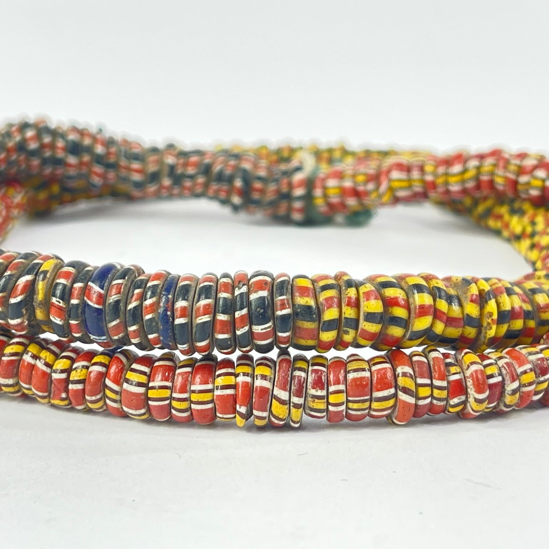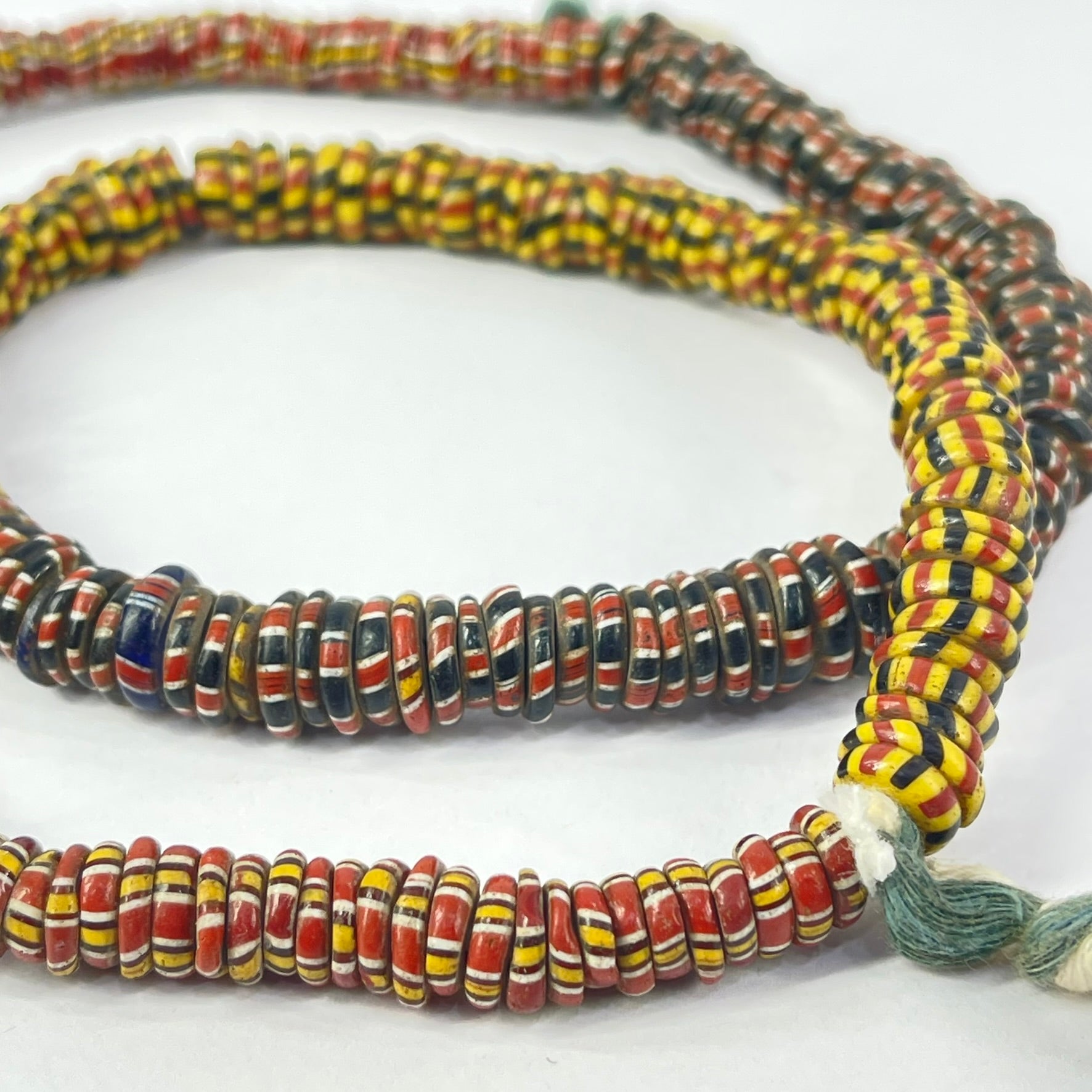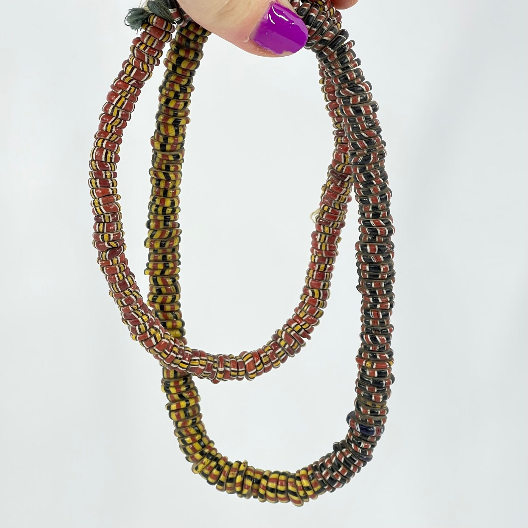 A strand of mixed Venetian trade beads is a fascinating collection of diverse colors, shapes, and patterns, each bead telling a unique story of craftsmanship and trade. Includes Aja slices, Green Chevrons, Yellow Jackets and more.