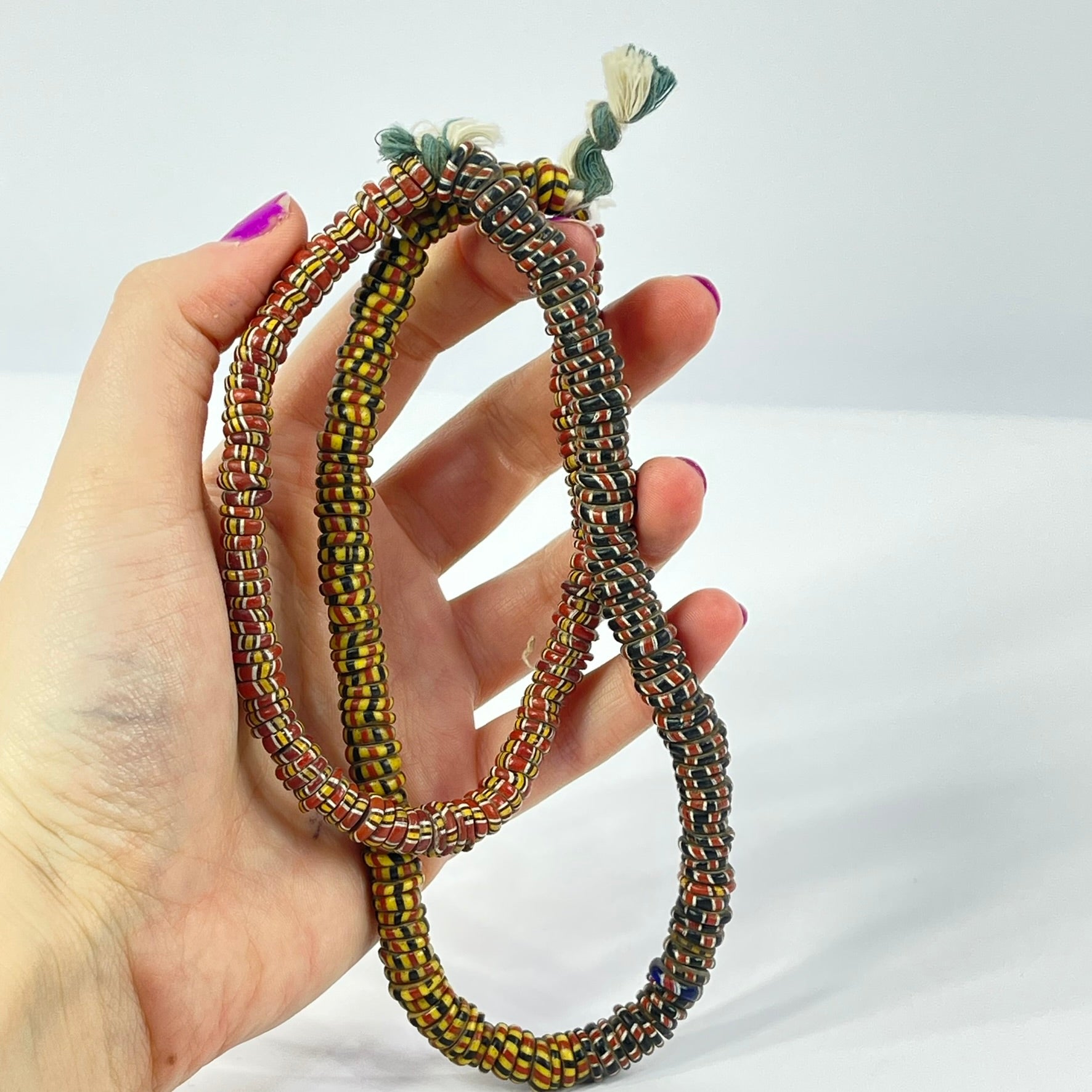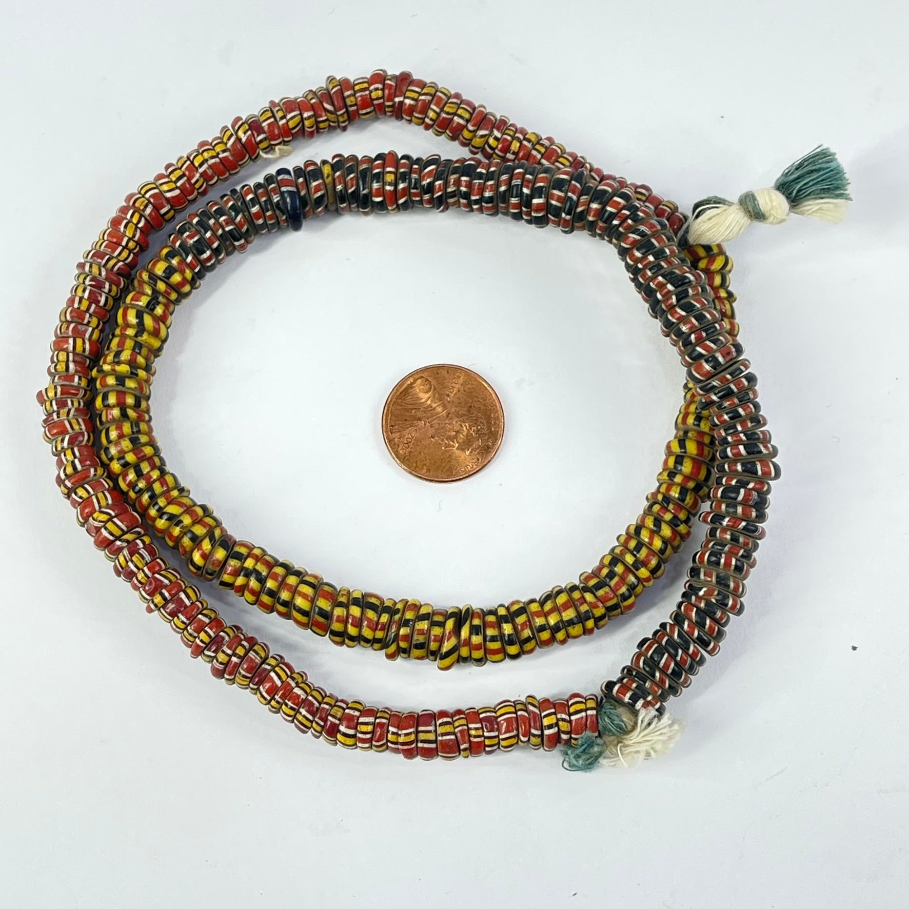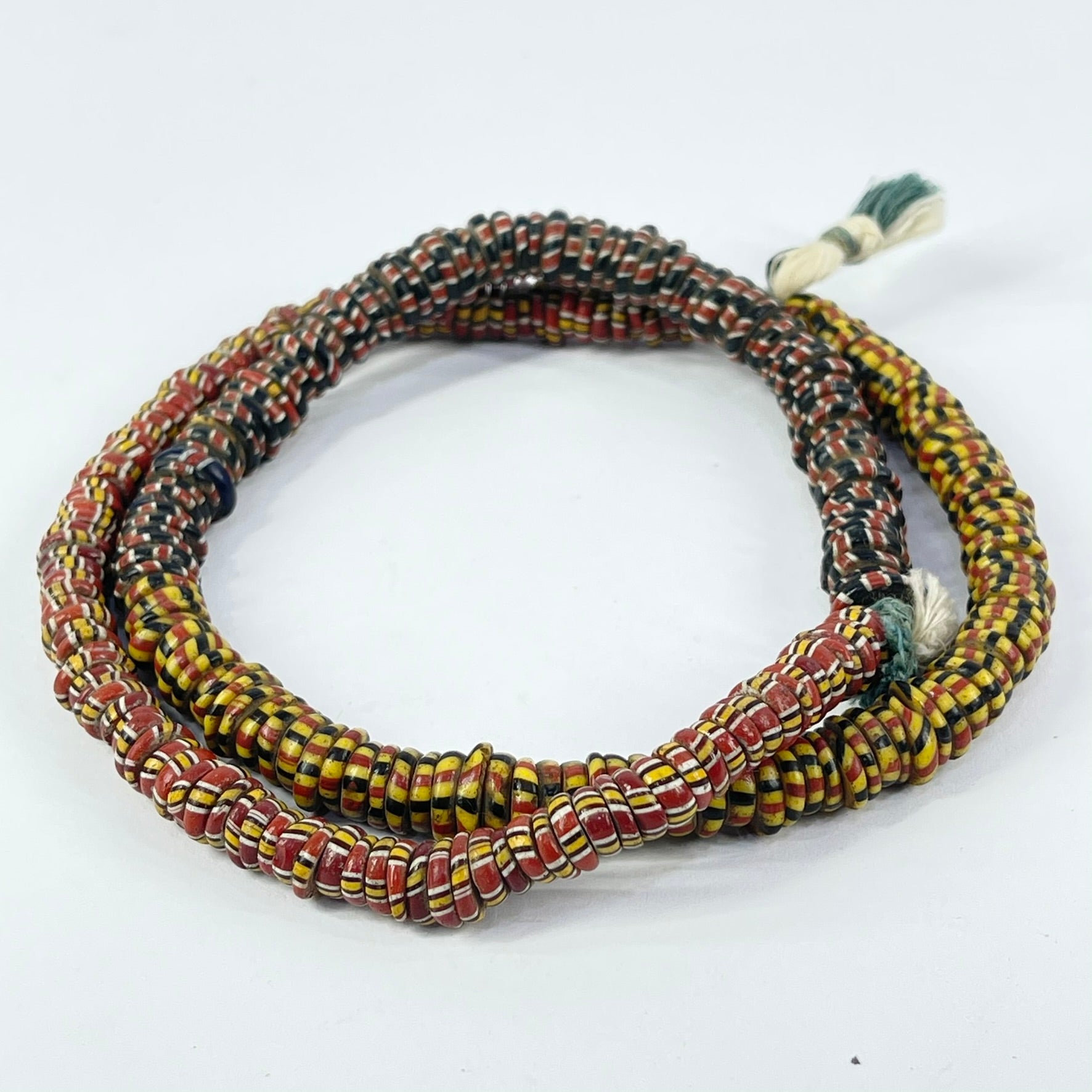 A strand of mixed Venetian trade beads is a fascinating collection of diverse colors, shapes, and patterns, each bead telling a unique story of craftsmanship and trade. Includes Aja slices, Green Chevrons, Yellow Jackets and more.