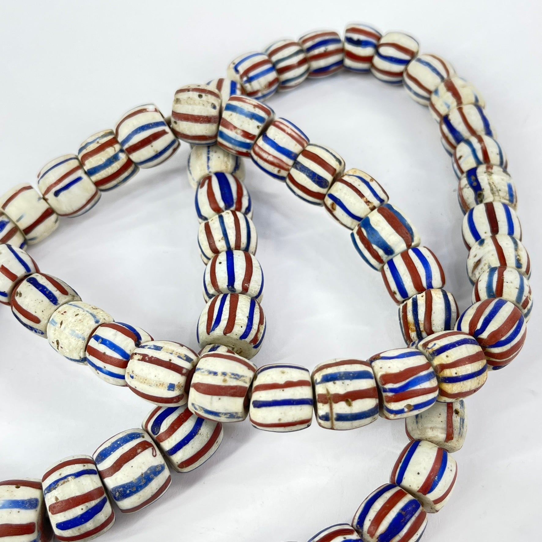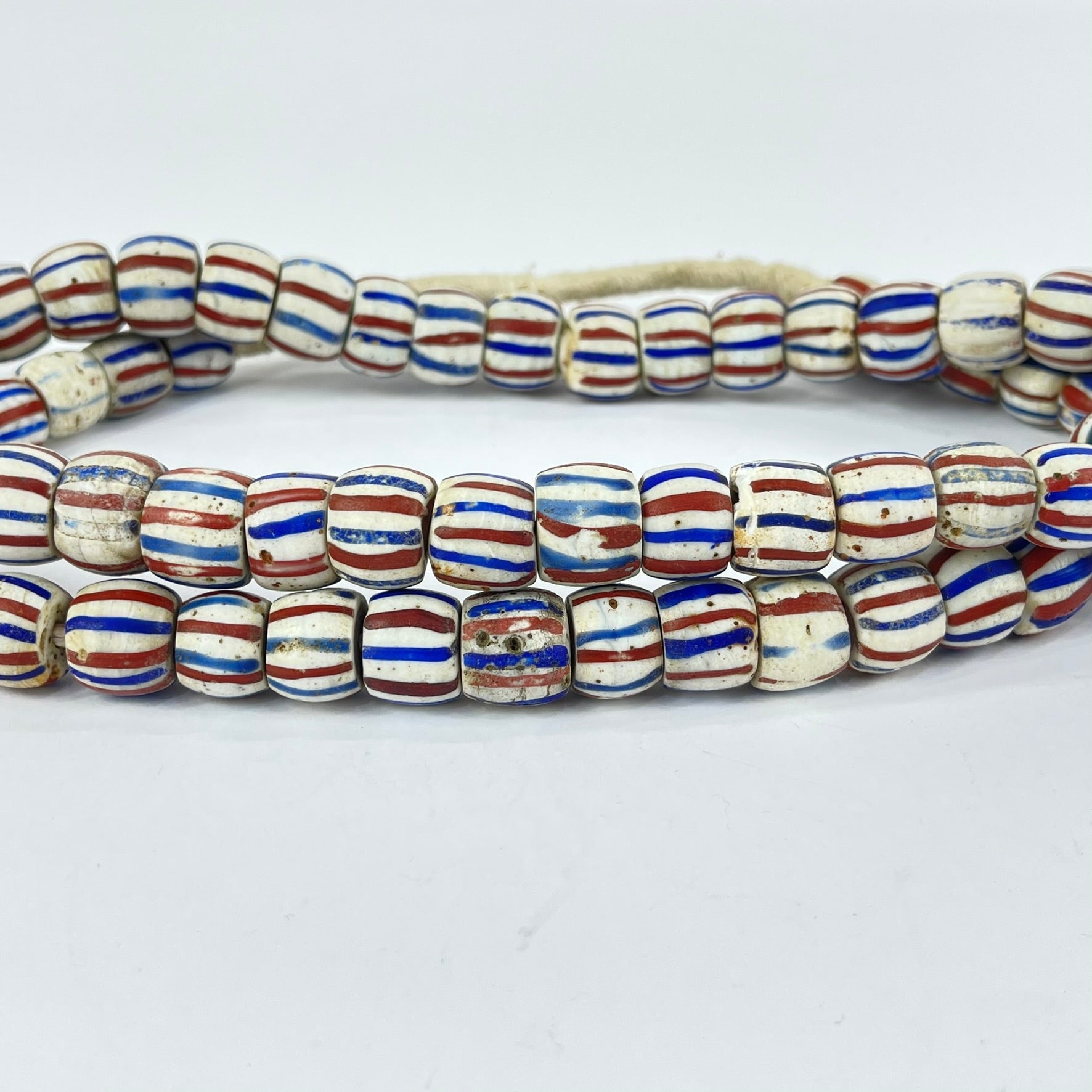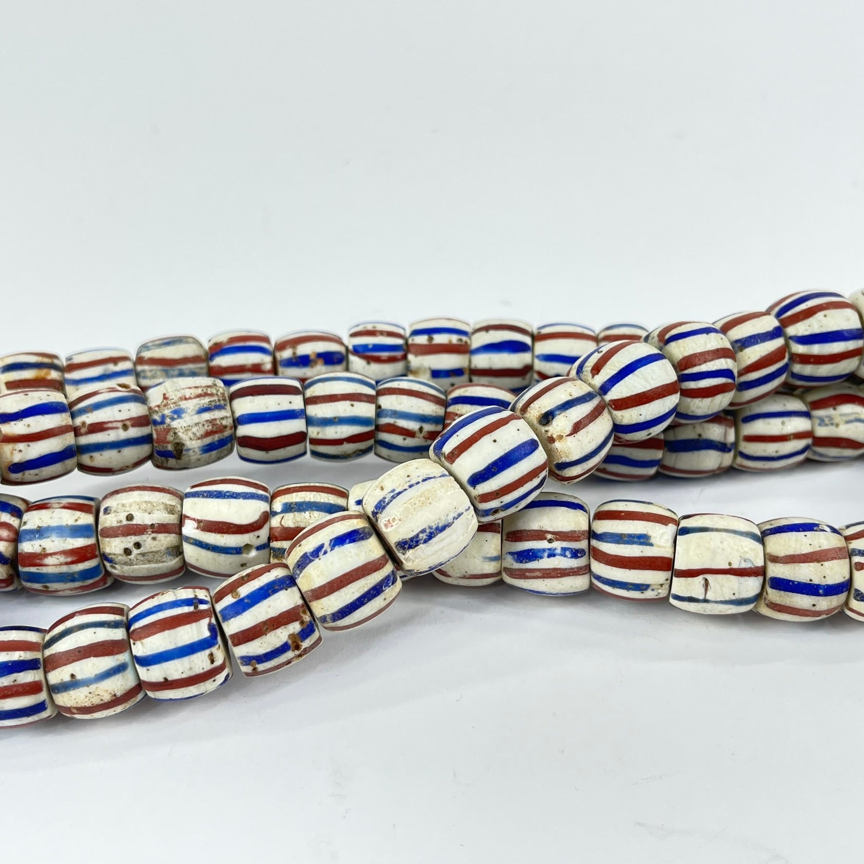 "Trade Beads" refer to beads primarily produced in Venice, Bohemia, and other European countries from the late 1400s to the early 1900s, traded in Africa and the Americas. The peak of this trade occurred from the mid-1800s to the early 1900s, with the Venetians dominating production. J.F. Sick and Co. and Moses Lewin Levin played significant roles as bead brokers/importers. The beads gained renewed popularity in the late 1960s when exported from Africa to the U.S. and Europe. The term "Trade Beads" became widely used, and they were also known as "Love Beads" during the Hippie era. As demand grew, specific names like "Russian Blues" and "Dutch Donuts" emerged, contributing to the beads' collectability. Today, these beads are highly sought after, with some styles becoming rarer as African traders venture deeper into the continent to find them.