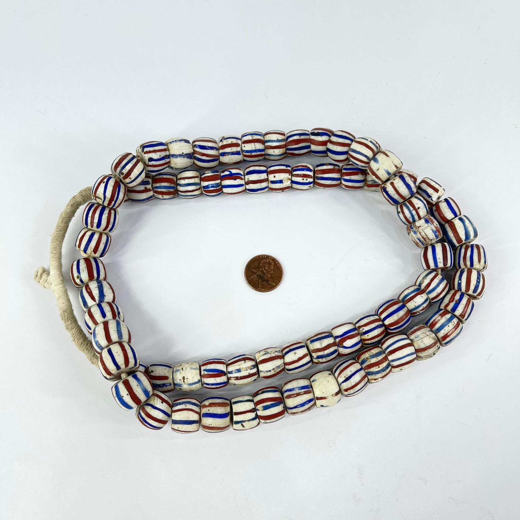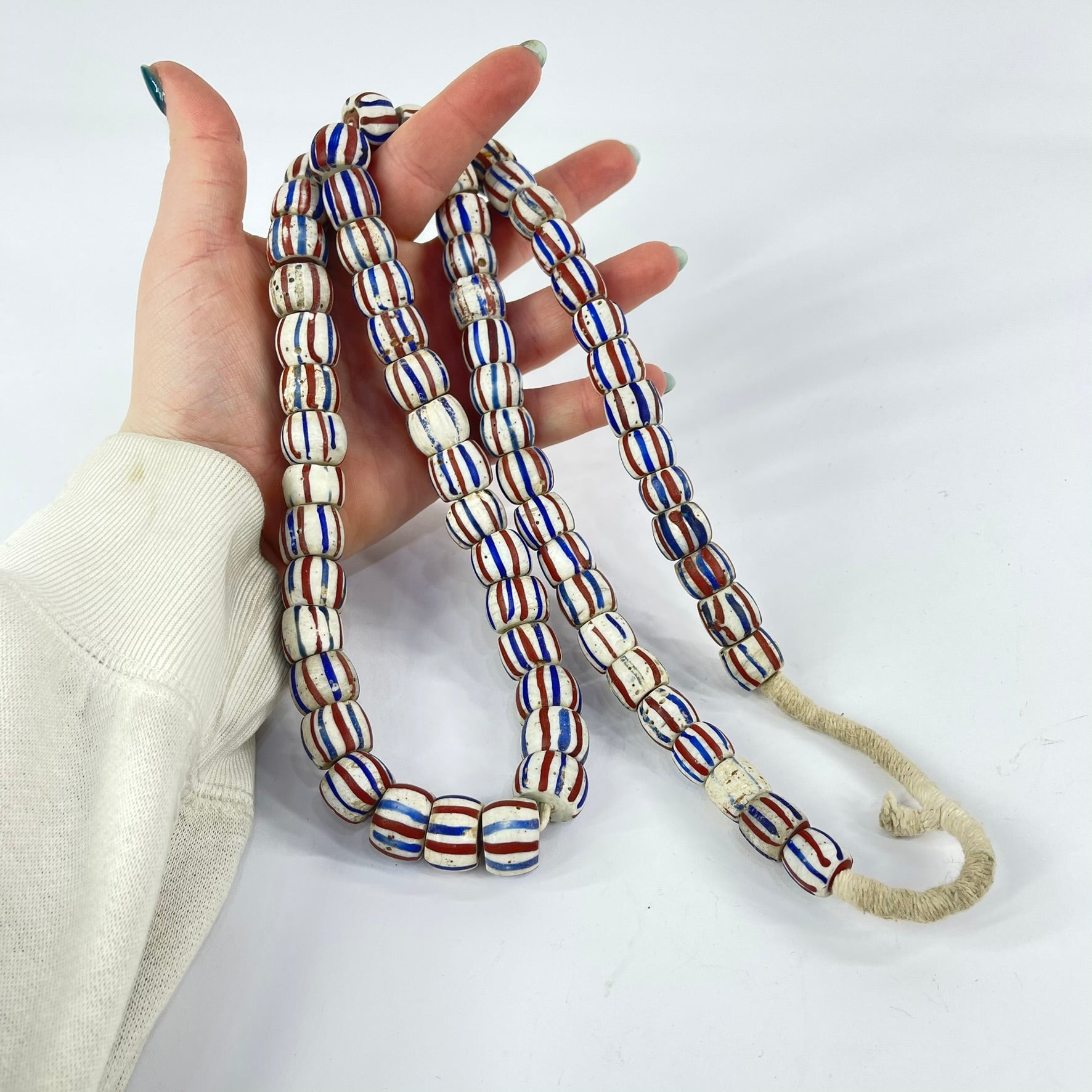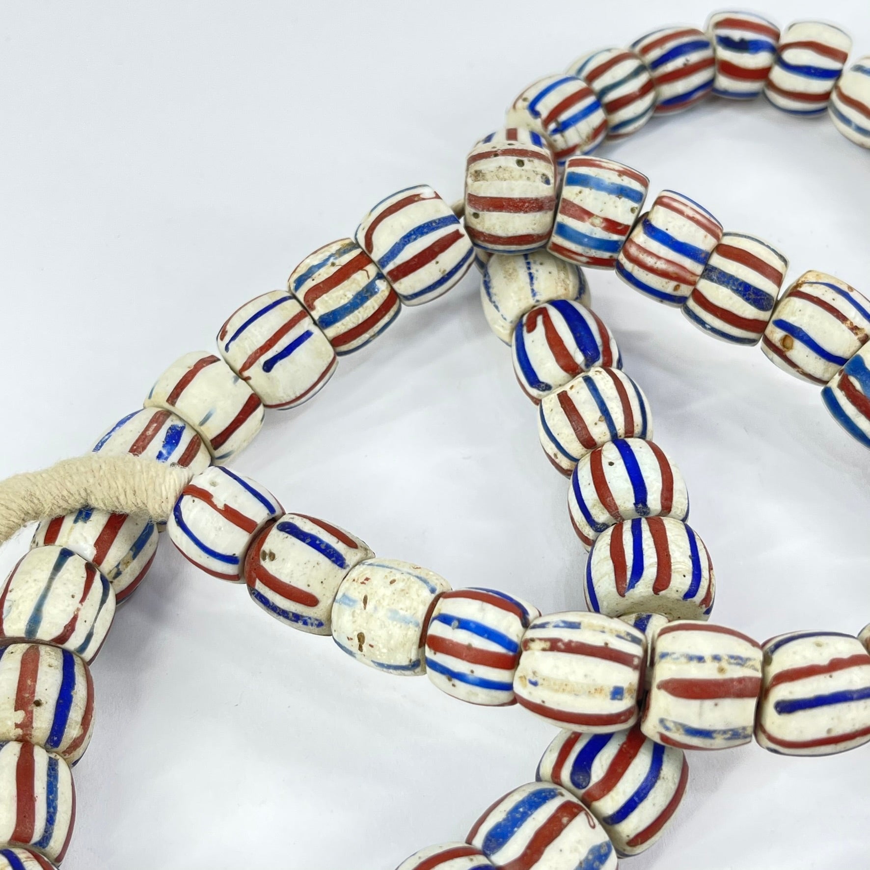 "Trade Beads" refer to beads primarily produced in Venice, Bohemia, and other European countries from the late 1400s to the early 1900s, traded in Africa and the Americas. The peak of this trade occurred from the mid-1800s to the early 1900s, with the Venetians dominating production. J.F. Sick and Co. and Moses Lewin Levin played significant roles as bead brokers/importers. The beads gained renewed popularity in the late 1960s when exported from Africa to the U.S. and Europe. The term "Trade Beads" became widely used, and they were also known as "Love Beads" during the Hippie era. As demand grew, specific names like "Russian Blues" and "Dutch Donuts" emerged, contributing to the beads' collectability. Today, these beads are highly sought after, with some styles becoming rarer as African traders venture deeper into the continent to find them.