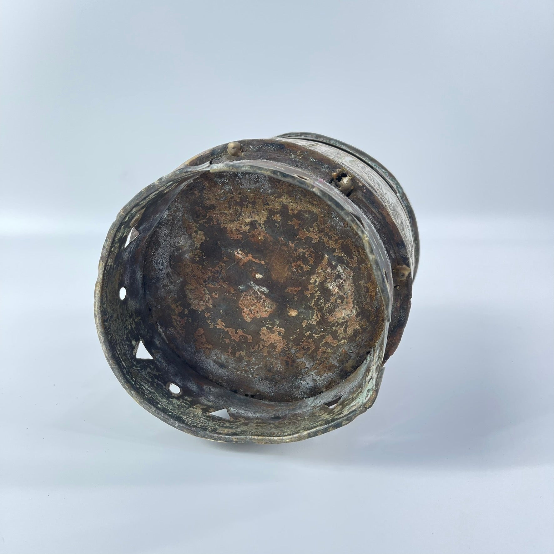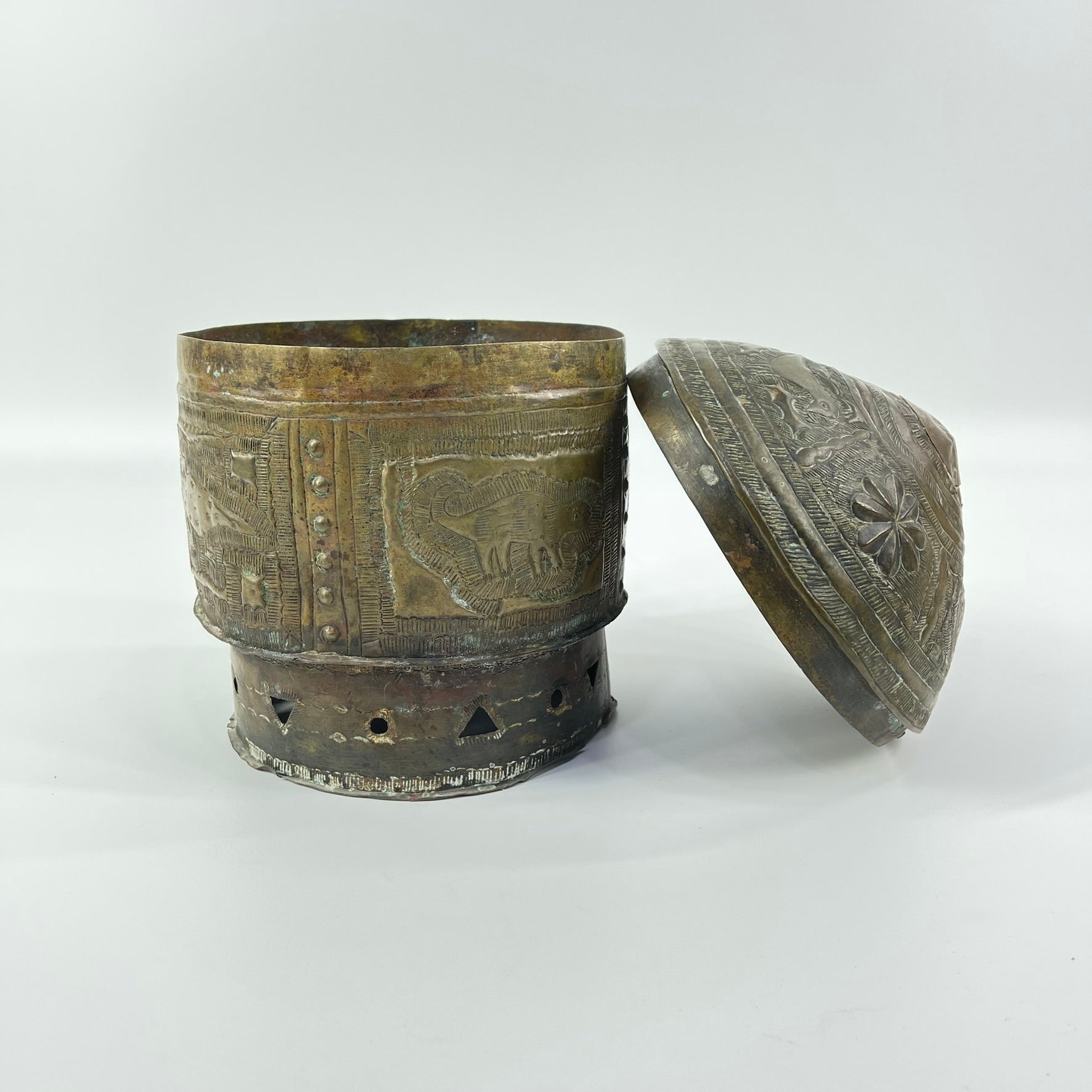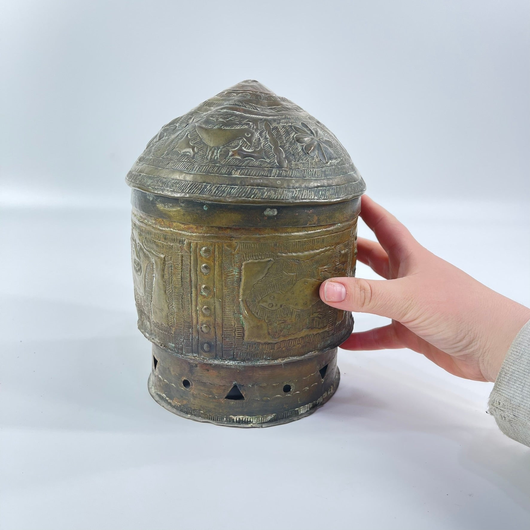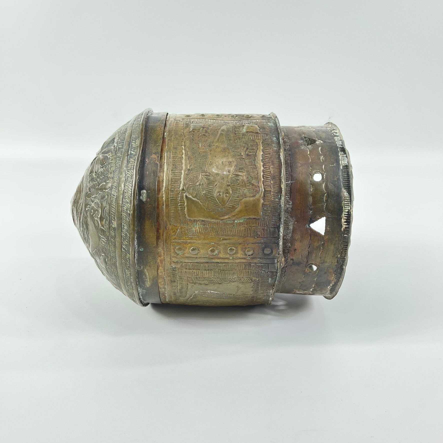 This beautiful embossed brass Forowa Box was crafted by a skilled Asante artist in the late 19th or early 20th Century. Its cylindrical shape and conical lid resemble traditional granaries, making it ideal for storing shea butter.