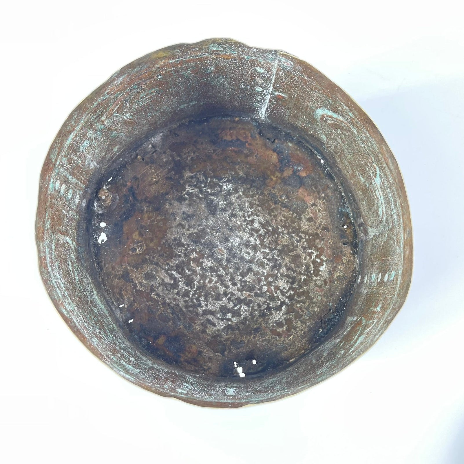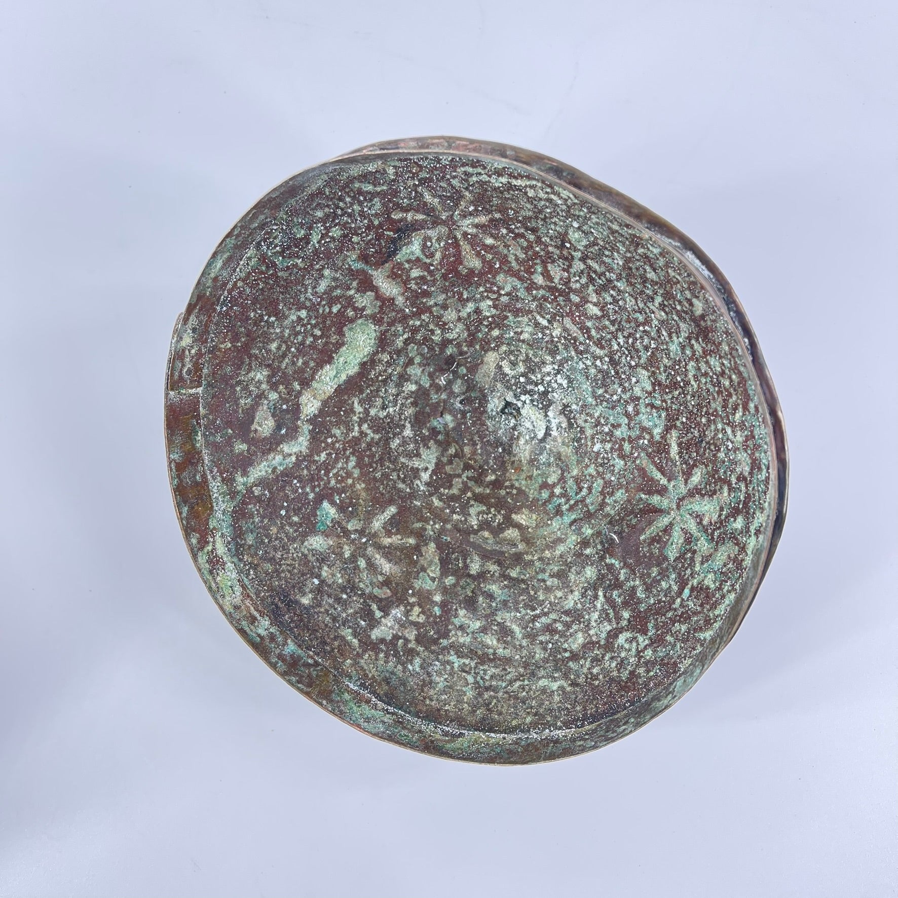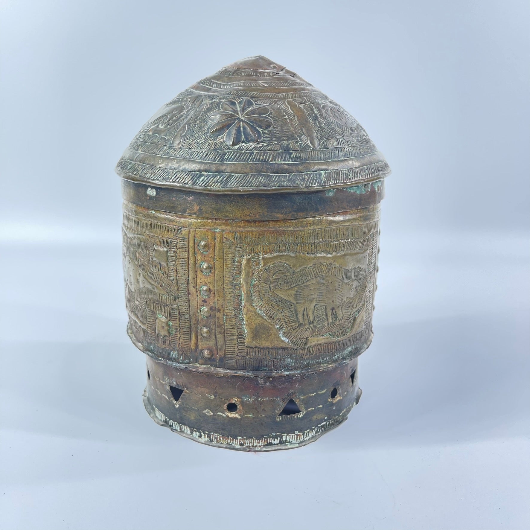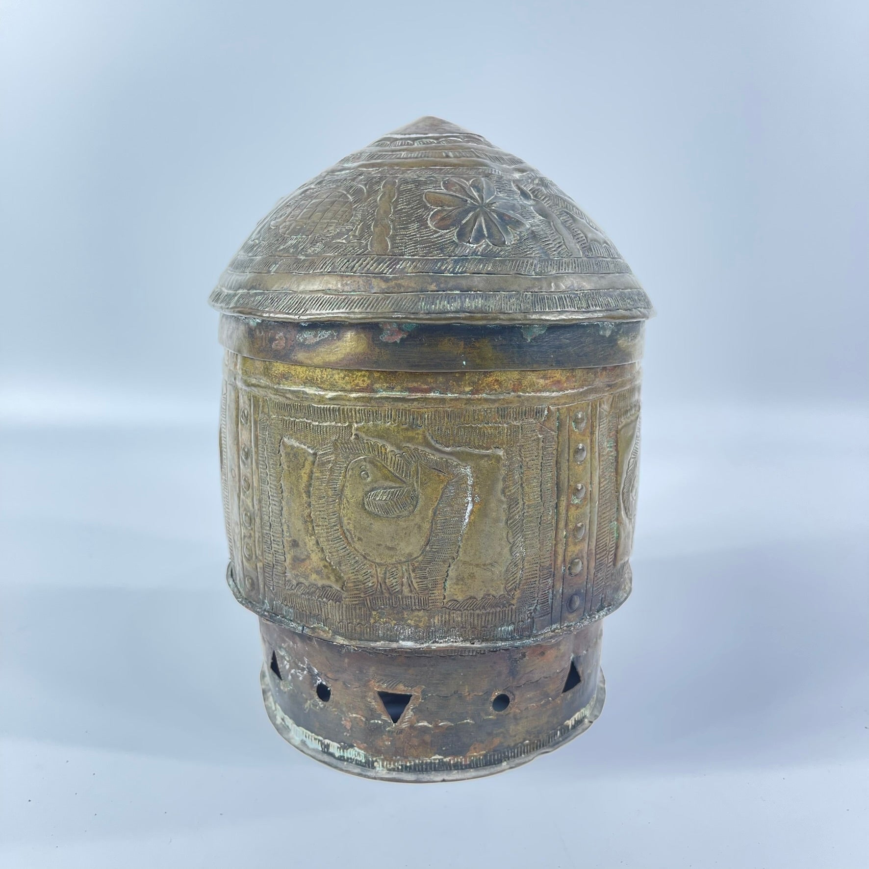 This beautiful embossed brass Forowa Box was crafted by a skilled Asante artist in the late 19th or early 20th Century. Its cylindrical shape and conical lid resemble traditional granaries, making it ideal for storing shea butter.