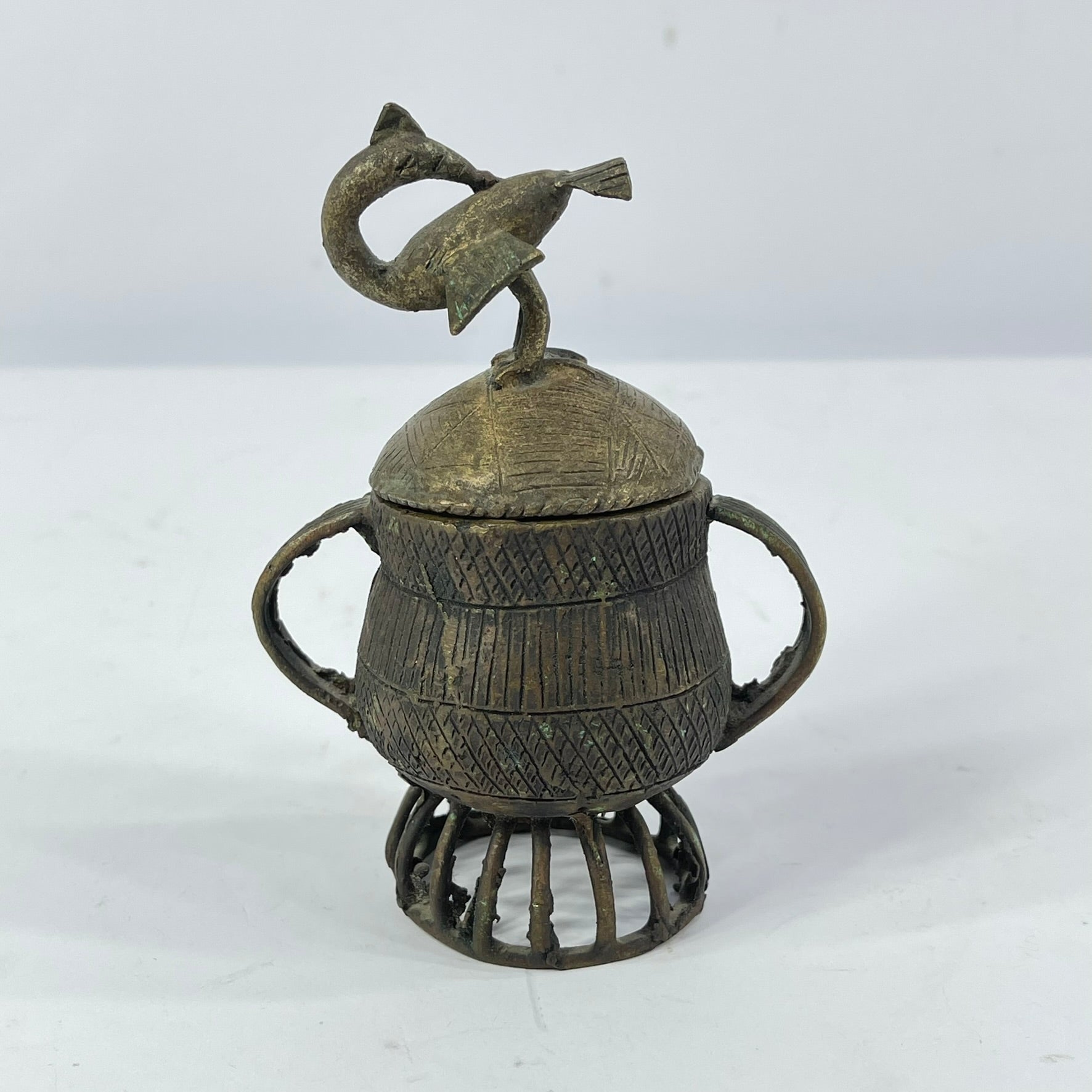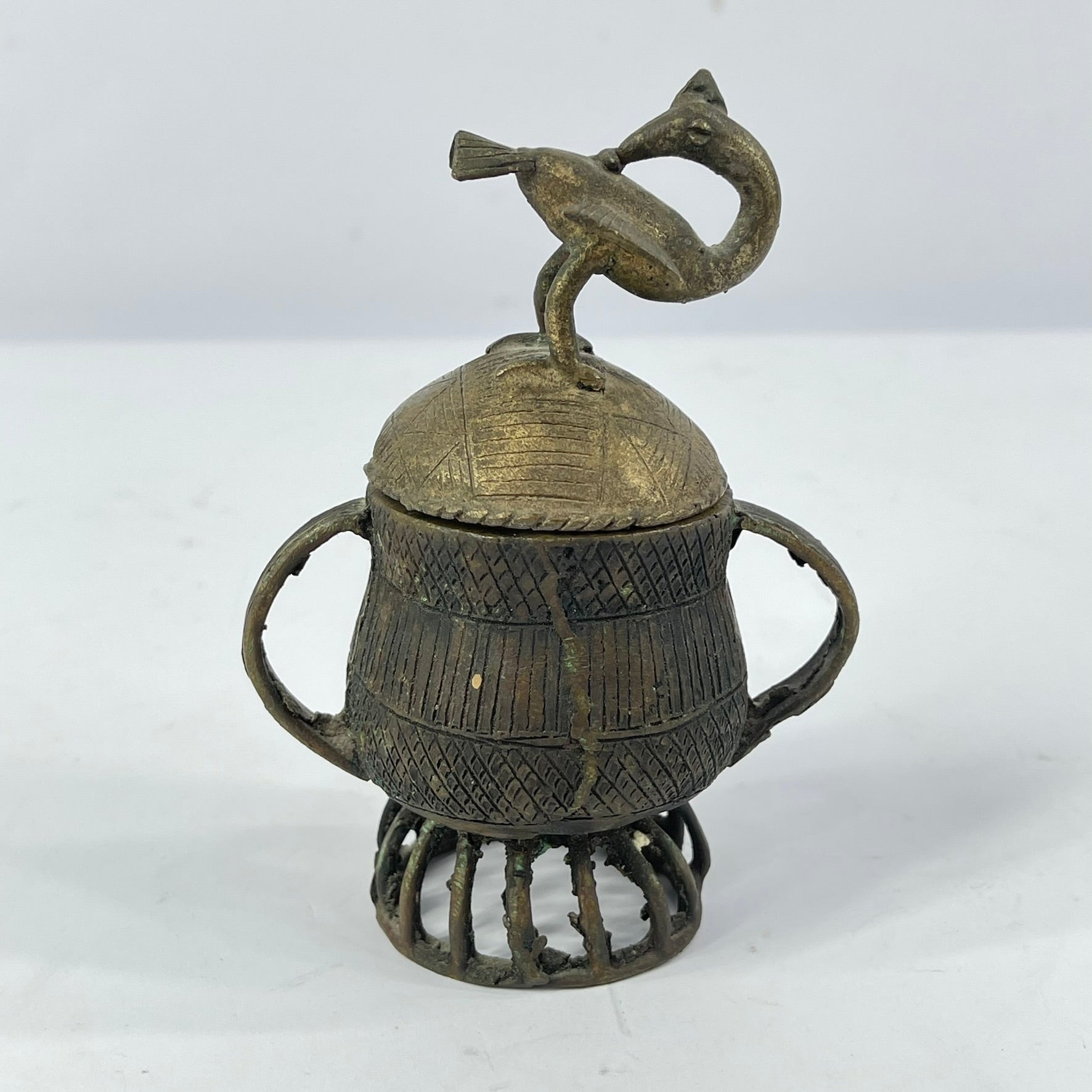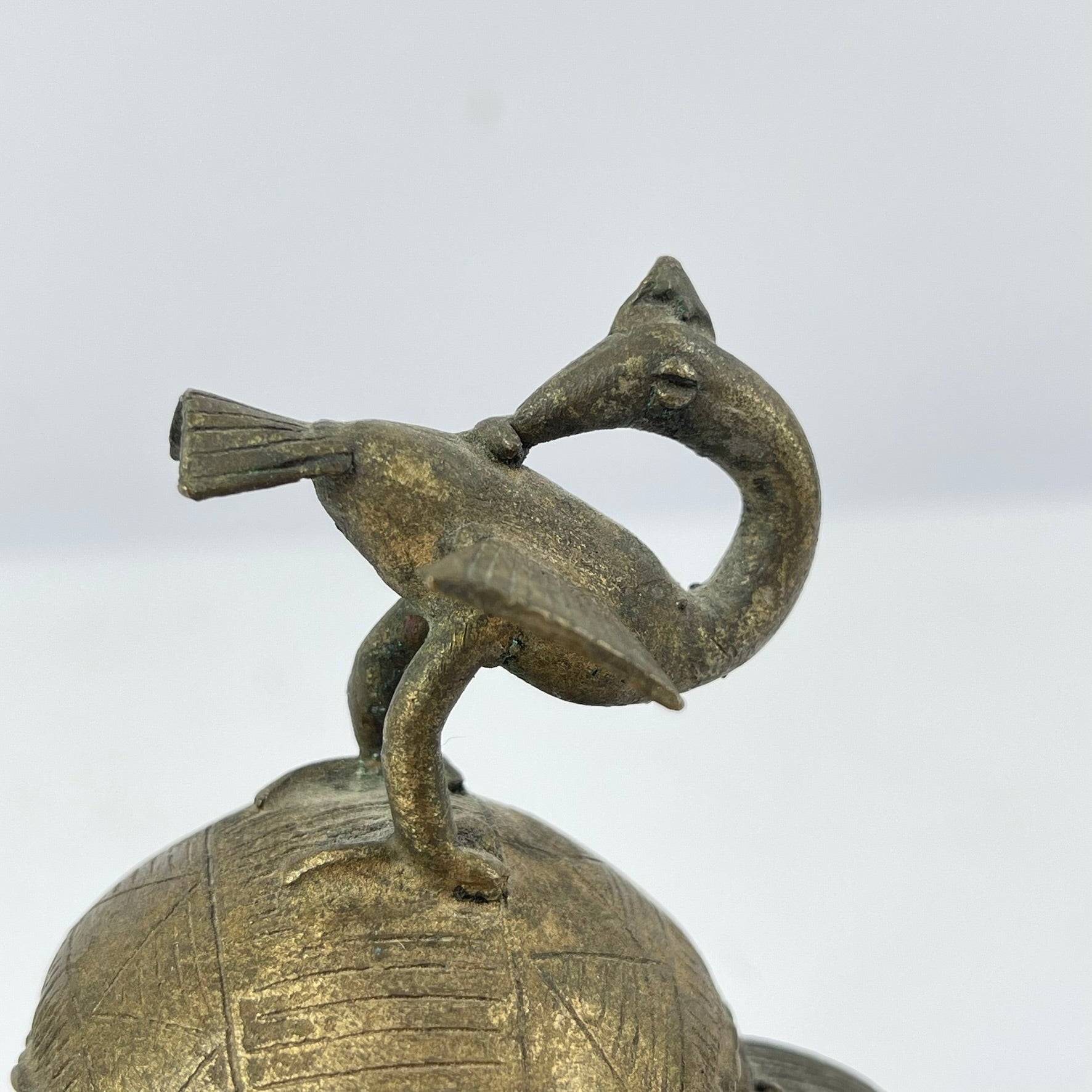 The small lidded brass bowl represents an intricate blend of artistry and commerce from centuries past, echoing the era when gold stood at the heart of global trade along the West African Coast. Though not made of gold themselves, these boxes, along with sculpted brass weights, played a pivotal role in the exchange of gold dust, the currency of the Asante, Fante, Baule, and other Akan peoples in Ghana until the late 19th century. Gold, known as "sika," was measured on scales called "nsania" using these finely crafted weights called abrammo. These weights varied from geometric patterns to elaborate figurative designs, cast using the lost-wax technique, serving not only to facilitate trade but also to embody Akan cultural values and proverbs. These boxes were invaluable, providing a secure storage space for gold dust, essential for both sellers and buyers participating in trade.