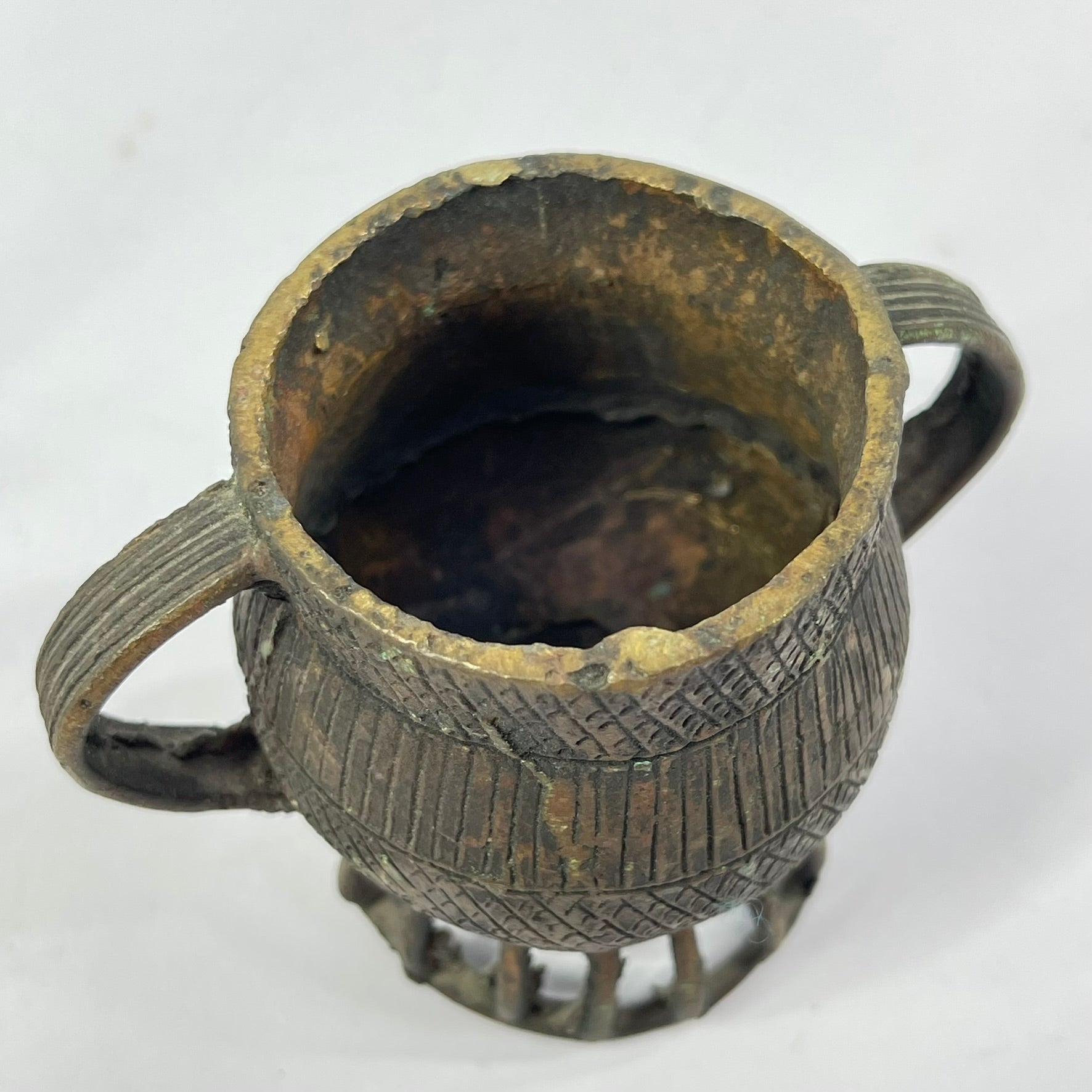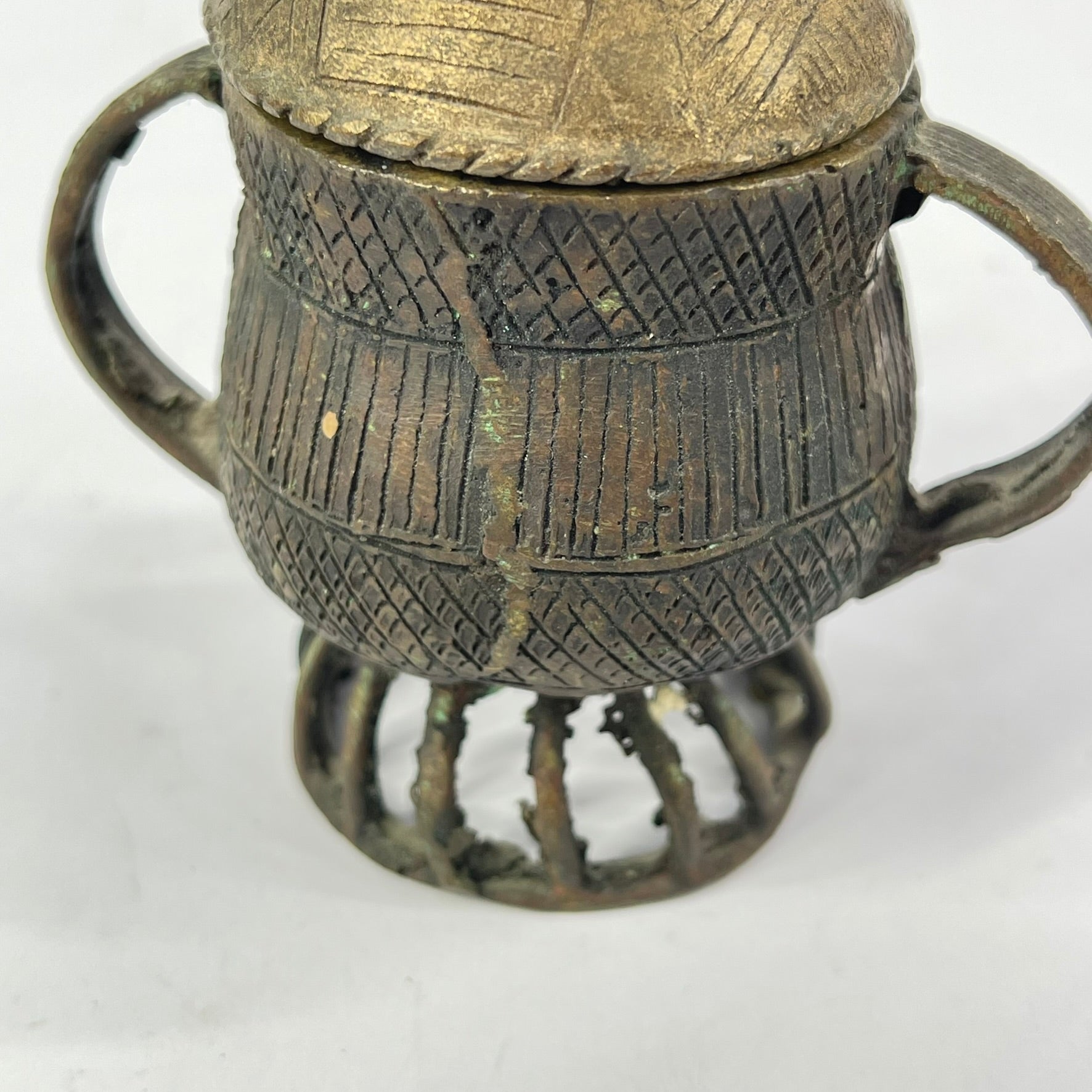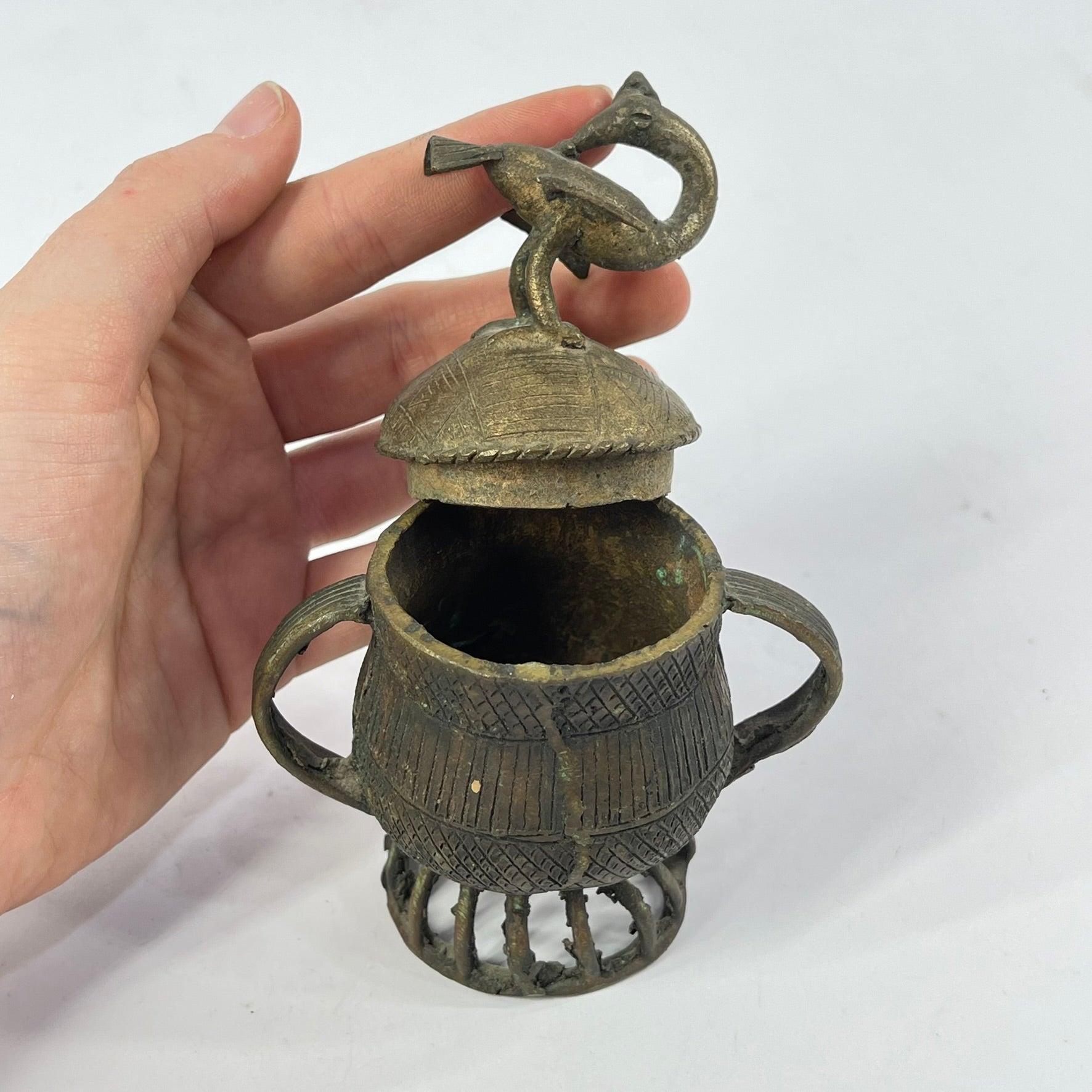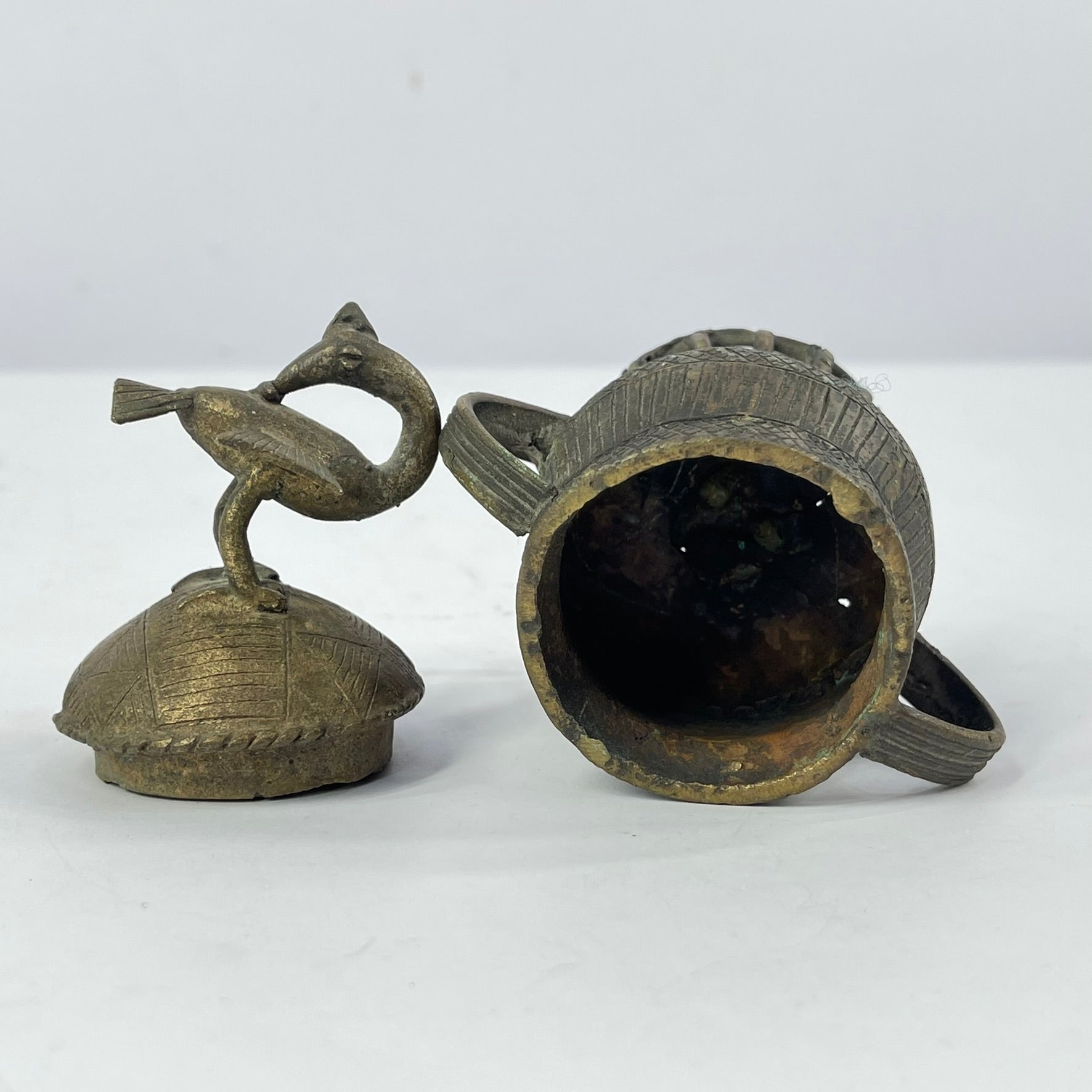 The small lidded brass bowl represents an intricate blend of artistry and commerce from centuries past, echoing the era when gold stood at the heart of global trade along the West African Coast. Though not made of gold themselves, these boxes, along with sculpted brass weights, played a pivotal role in the exchange of gold dust, the currency of the Asante, Fante, Baule, and other Akan peoples in Ghana until the late 19th century. Gold, known as "sika," was measured on scales called "nsania" using these finely crafted weights called abrammo. These weights varied from geometric patterns to elaborate figurative designs, cast using the lost-wax technique, serving not only to facilitate trade but also to embody Akan cultural values and proverbs. These boxes were invaluable, providing a secure storage space for gold dust, essential for both sellers and buyers participating in trade.