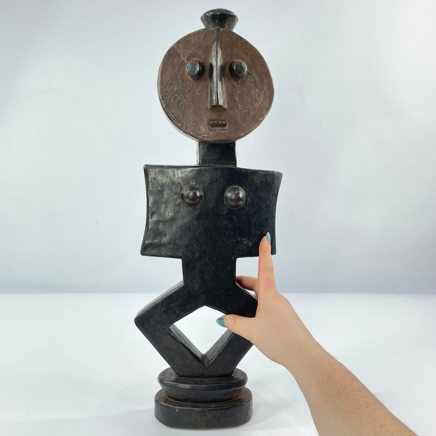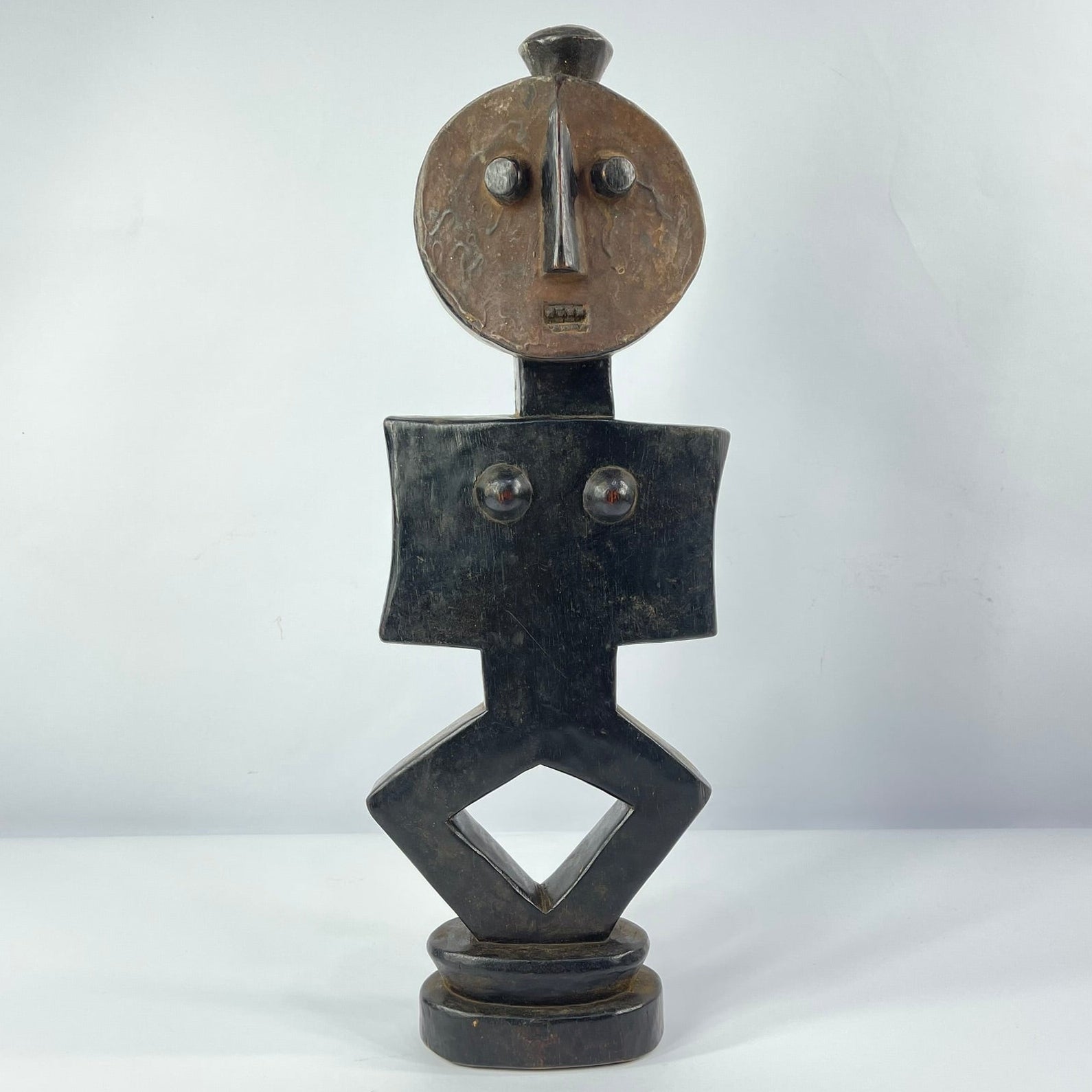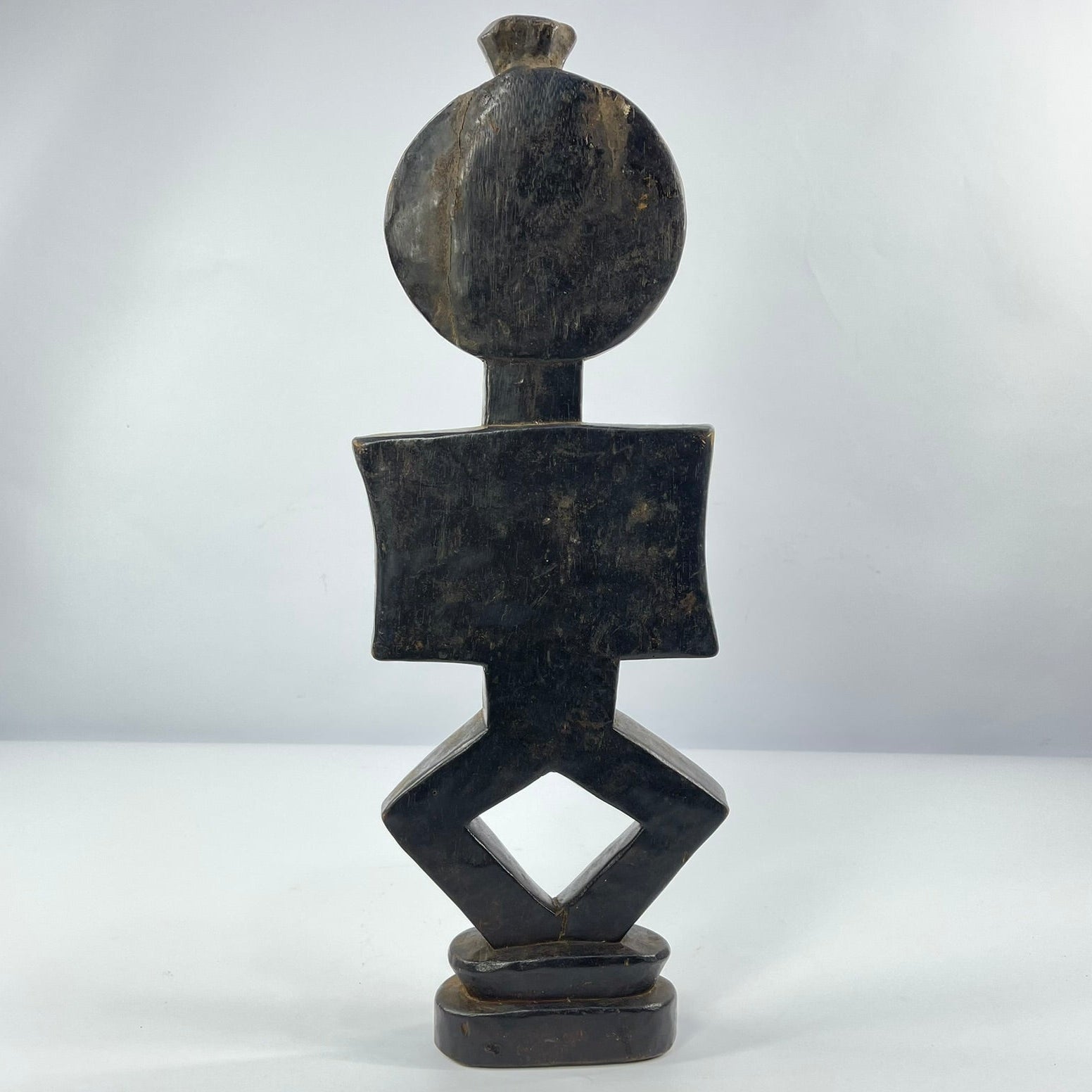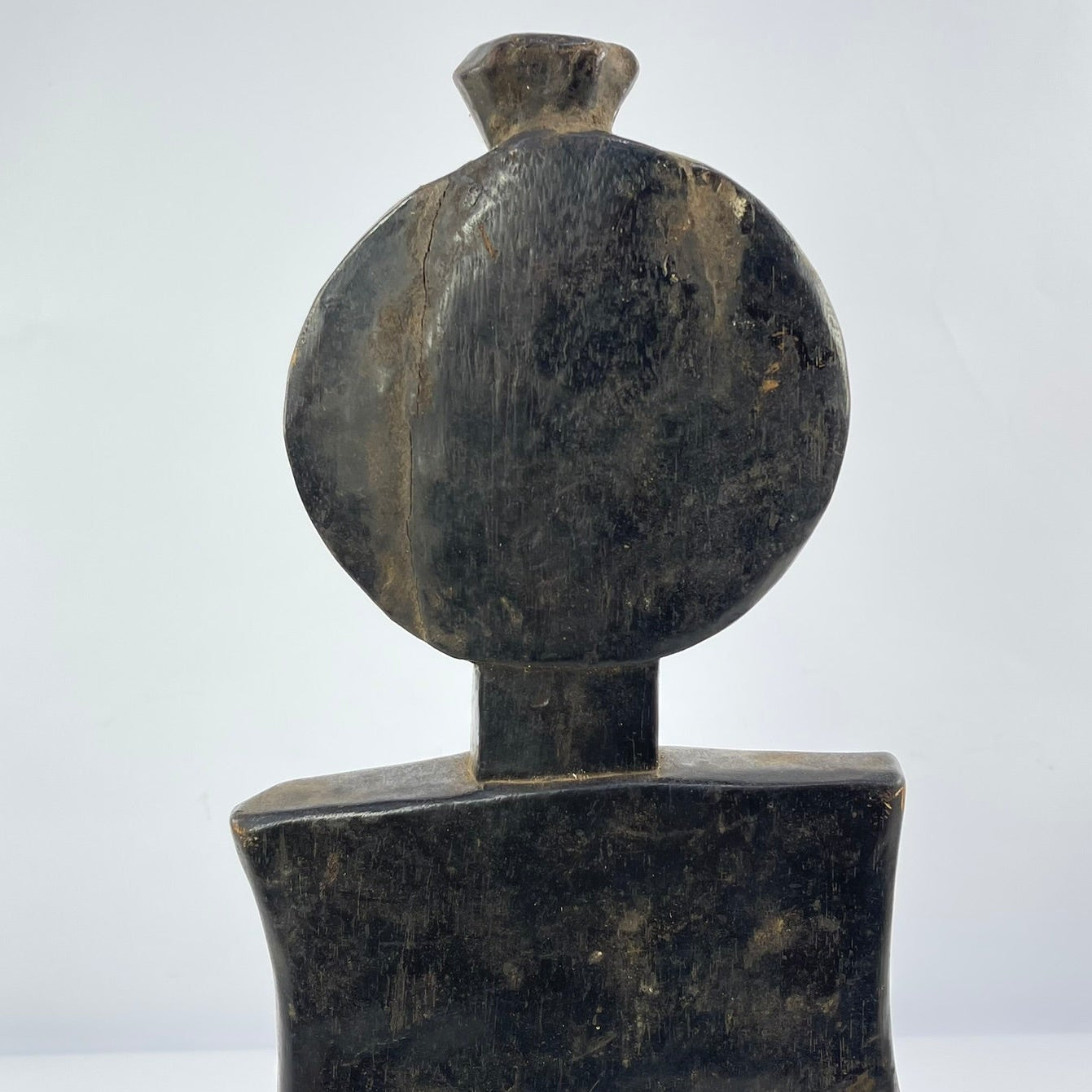 The surface displays a deep, dark patina with areas of wear consistent with age and handling, enhancing the piece’s sculptural presence. Mounted on a circular base, the figure stands confidently as a strong example of Central African abstract figuration.