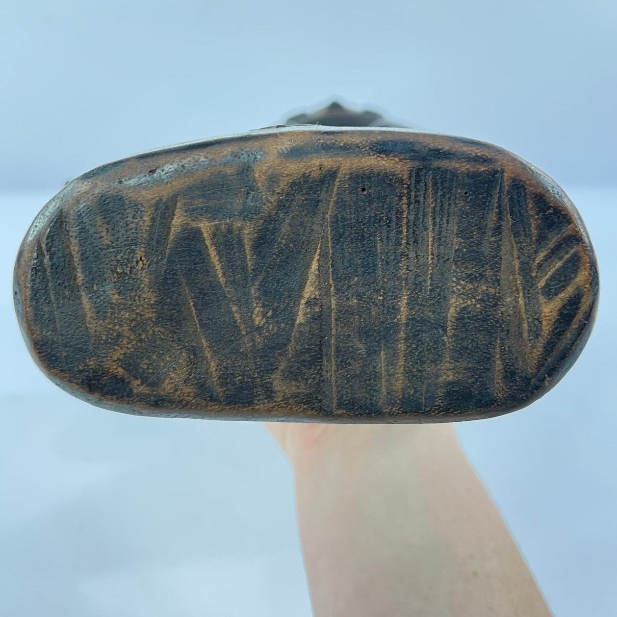 This sculptural wooden figure is attributed to the Azande (Zande) people of the Democratic Republic of the Congo, a culture known for its bold geometric forms and symbolic abstraction. The Azande inhabit regions spanning northeastern Congo and neighboring areas, where figural sculpture often served social, spiritual, or protective functions.