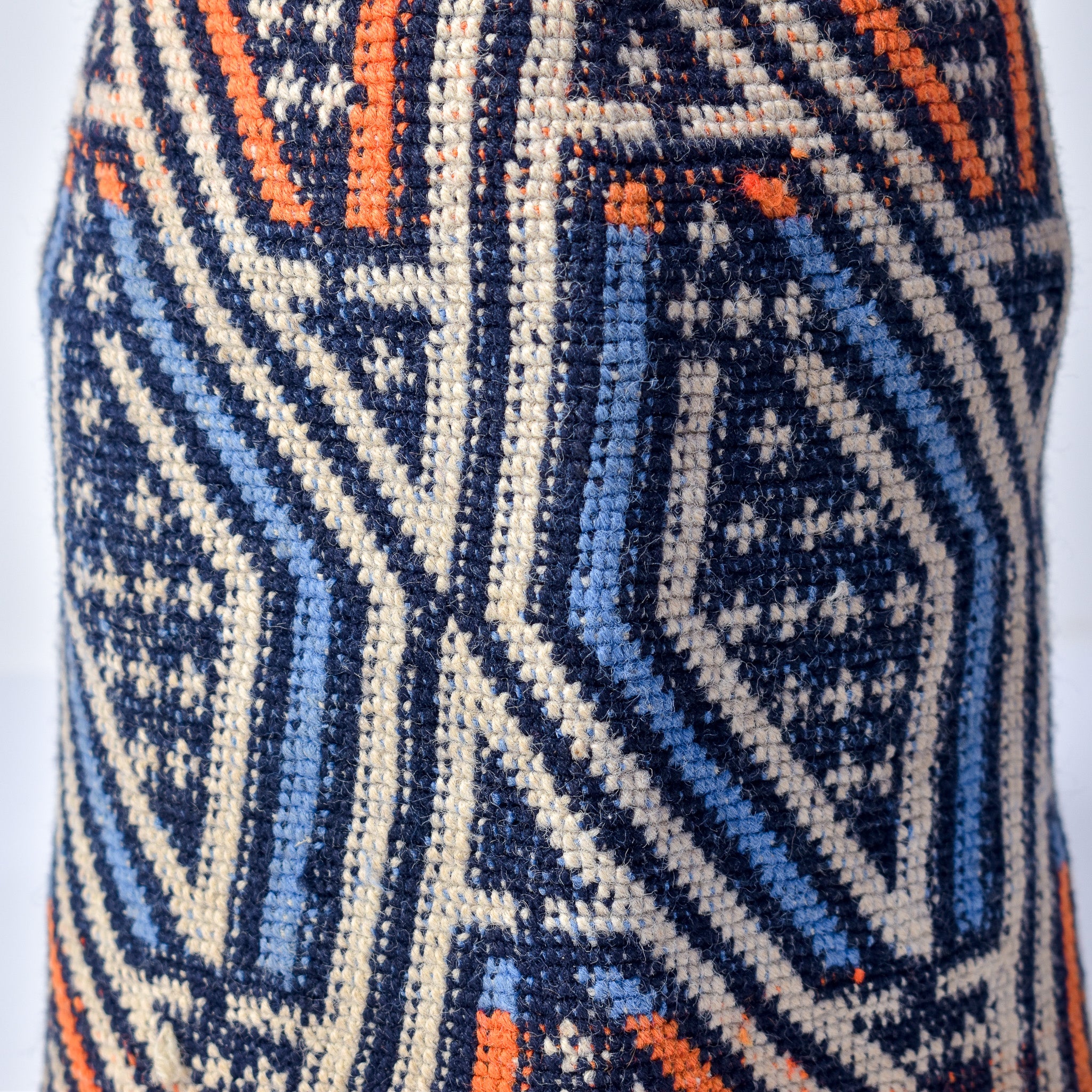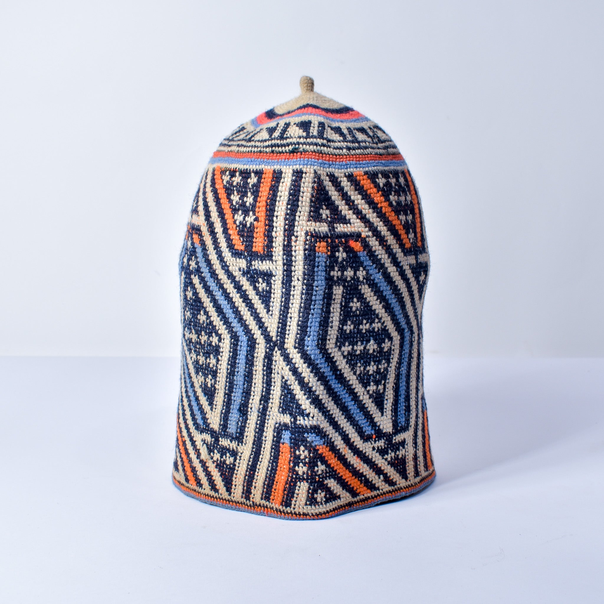 A beautifully designed cotton woven hat. In the Cameroon Grasslands region hats are made in a wide variety of media such as vegetable fiber, cotton, and feathers, and in different shapes. This one is made with cotton threads using a weave technique. Hats are part of prestigious regalia in the Cameroon grasslands. They are worn by men during special ceremonies. It is unimaginable to see a notable in an outfit without his hat. Rather than a simple accessory that could be an indication of the owner's social rank and status. These sculptural hats are sometimes represented on carved figures. This hat is in good condition.