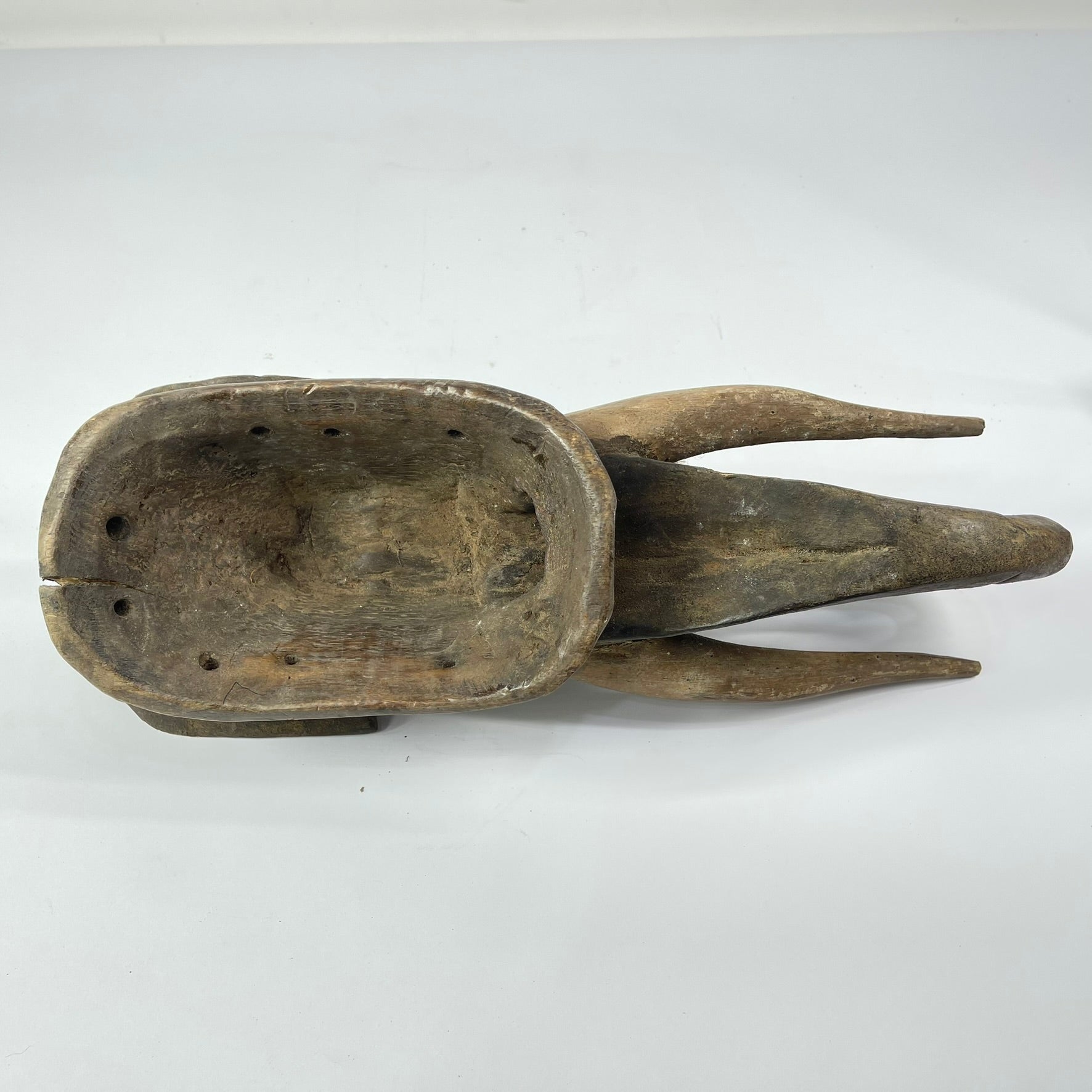 This well-carved example would have been worn during performances on the top of the head along with a loose costume made of cotton cloth and/or grasses. Baule animal masks were used during funerals, honoring senior men and former dancers of masks and to entertain the the village during a visit of an important guest. Though identified with the sacred forest and the men's society, they do not appear to have a well defined religious or ritual function. However, they serve to protect the village from external danger or war. In any case, they are not to be seen by women during their appearance. Some of the masks are blackened, while others are brightly painted with enamel paints.