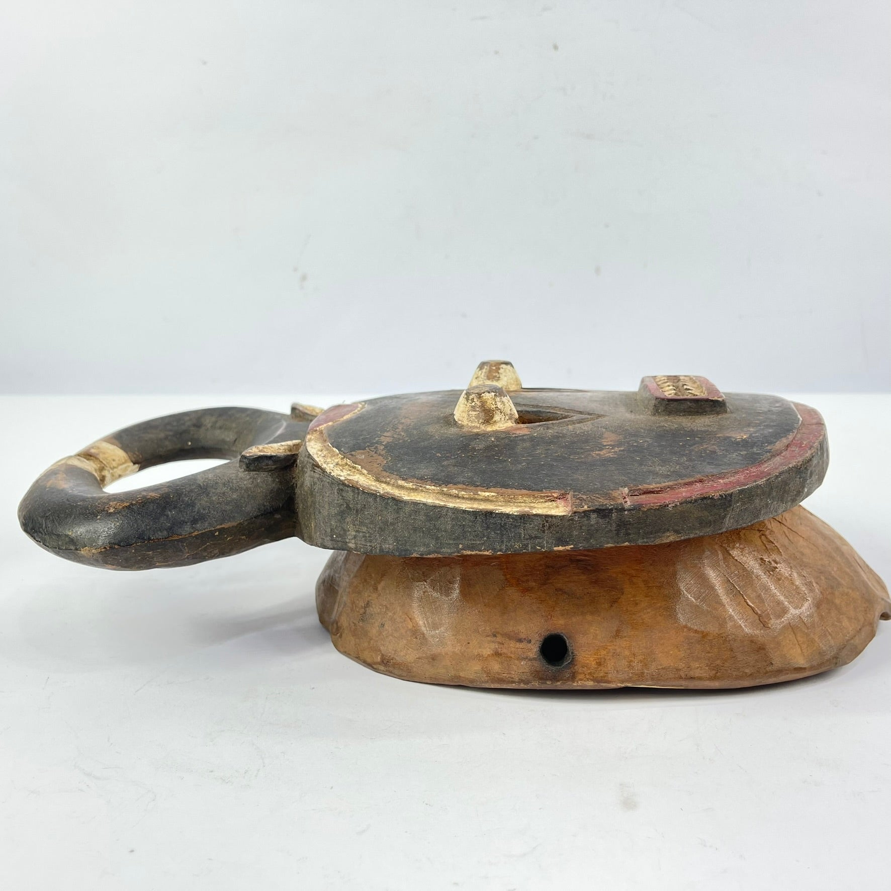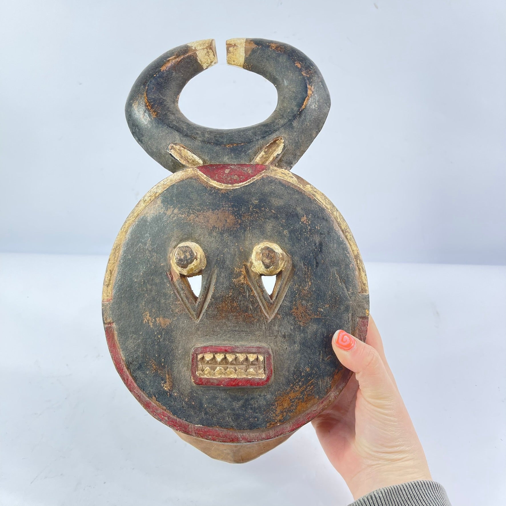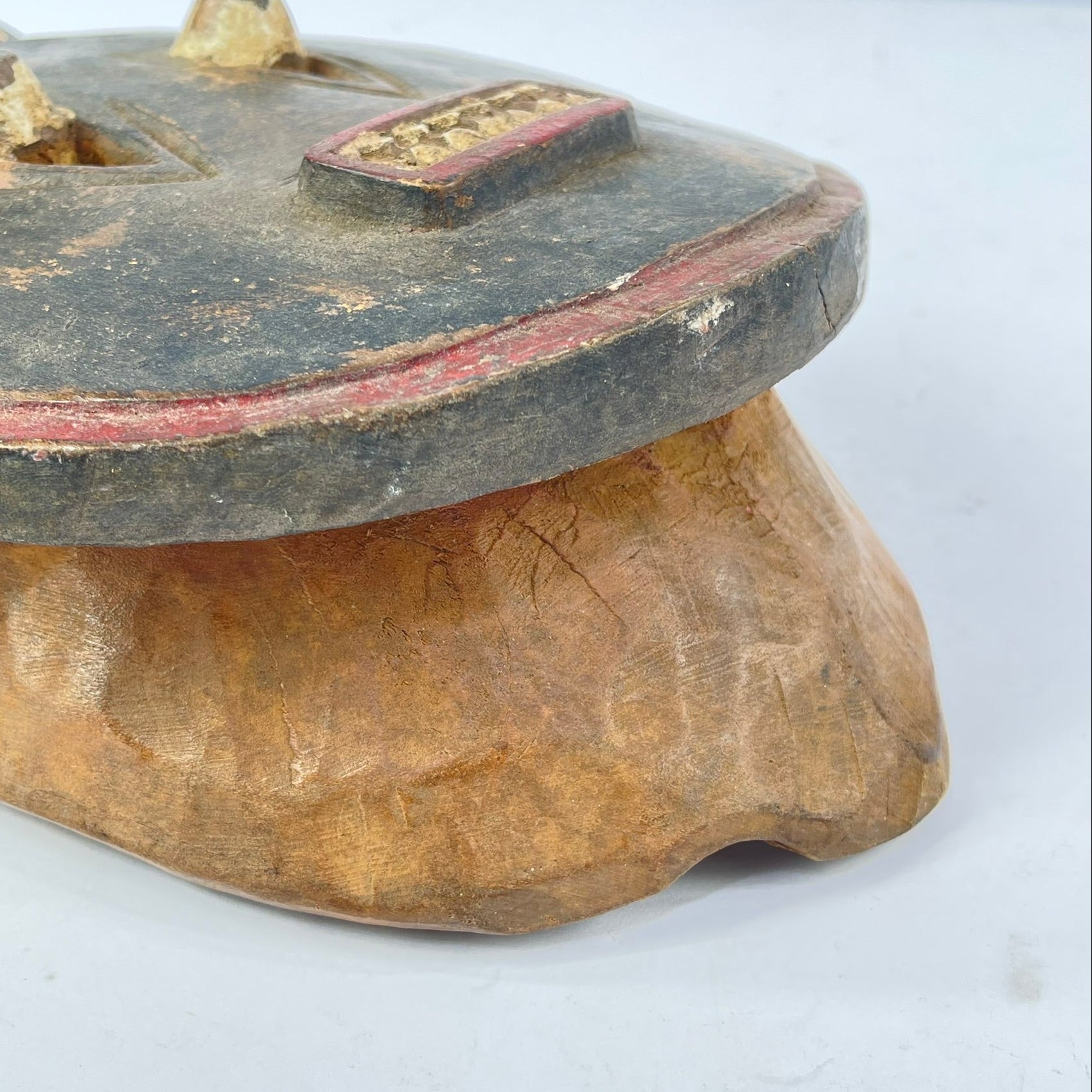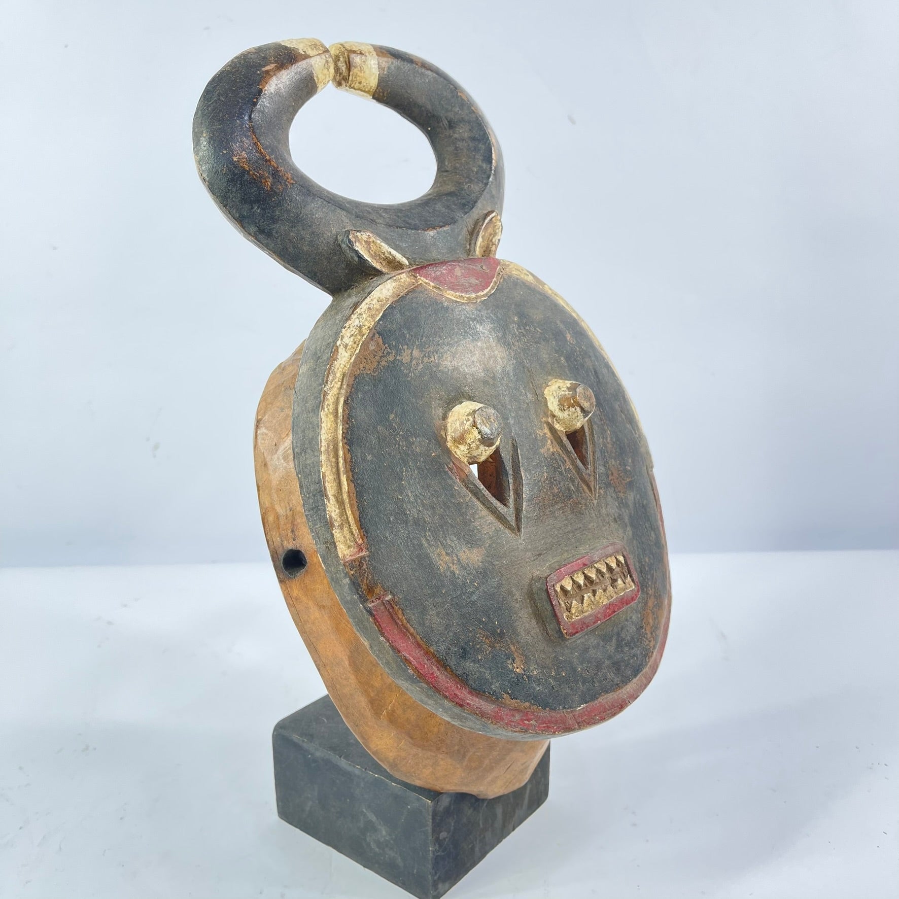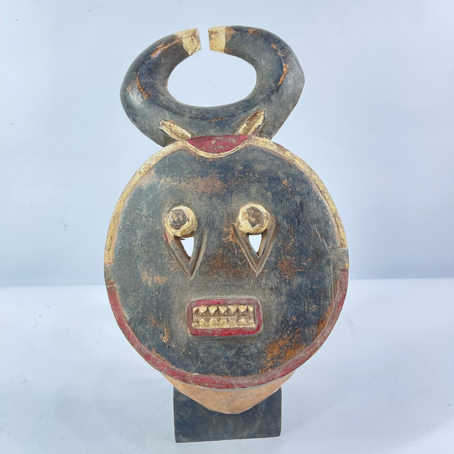 Typically symbolizing mythical animals within the Baule belief system, this Kplekple mask portrays an abstracted buffalo head with human-like facial features, characterized by slightly protruding eyes, horns projecting upwards, and a downward-pointing beard. Over time, its numerous repaintings, including the recent use of European-style enamel paints, have given it a glossy finish, reflecting its age and use. When worn, it would be complemented by a raffia costume, covering the lower section of the mask and extending below the waist, creating a visually striking representation of the enduring Baule tradition, continuously renewed through repainting to maintain its symbolic and visual significance.