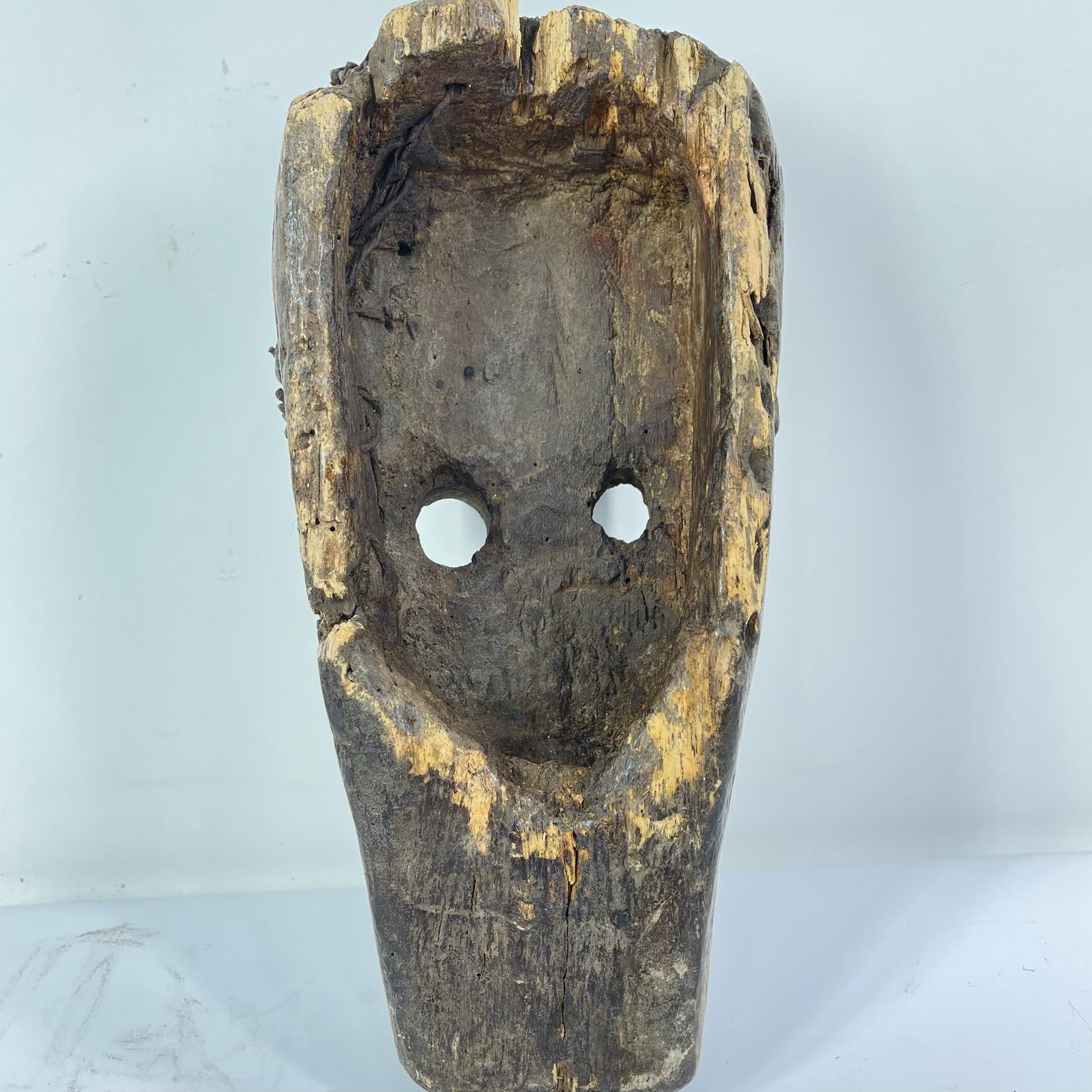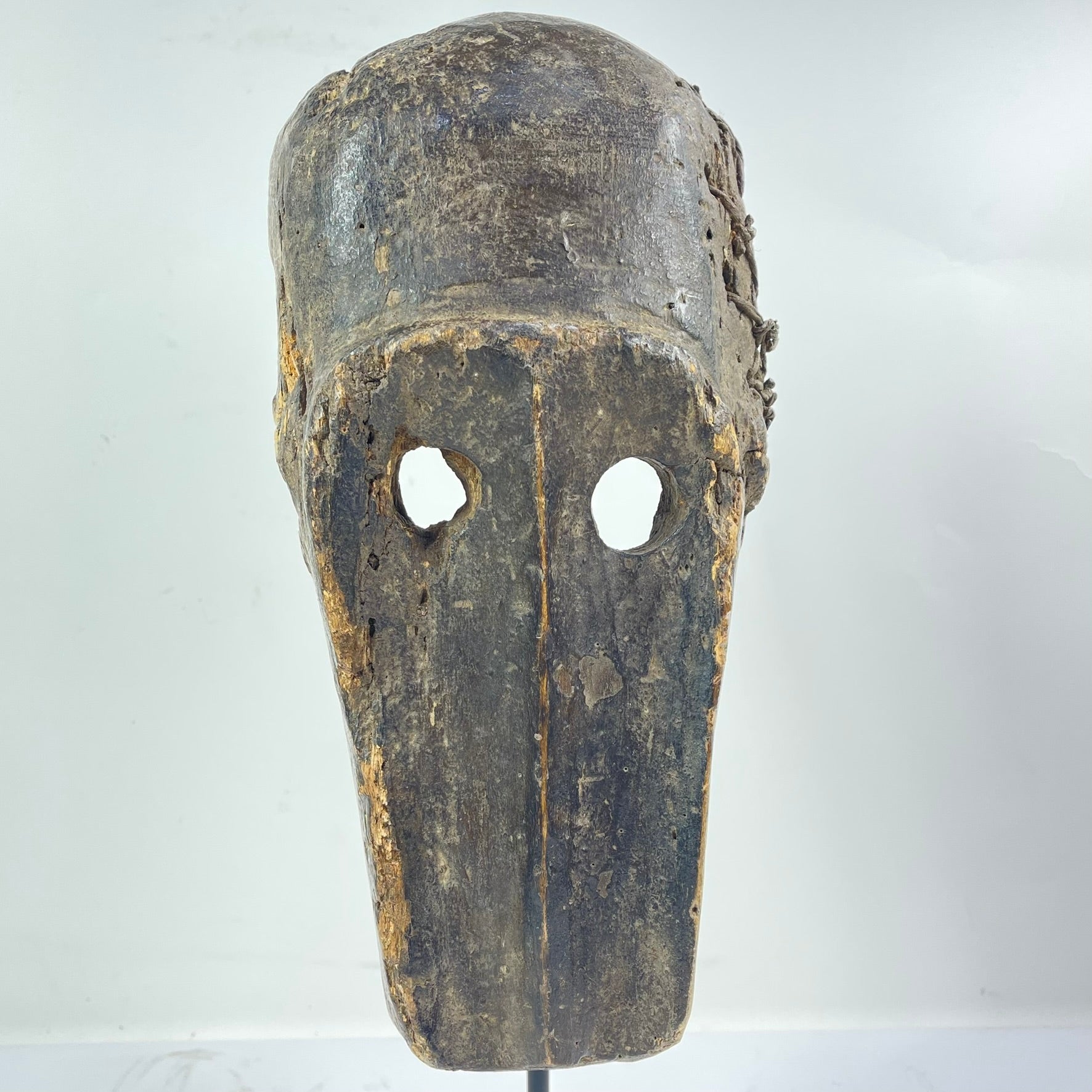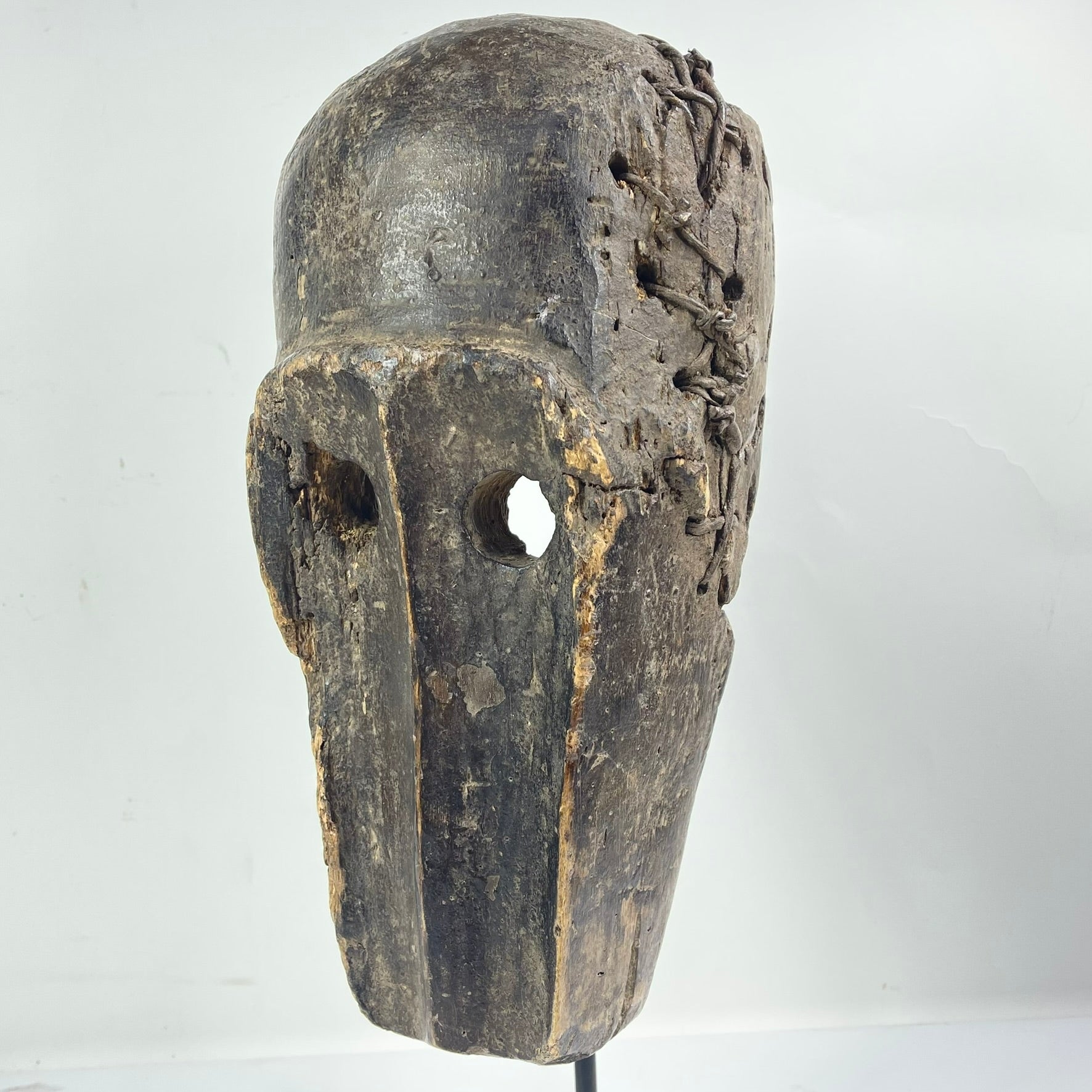 A Baule mask portraying the abstracted face of a primate, with a very unique indigenous repair on the right side of the mask. The monkey form is clear, with a rounded and elongated jaw. Carved from a single piece of hard, solid wood, this is an impressive example of Baule carving. The patina is thick and the mask shows signs of age.