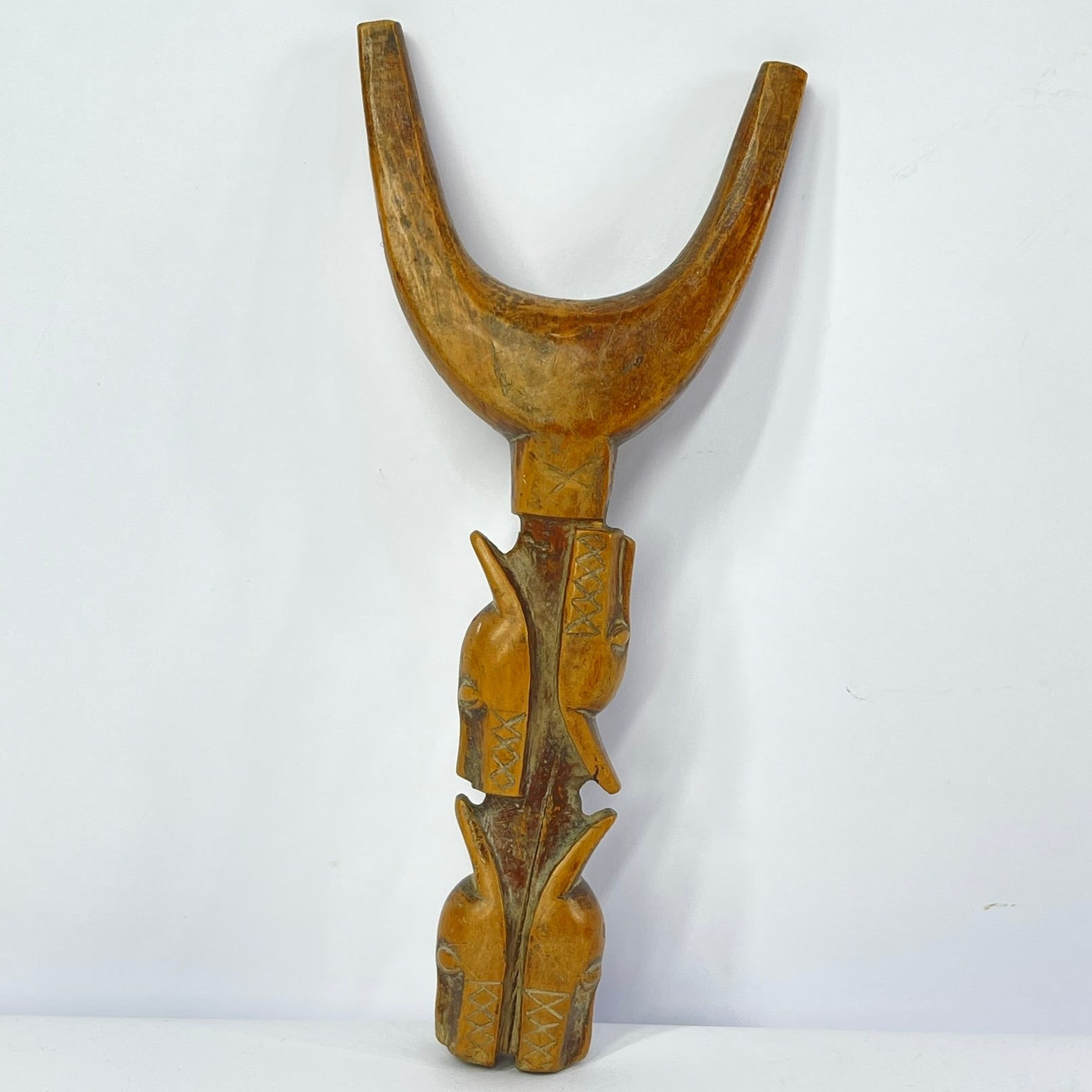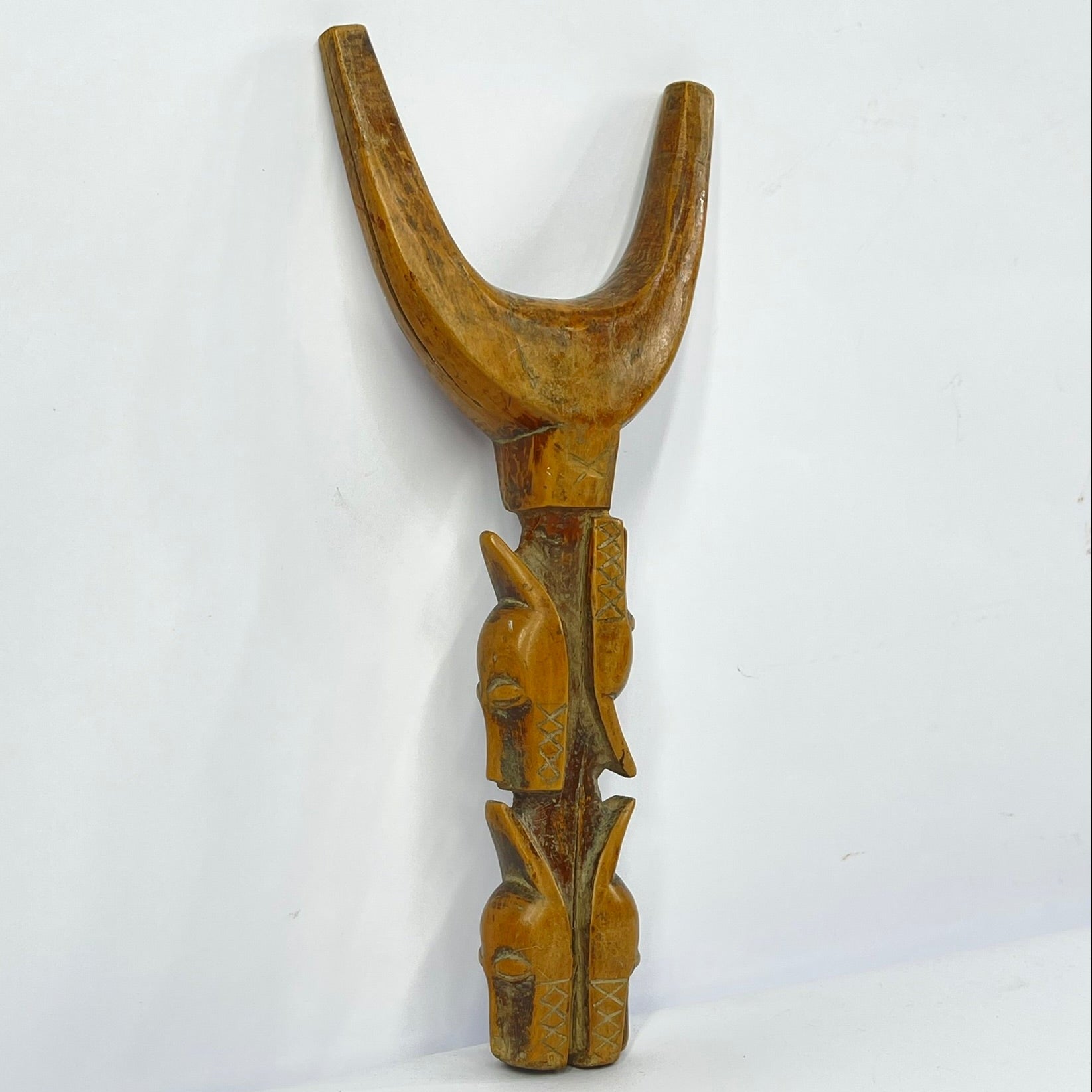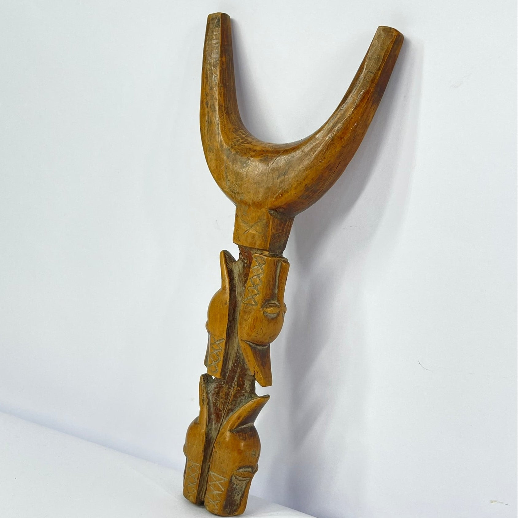 The Baule Figural Slingshot, a stunning piece of African art that showcases the skillful craftsmanship and cultural richness of the Baule people. This unique slingshot is intricately hand-carved from a single piece of wood and features a striking figural design.