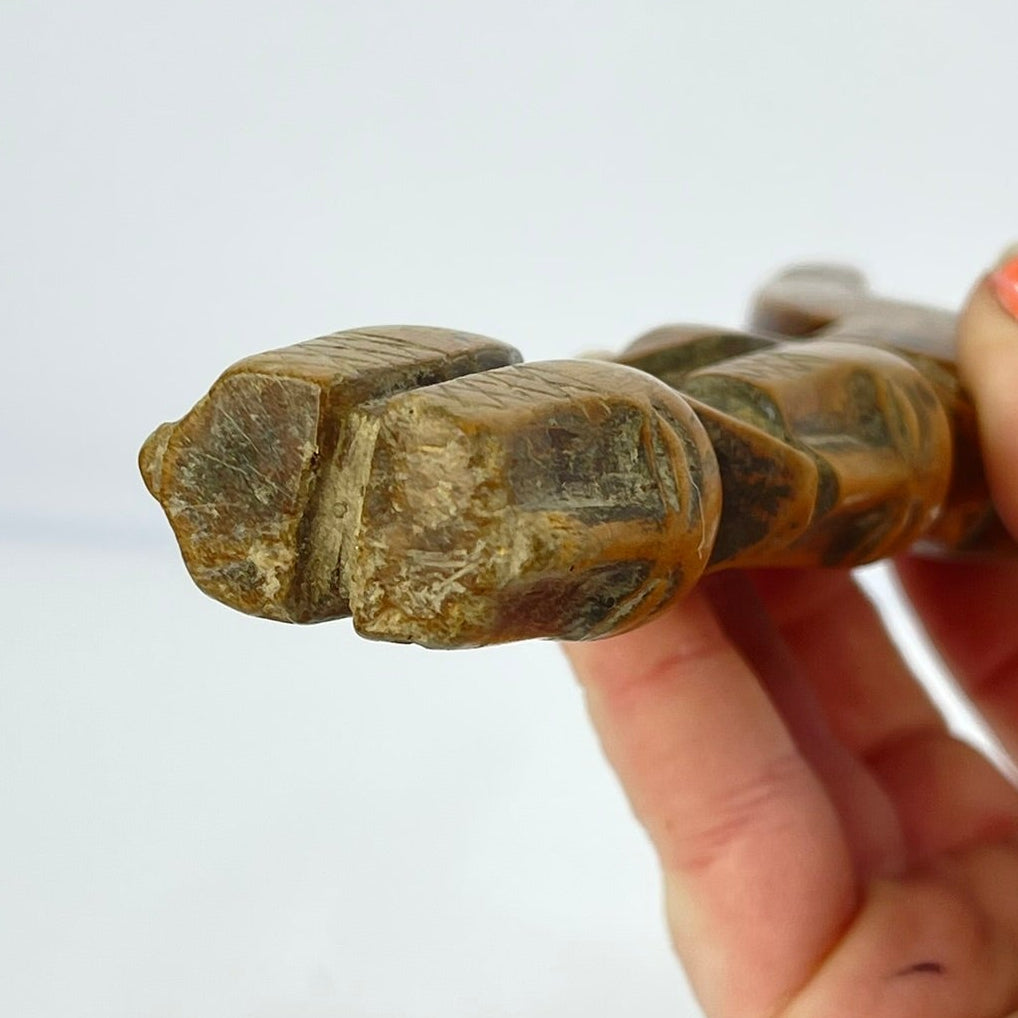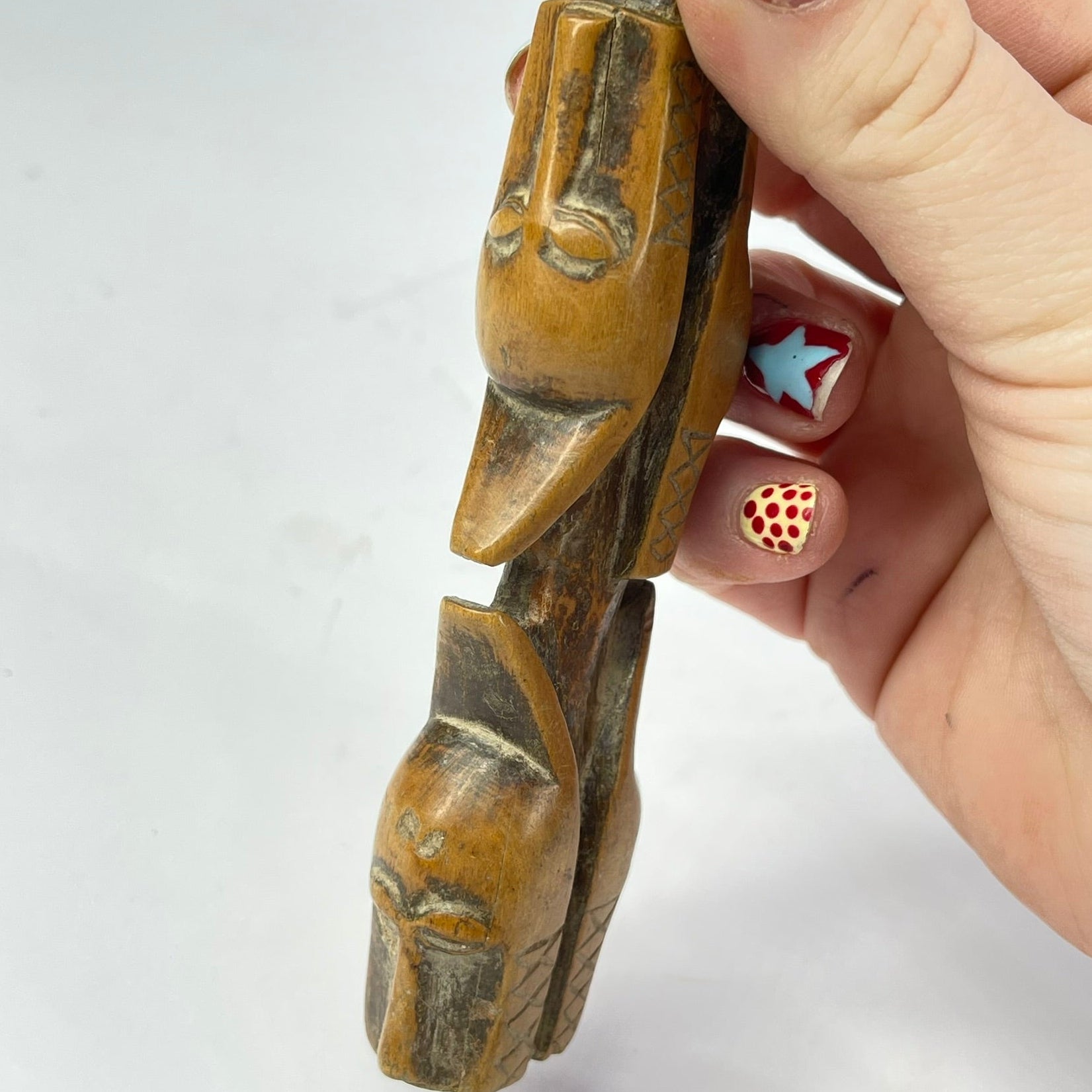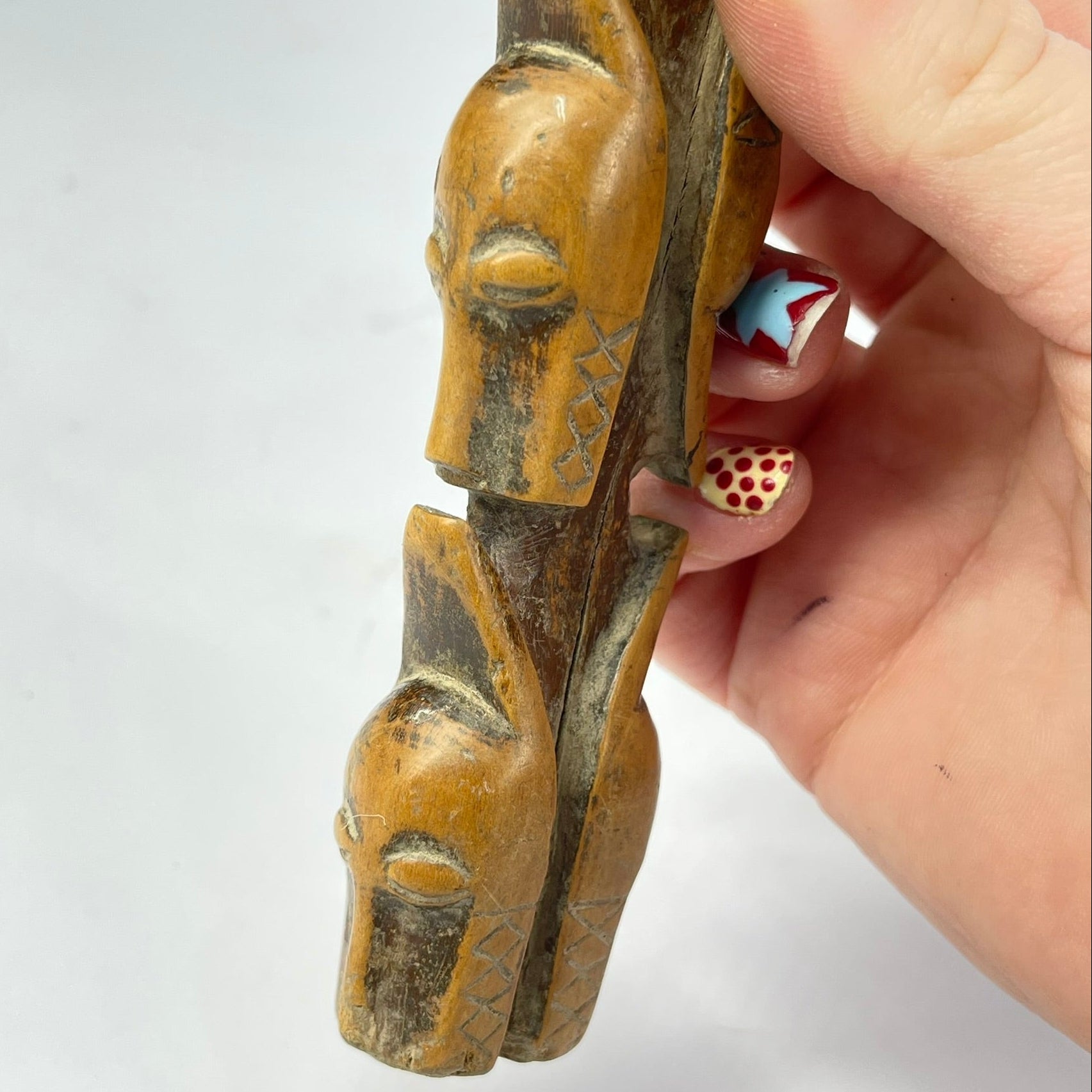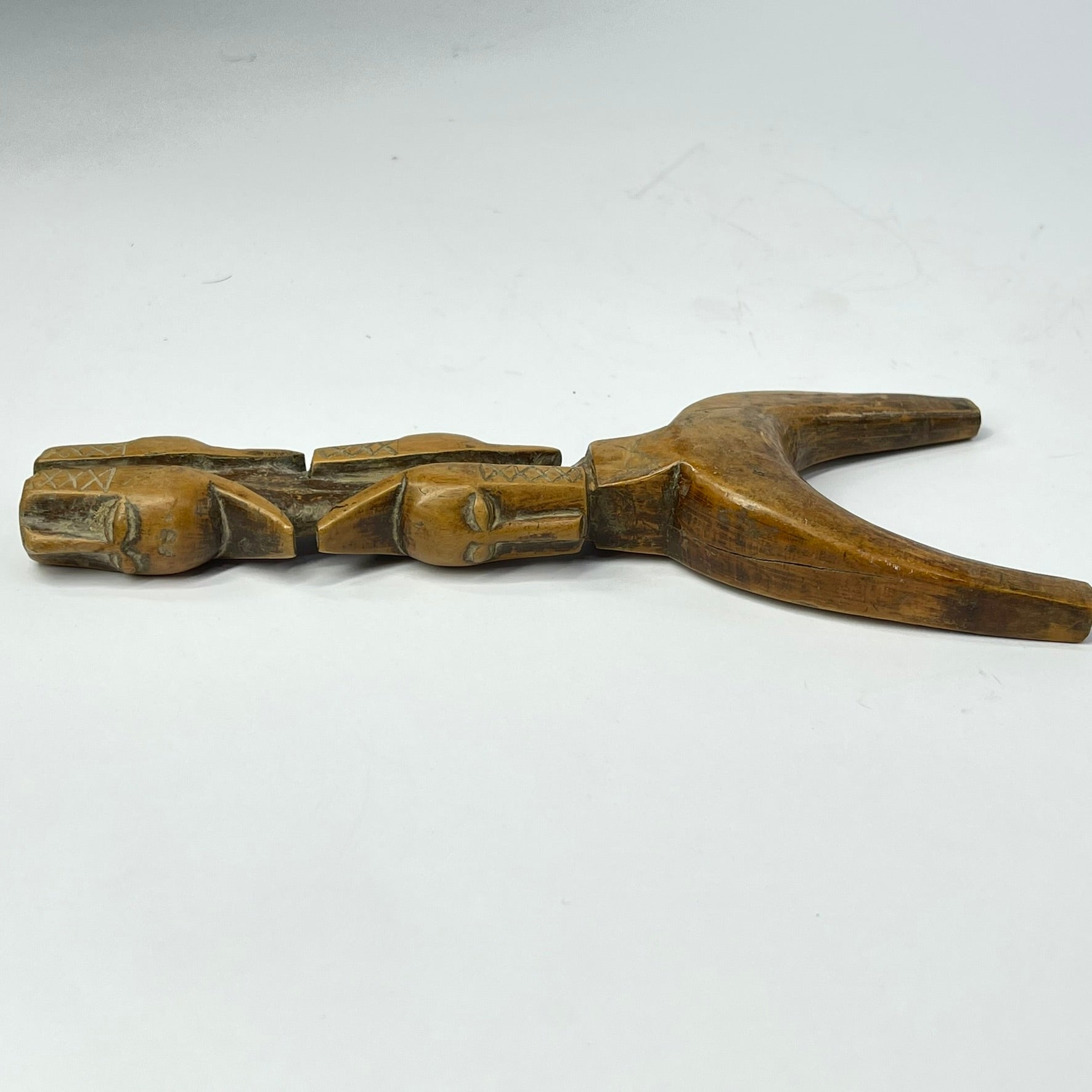 The Baule Figural Slingshot, a stunning piece of African art that showcases the skillful craftsmanship and cultural richness of the Baule people. This unique slingshot is intricately hand-carved from a single piece of wood and features a striking figural design.