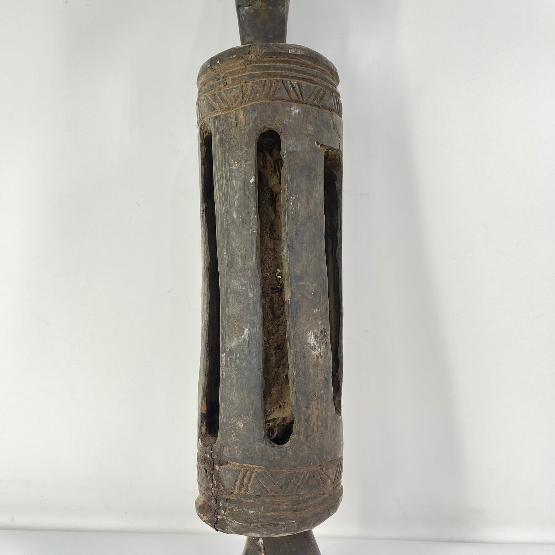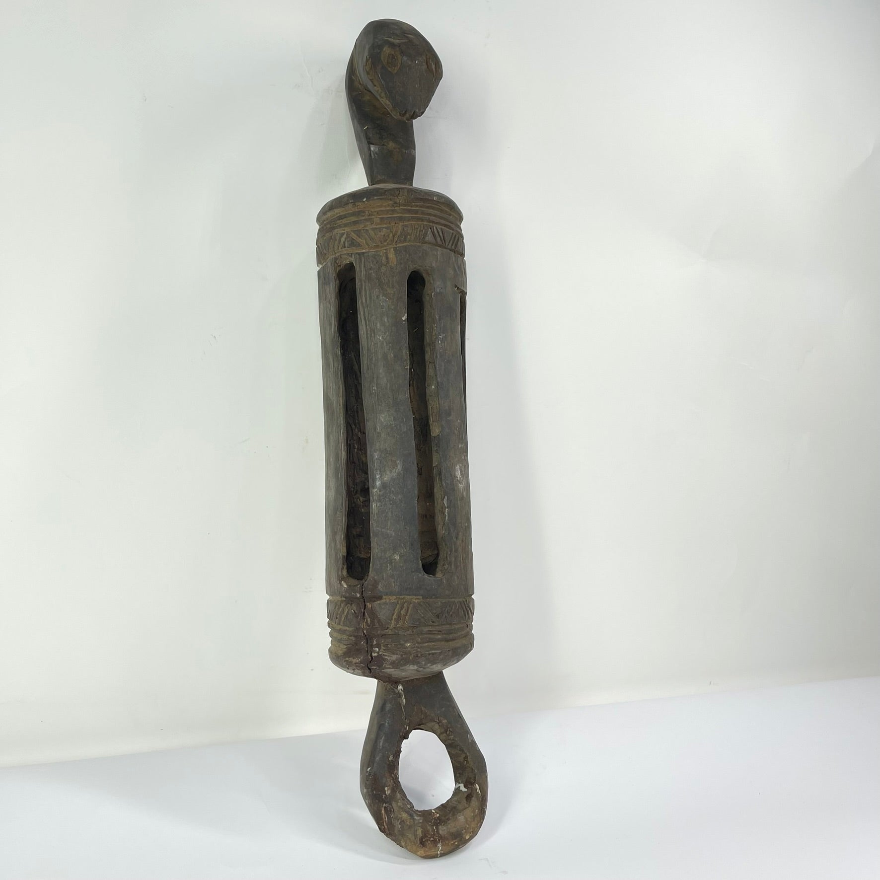 This carved wooden split gong originates from the Baule people of Côte d'Ivoire. The instrument is sculpted from a single piece of wood and features a tall cylindrical body hollowed through a series of vertical openings. The top is adorned with a carved figural head, while the bottom ends in an open loop form, both elements clearly visible in the photograph and consistent with Baule sculptural aesthetics.