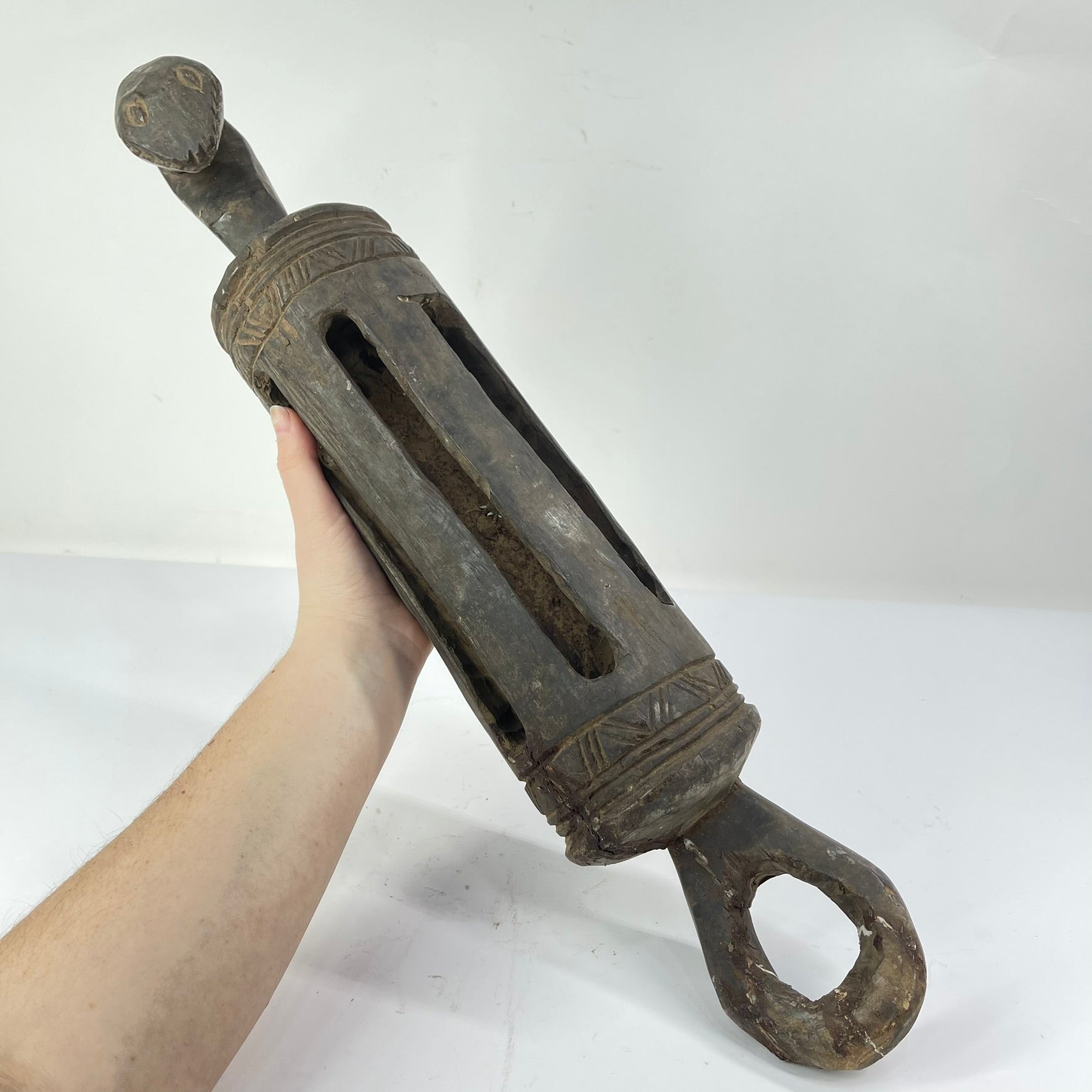 The Baule are celebrated for their mastery of wood carving, particularly their portrait masks and figures, admired globally for their elegance, refinement, and spiritual potency. These creations often embody ideals of grace, beauty, and ancestral presence. While this object is not a mask, it belongs to the same artistic and ceremonial universe. Much like the Baule’s renowned Mblo masks, known for their delicate features and symbolic power this slit gong reflects a complex interplay between artistry, ritual practice, and communication with the spirit realm. Instruments like this were essential components of divination, healing, and ceremonial life, serving as both functional tools and spiritually charged works of art.