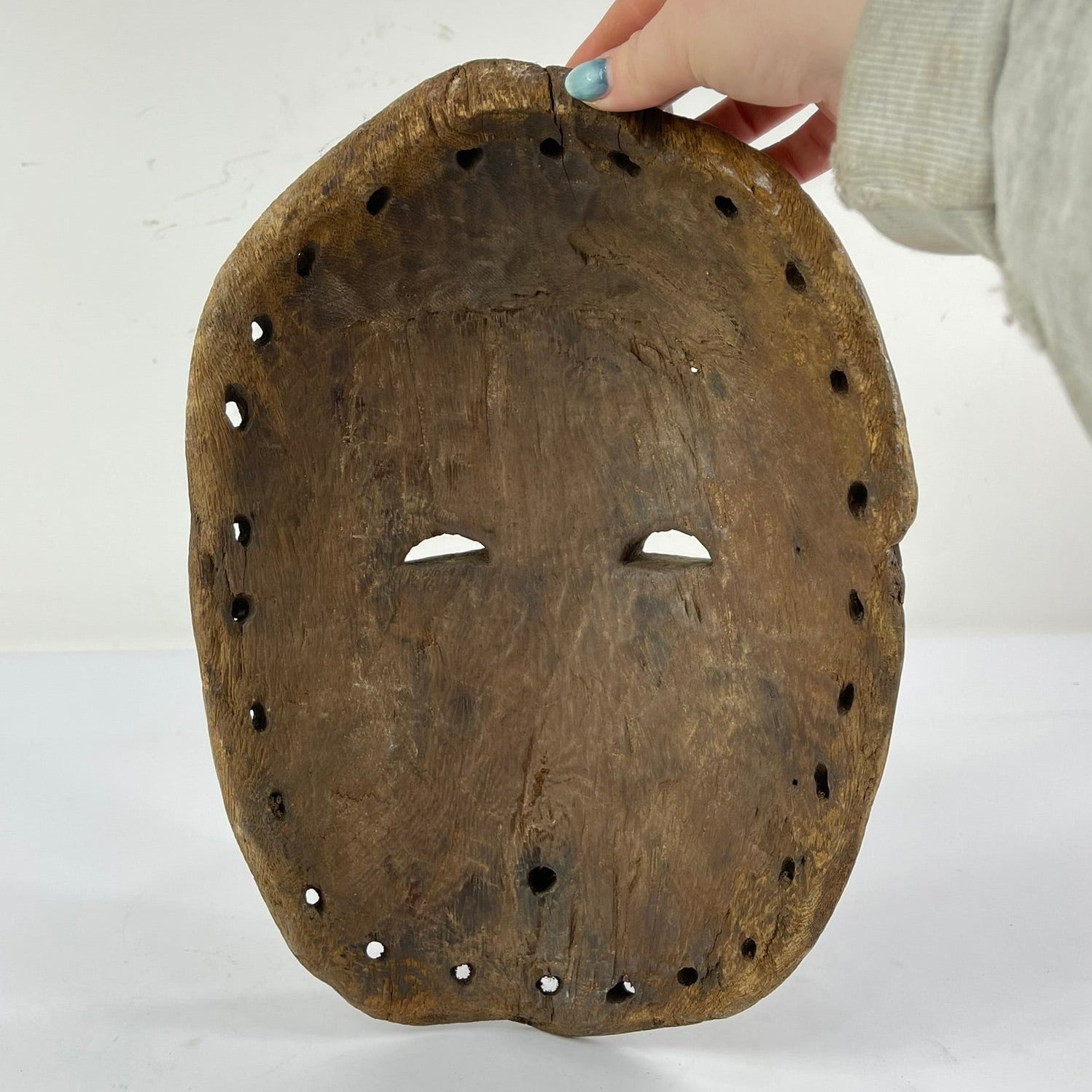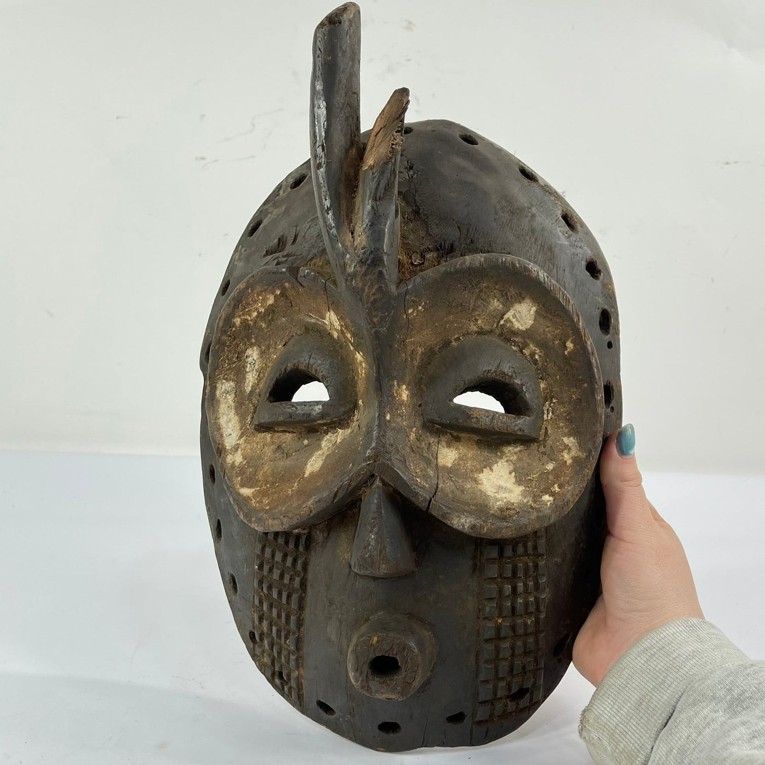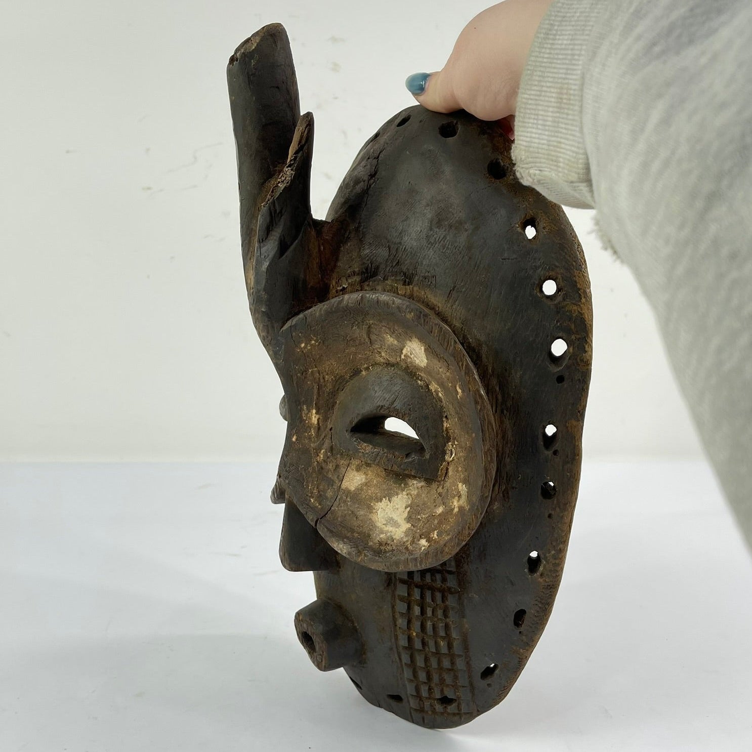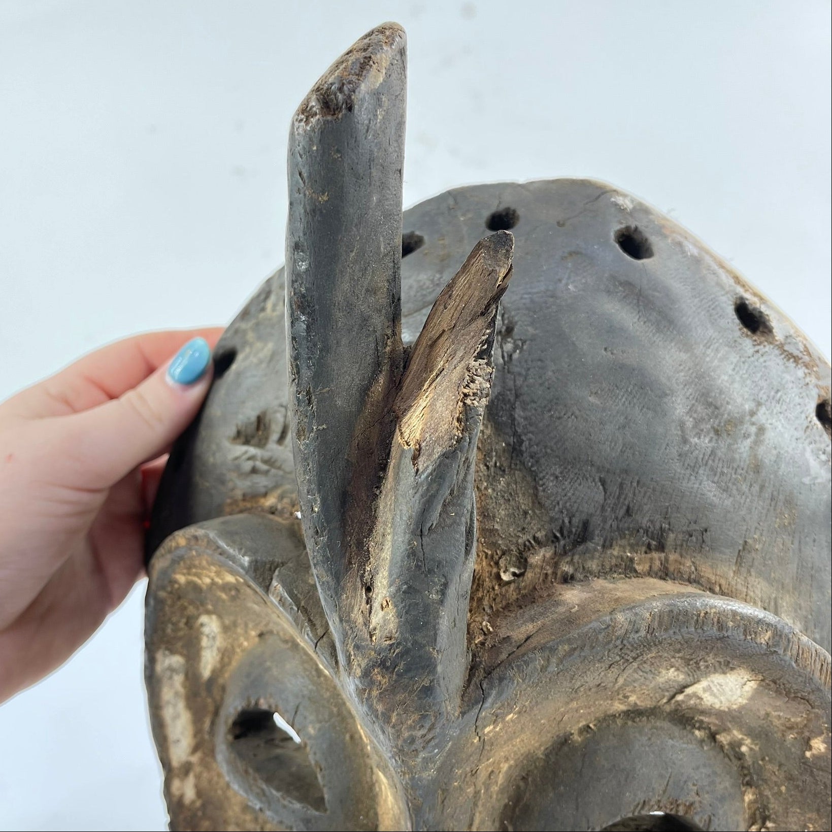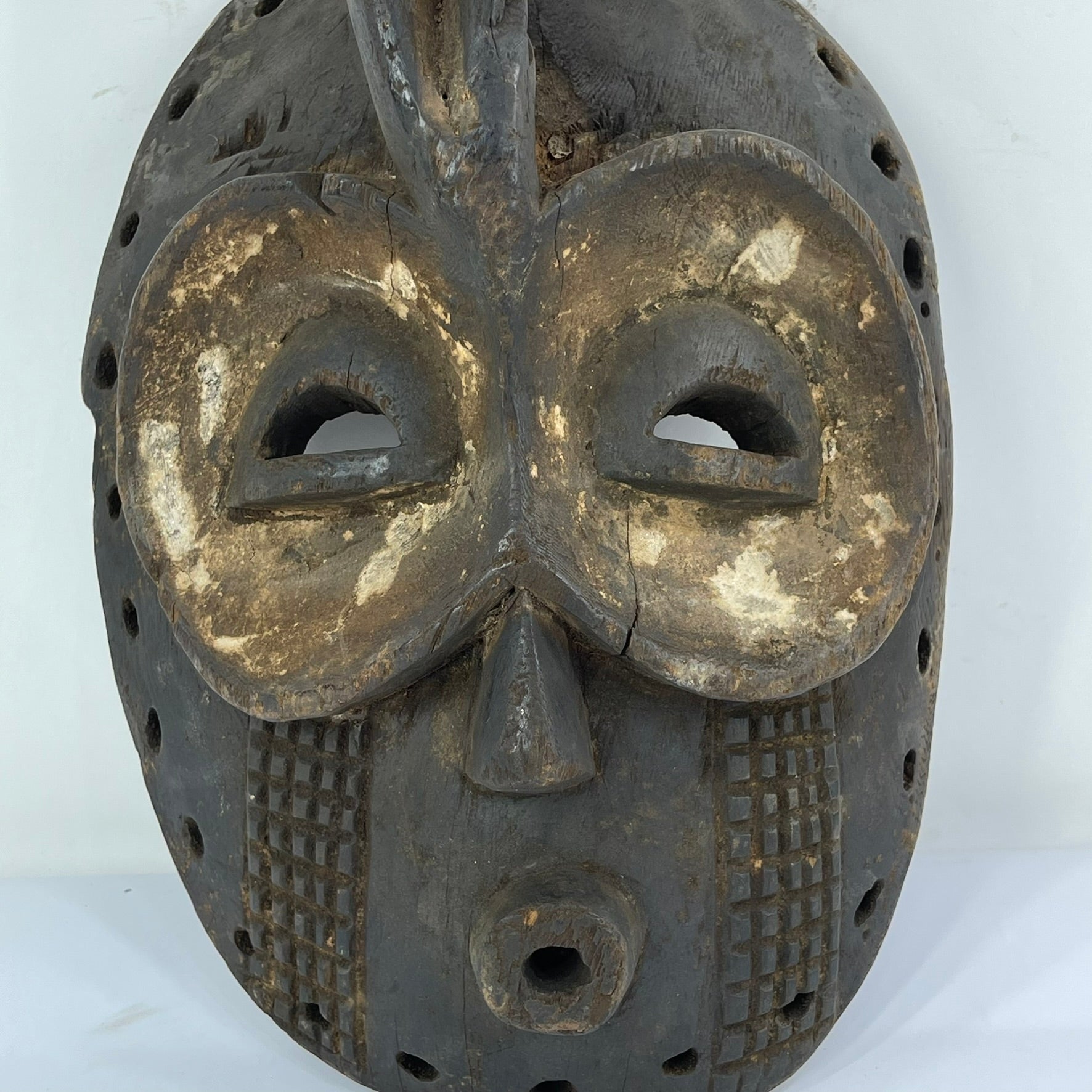 One notable feature of the Bembe Helmet Mask that offers insight into its age and method of creation is the presence of small, irregular holes visible in certain areas of the wood. These holes are consistent with having been made using an awl—a simple, pointed hand tool traditionally used in woodworking before the widespread availability of metal drills. Unlike machine-drilled holes, awl-made perforations tend to vary slightly in size and depth and often show subtle tearing of the wood fibers rather than smooth, uniform edges. Art historians and conservators use such details to help date objects, as the reliance on hand tools like awls generally points to an earlier period of production. This evidence suggests that the mask was likely crafted before the introduction of more modern tools, reinforcing its historical significance and underscoring the depth of traditional knowledge and craftsmanship within Bembe artistic practices.