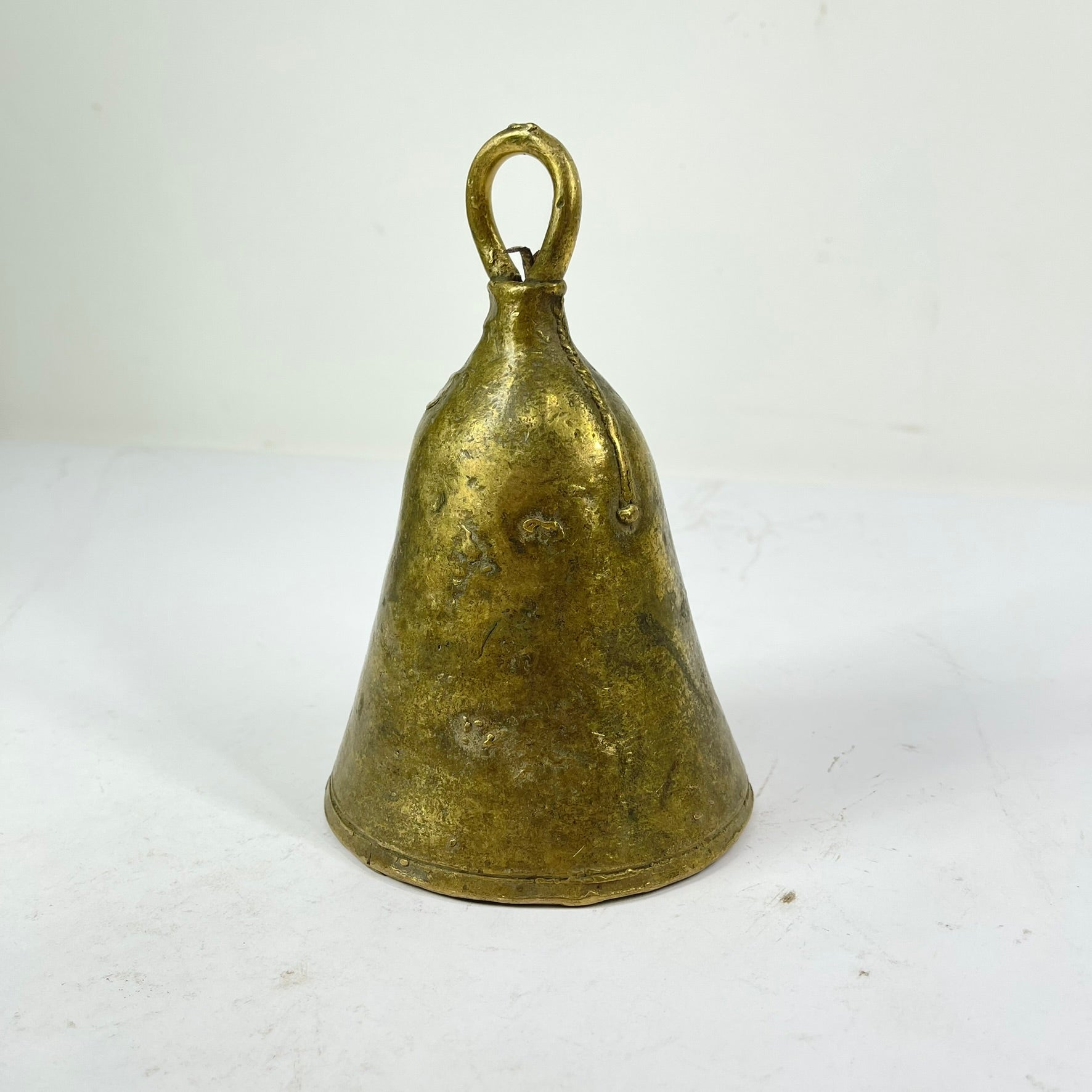 The brass metal bell was crafted by the Benue and Chamba artisans and metalworkers of Nigeria. These bells were often used on the free-roaming cattle so herders could keep track of their animals by listening to the sound of the distant bells as the cattle grazed along vast plains. Although they are typically referred to as "cow bells," they are also used on a variety of animals, like goats.