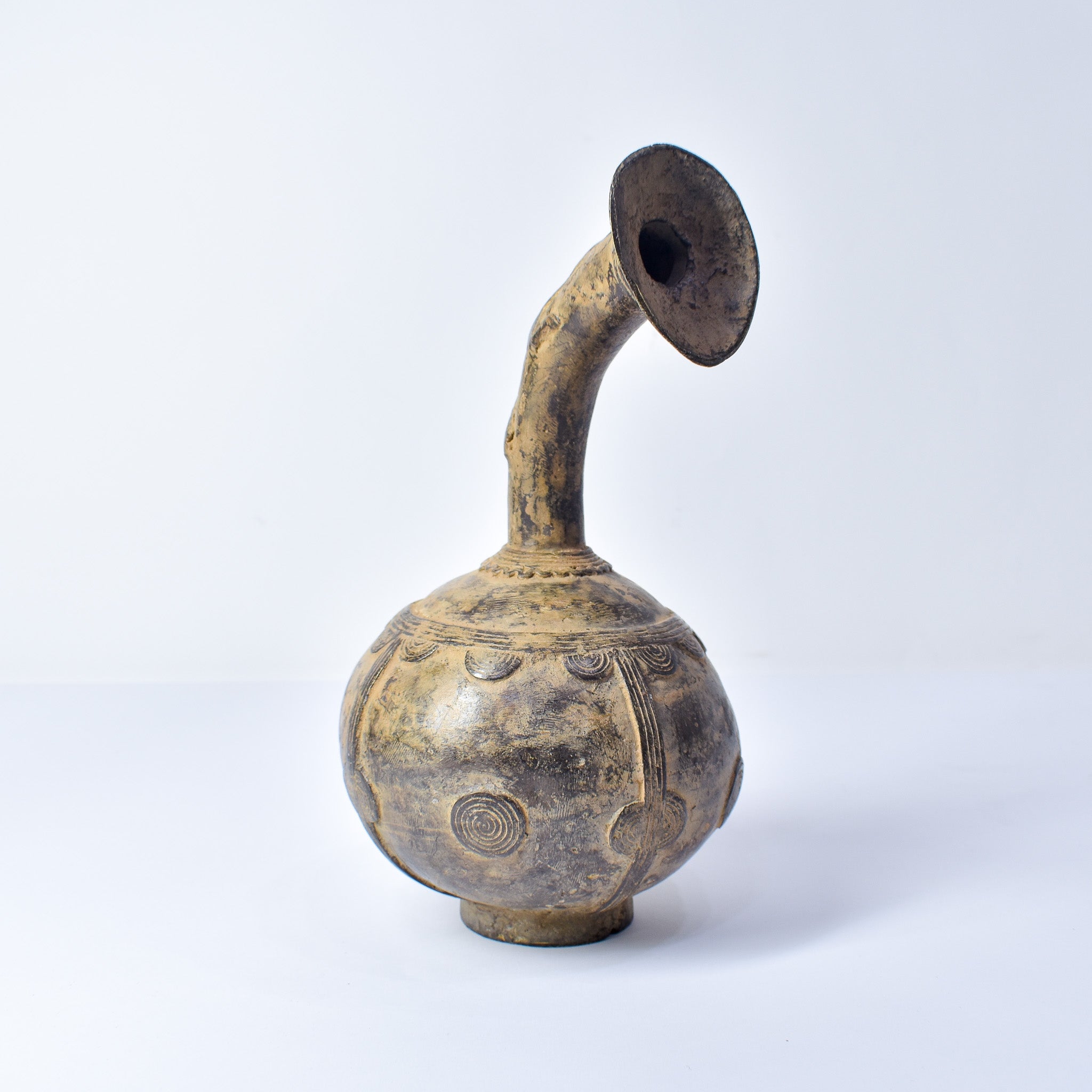 This striking metal pot from the Bobo people of Burkina Faso showcases both sculptural imagination and refined metalworking skill. The vessel features a rounded body with low relief geometric and curvilinear designs, rising to a tall neck that culminates in a stylized dragon or mythical creature’s head. The expressive head—complete with open mouth, horns, and finely modeled features—imbues the piece with a sense of vitality and symbolic power.