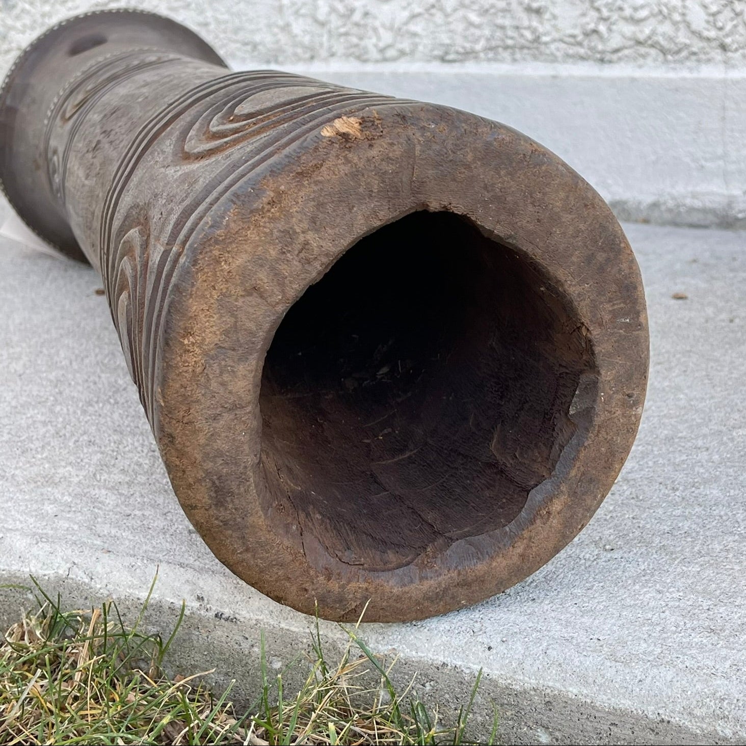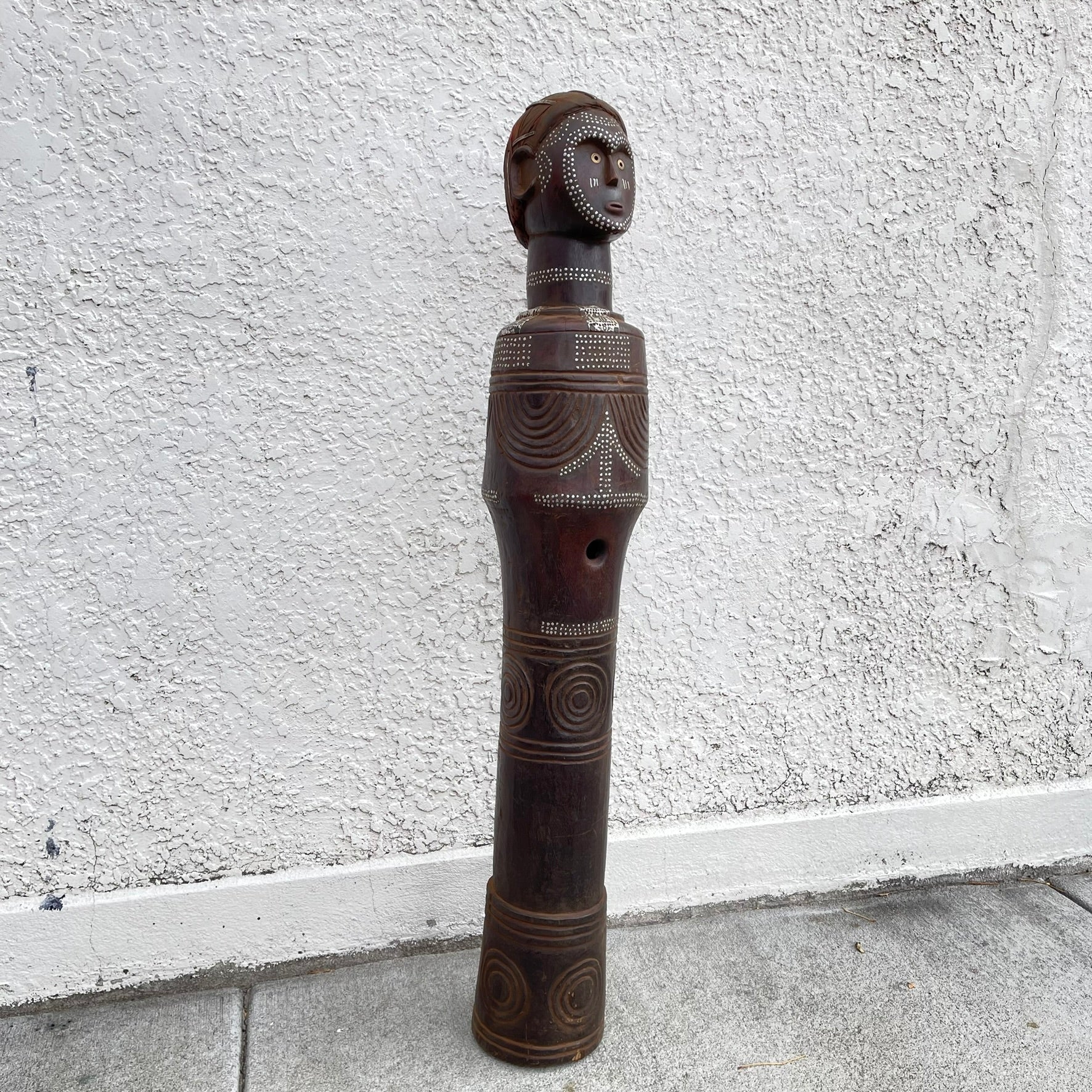 The figure stands an impressive 47 inches tall, placing it among the larger examples of Bongo sculptural trumpets. The piece is hollowed, with a circular opening in the torso, a characteristic feature seen in many figural trumpets from South Sudan and neighboring regions, including similar traditions in Central Africa and Uganda. Figural trumpets of this type are considered uncommon in collections. Their scale, craftsmanship, and cultural significance make them important examples of Bongo material culture. This particular specimen shows evidence of considerable age and handling and would be a major addition to a collection of African sculpture or musical/ritual instruments.