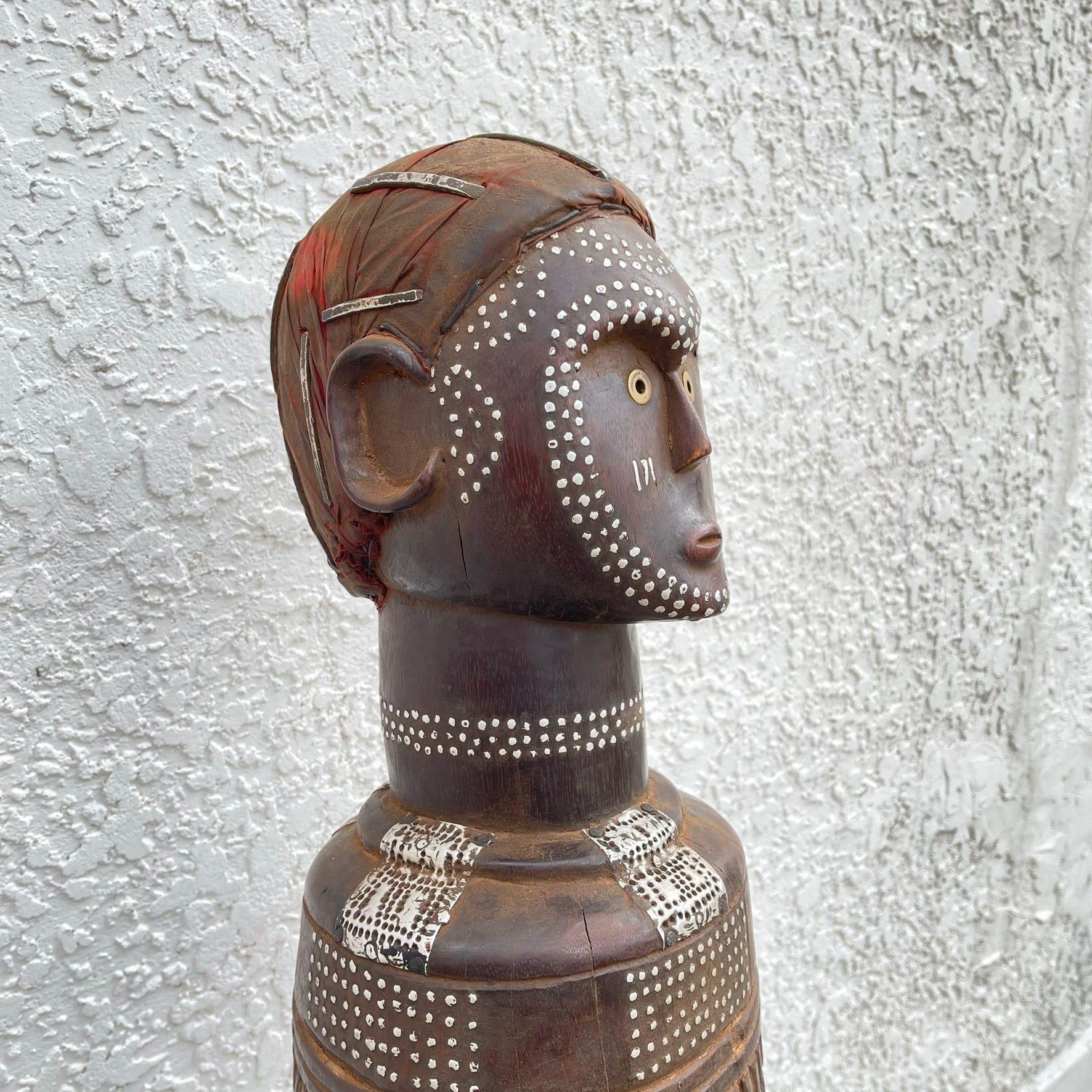 This is a large Bongo funerary figural trumpet, carved in wood and decorated with metal studs and hammered metal inlay.