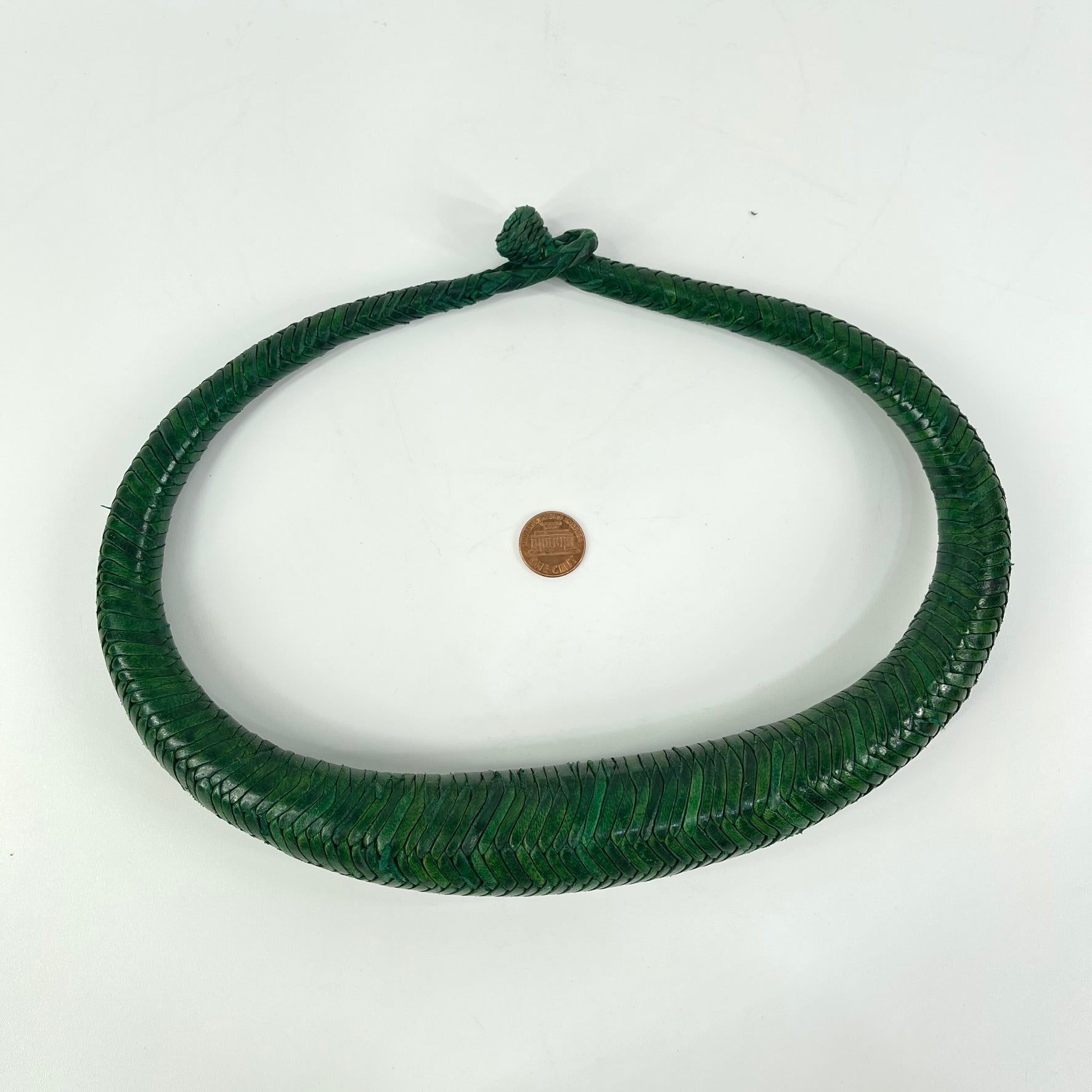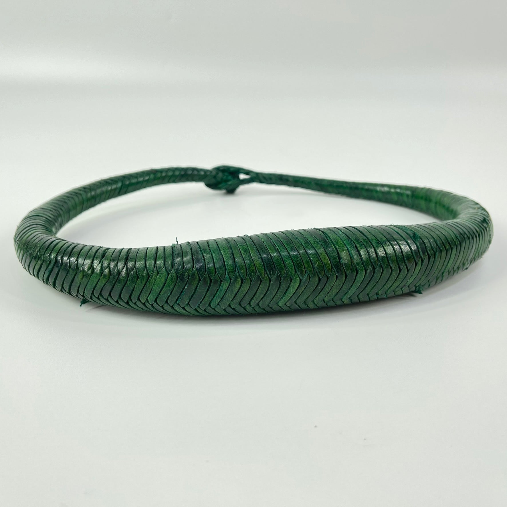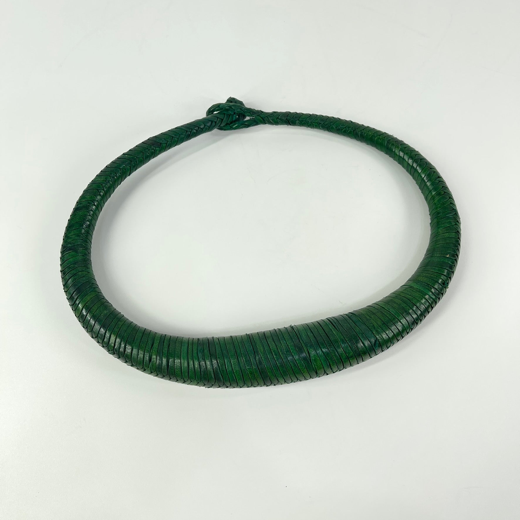 Made of leather strips, this Mpusia necklace is meticulously hand-crafted. The necklace is tapered to feature the wider section in the front center and gradually decreases in diameter as it gets closer to the button closure on the back. These necklaces are called "Mpusia" which means "thank you".