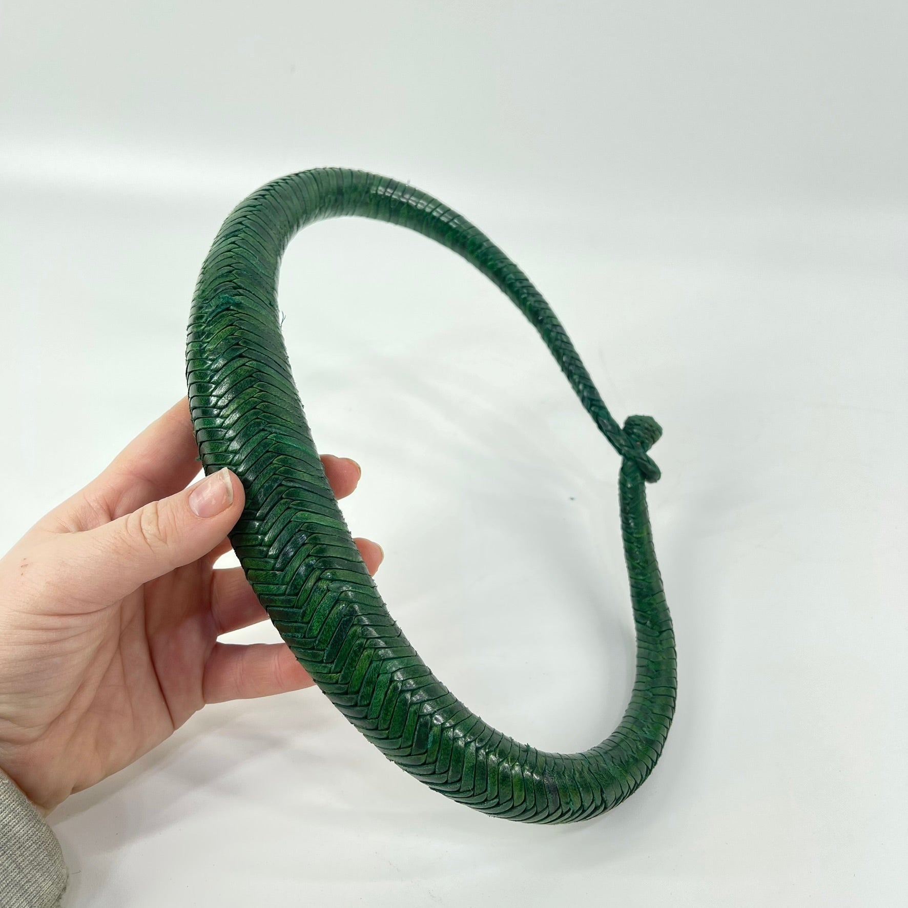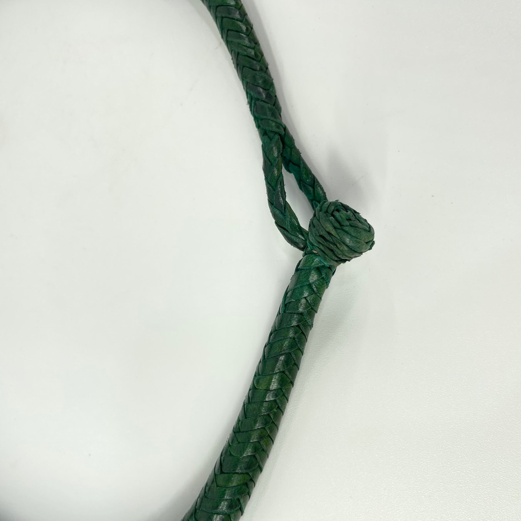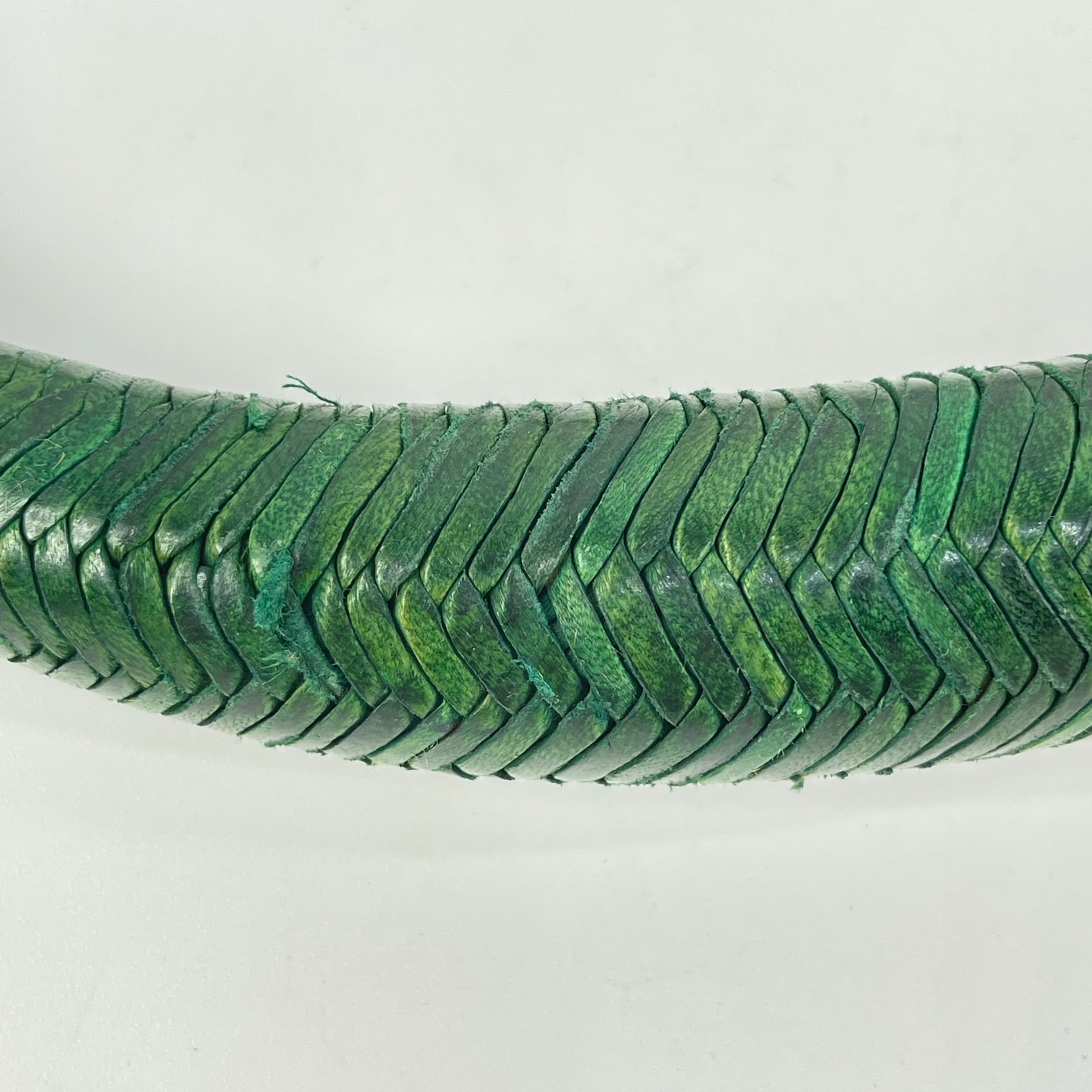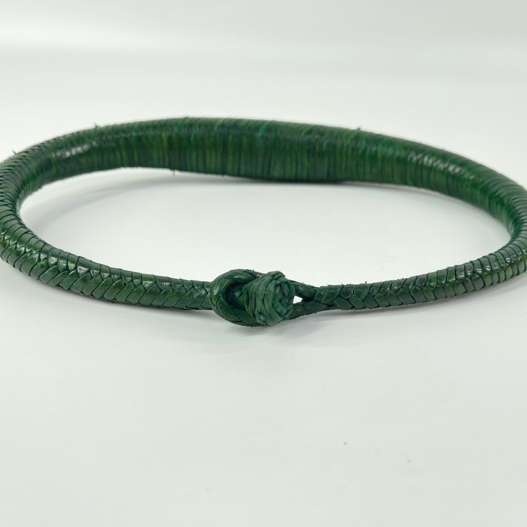 Made of leather strips, this Mpusia necklace is meticulously hand-crafted. The necklace is tapered to feature the wider section in the front center and gradually decreases in diameter as it gets closer to the button closure on the back. These necklaces are called "Mpusia" which means "thank you".