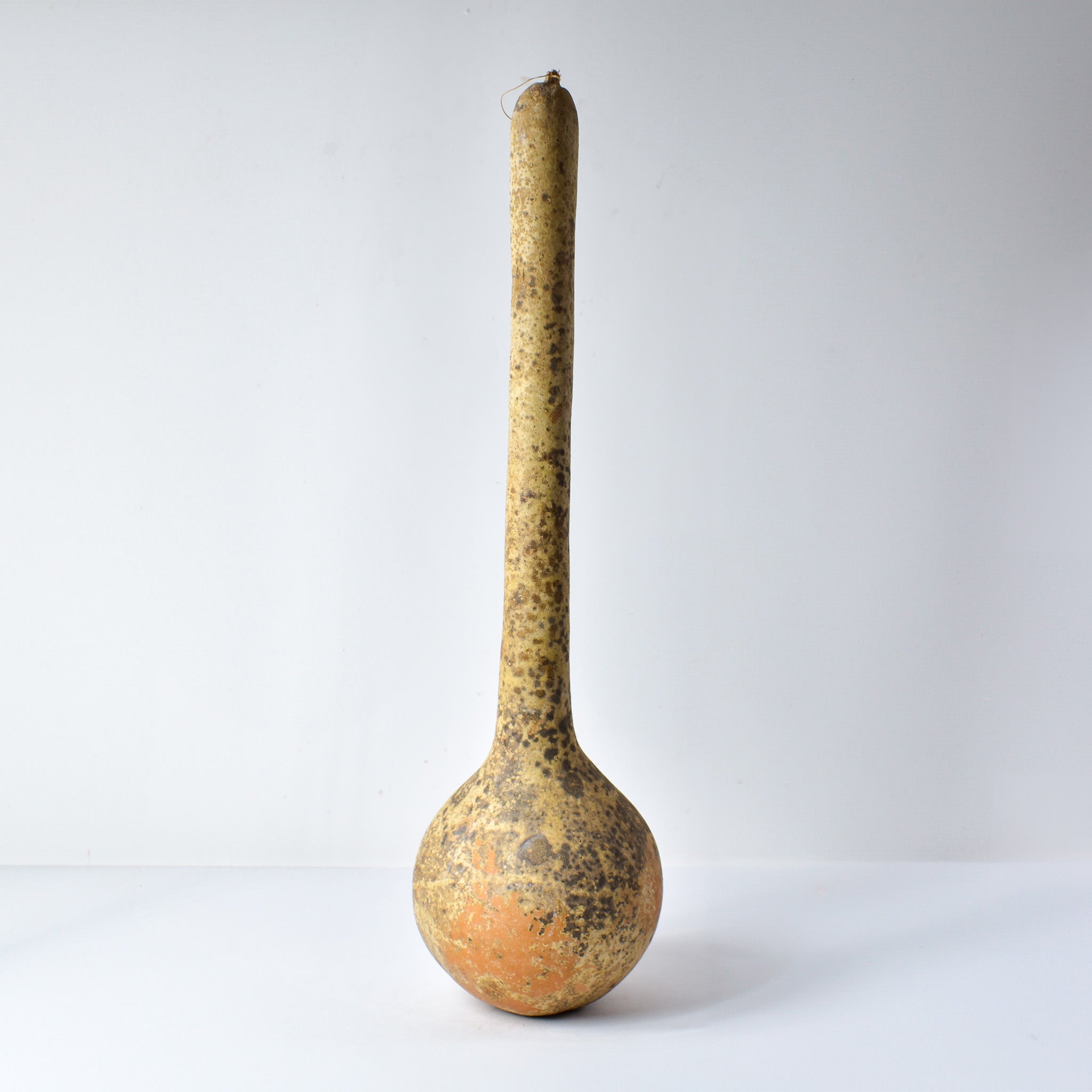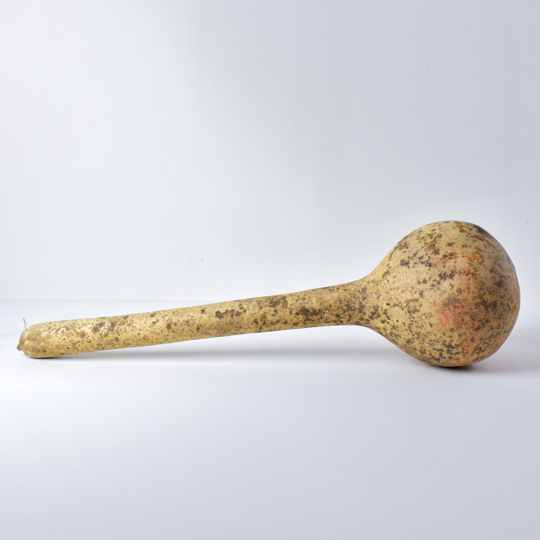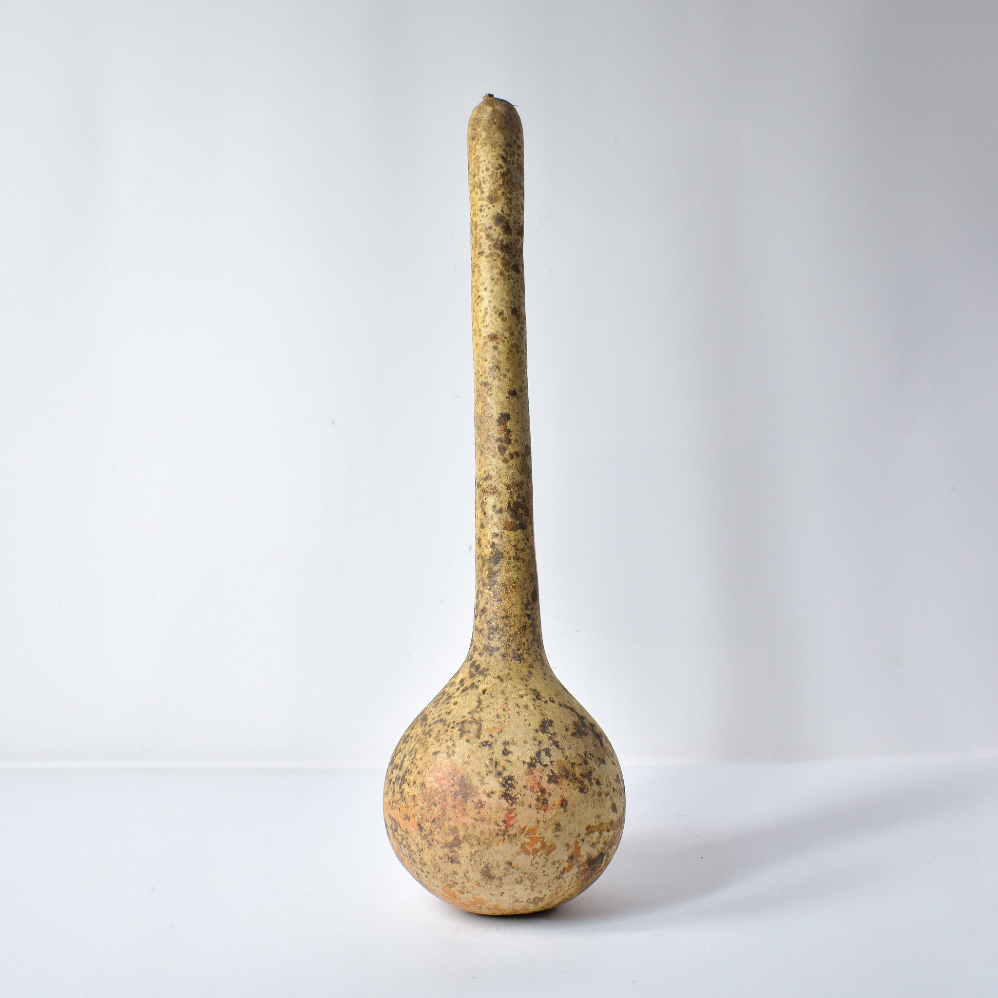 This is a traditional, plain dried African gourd, naturally hollowed and retaining its seeds inside, creating a gentle, earthy rattle when shaken. Sourced from West Africa, gourds like this have been valued for practical use, musical instruments, and as decorative objects in homes and altars.