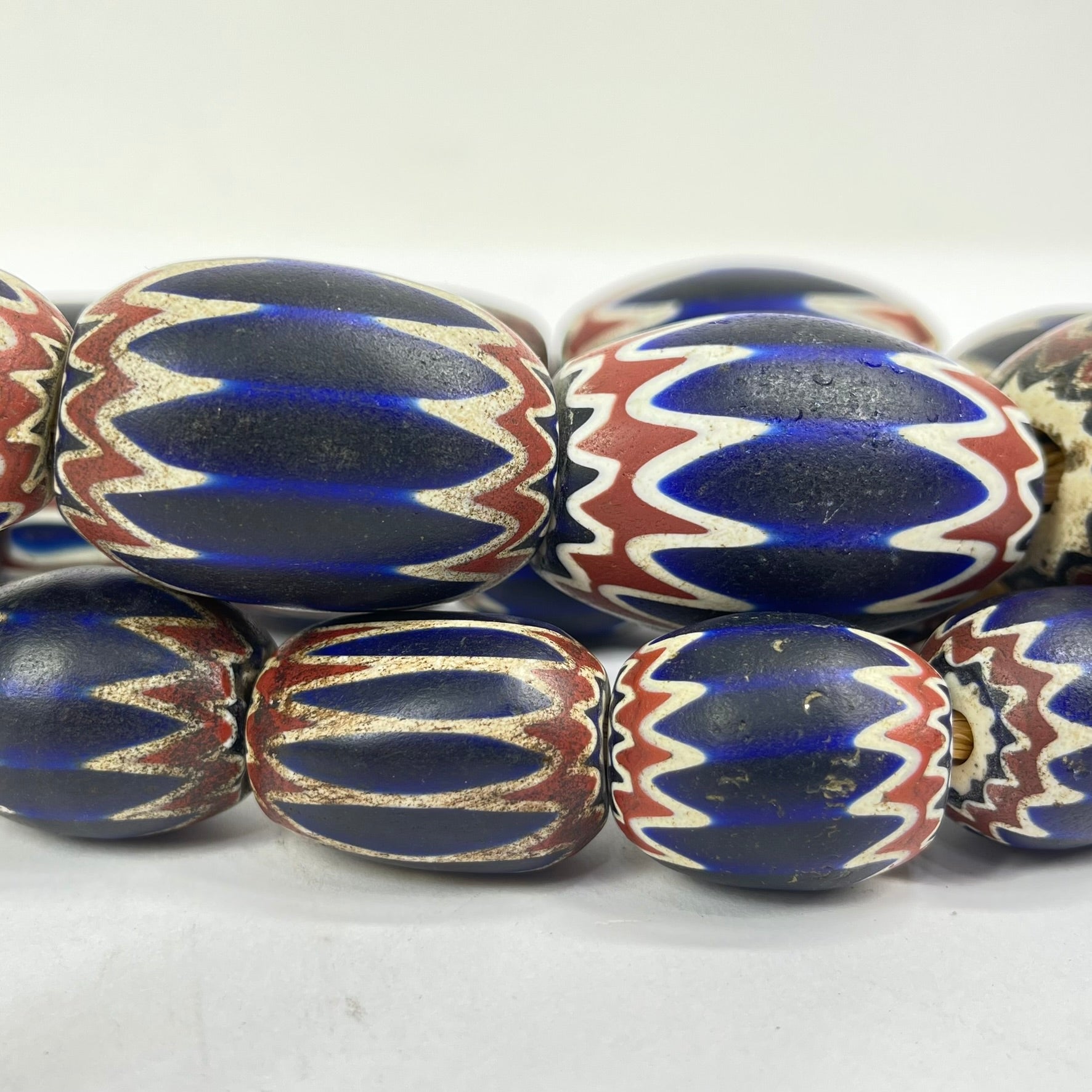 Venetian Chevron beads are highly regarded as the most beautiful and collectible among Venetian "Trade Beads." Produced through a multi-step process involving layering different colored glasses in a 12-point star mold, Chevron beads are also known as "Rosetta" and "Star" beads. The earliest versions from the late 1400s had seven layers, evolving over time to include 8, 9, and 10 layers in the 1500s, and later 3 and 5 layers in the 1600s-1700s. The peak production in the late 1800s and early 1900s featured 4 and 6-layer beads.
