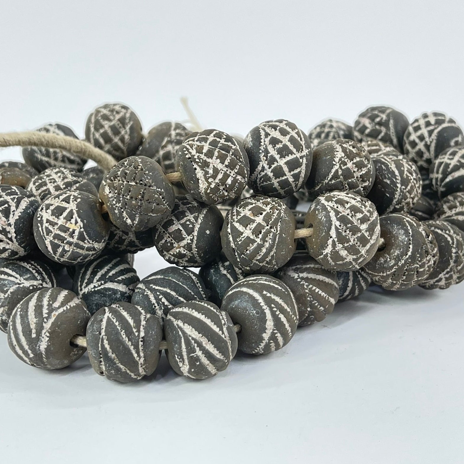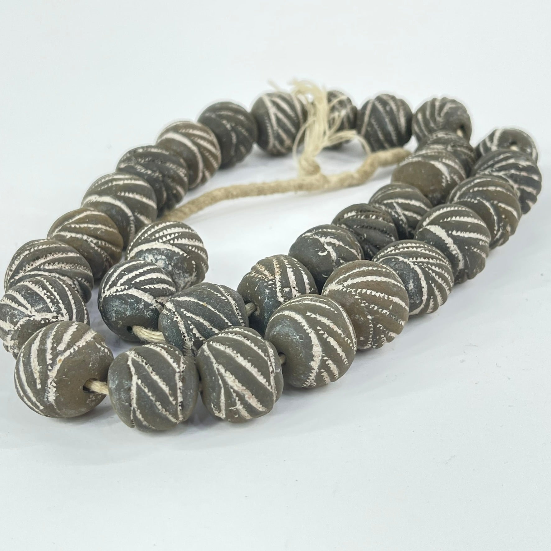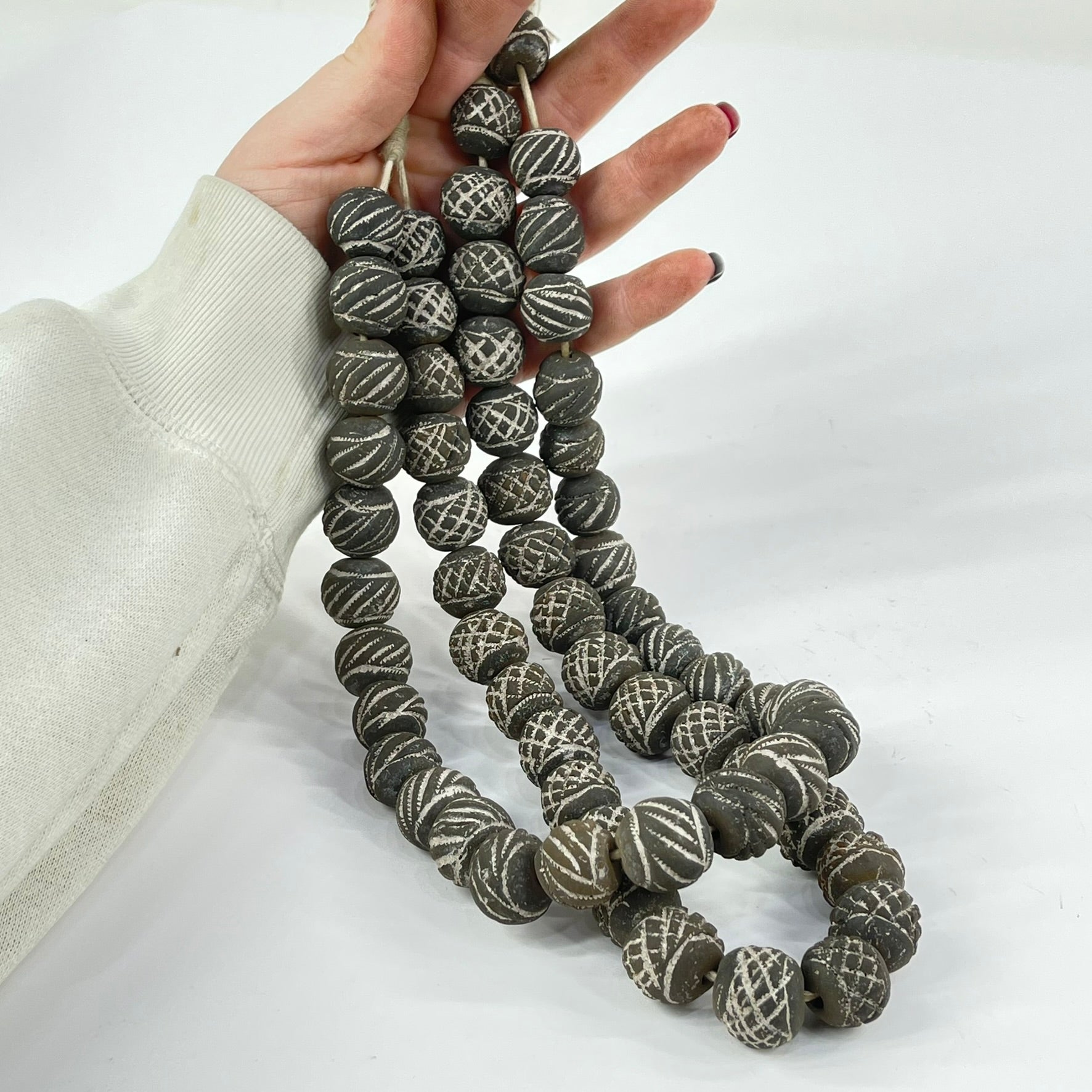 These beautiful round clay beads from Mali, Africa offer a one-of-a-kind texture and patterning throughout. With lovely contrasting groves, this strand radiates an air of exclusivity, perfect for those who appreciate delicate craftsmanship.