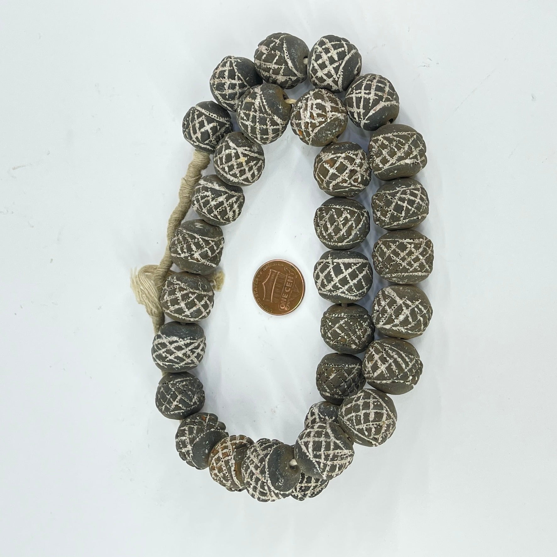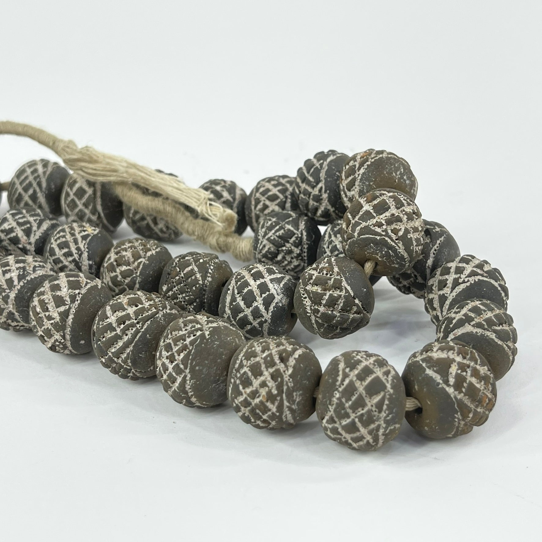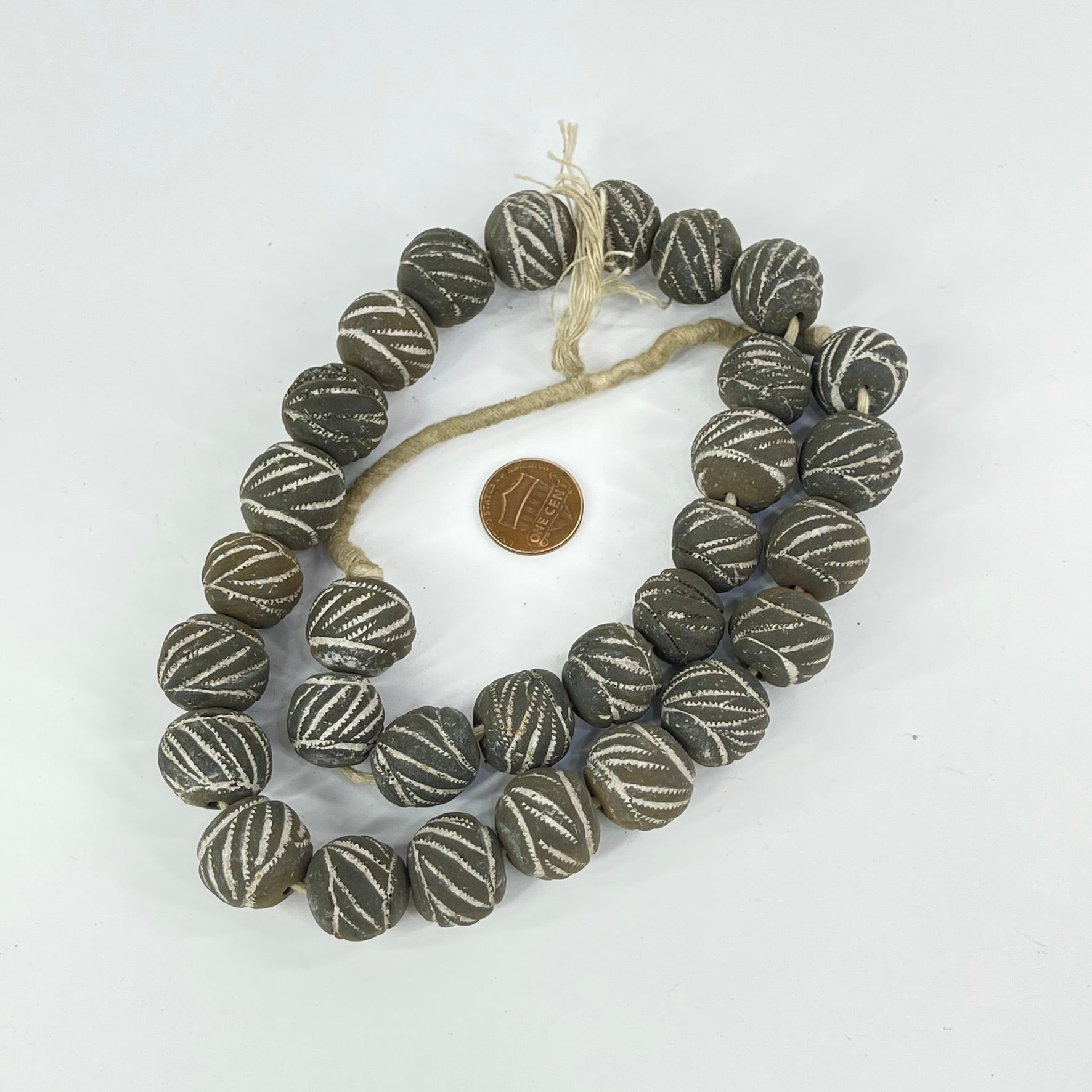 These beautiful round clay beads from Mali, Africa offer a one-of-a-kind texture and patterning throughout. With lovely contrasting groves, this strand radiates an air of exclusivity, perfect for those who appreciate delicate craftsmanship.