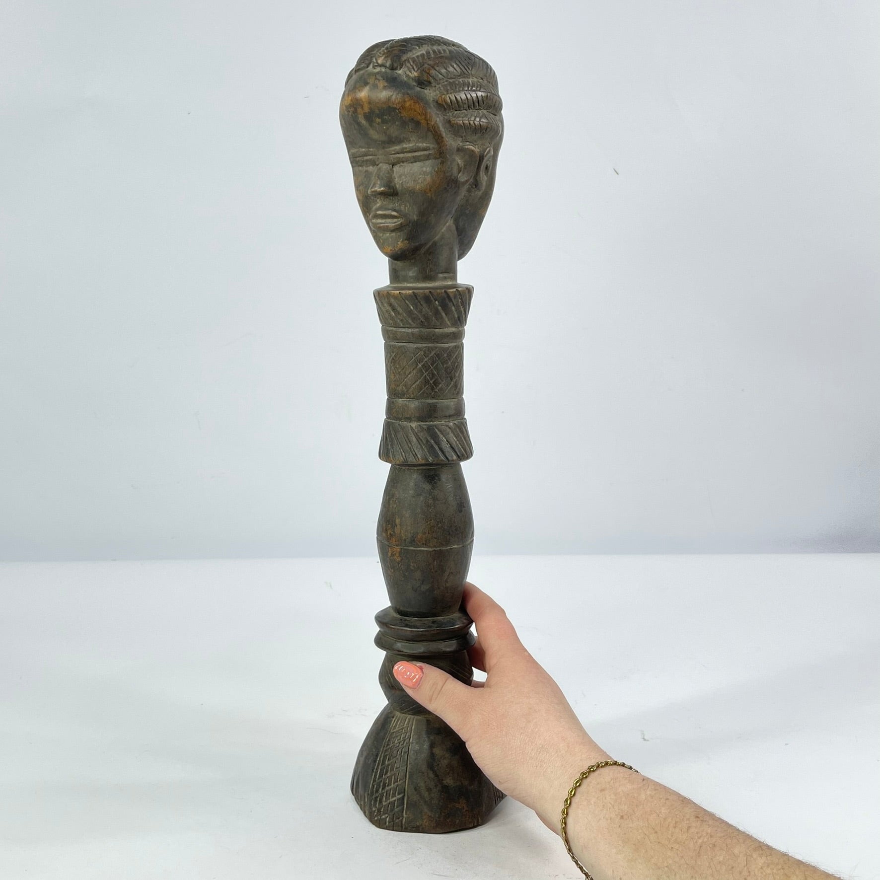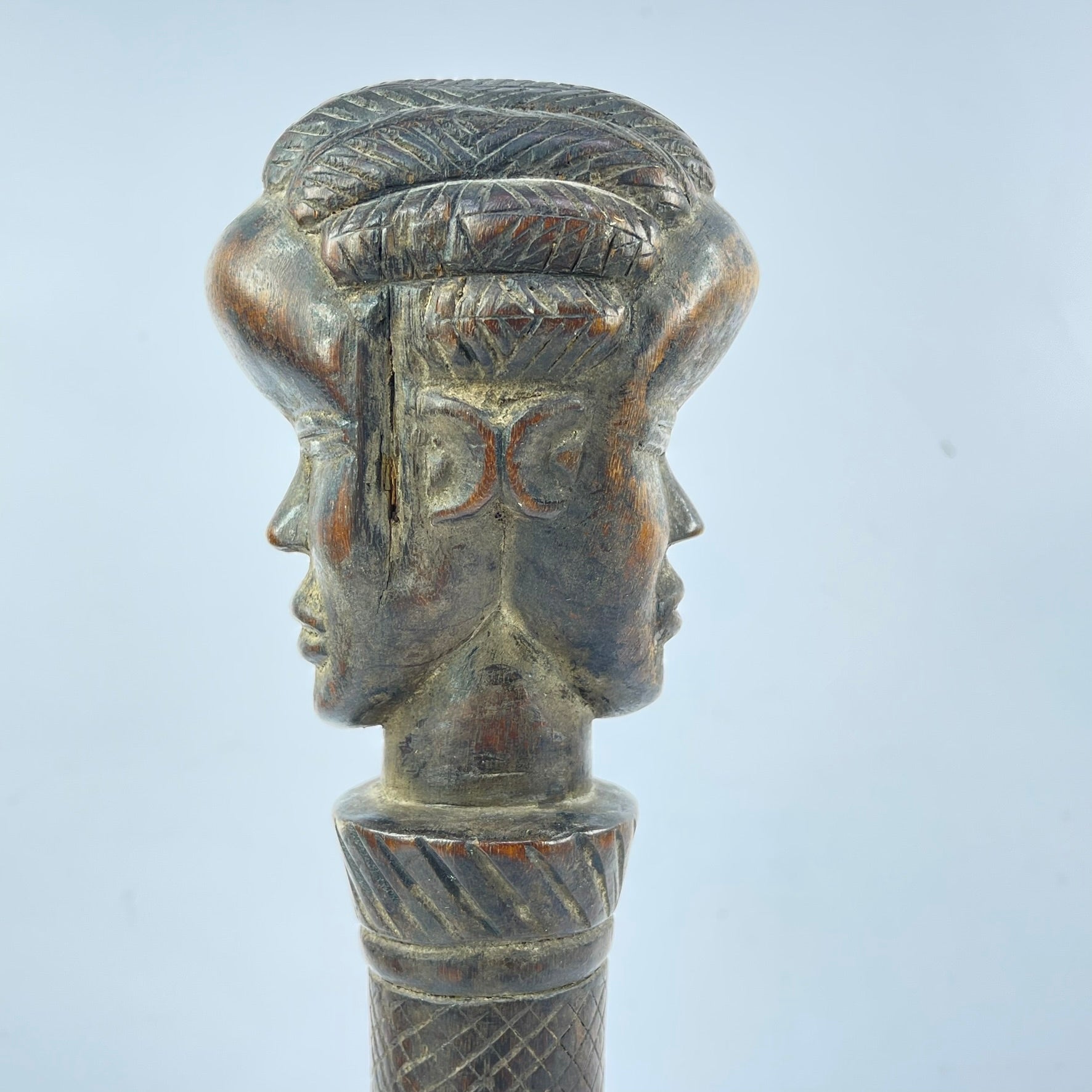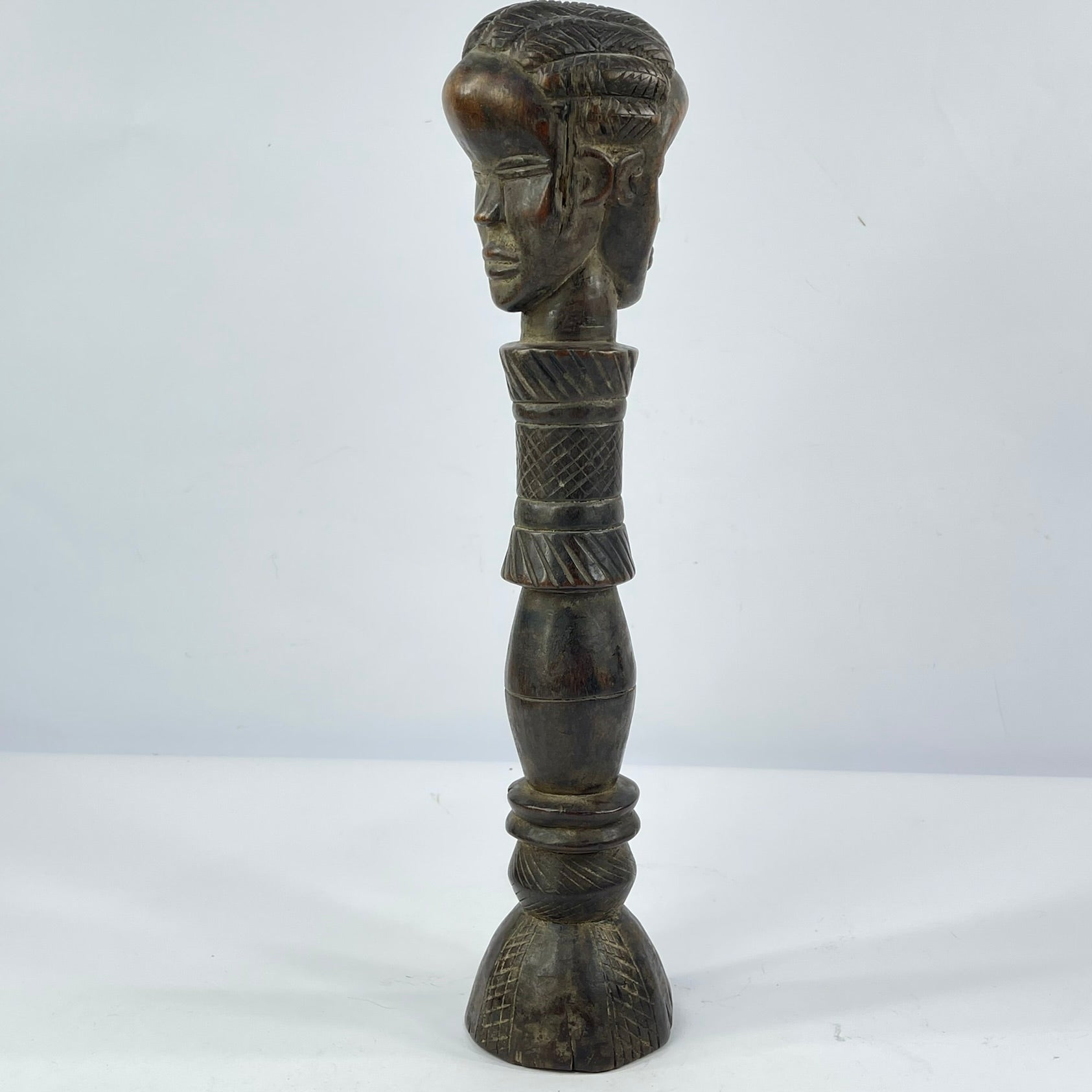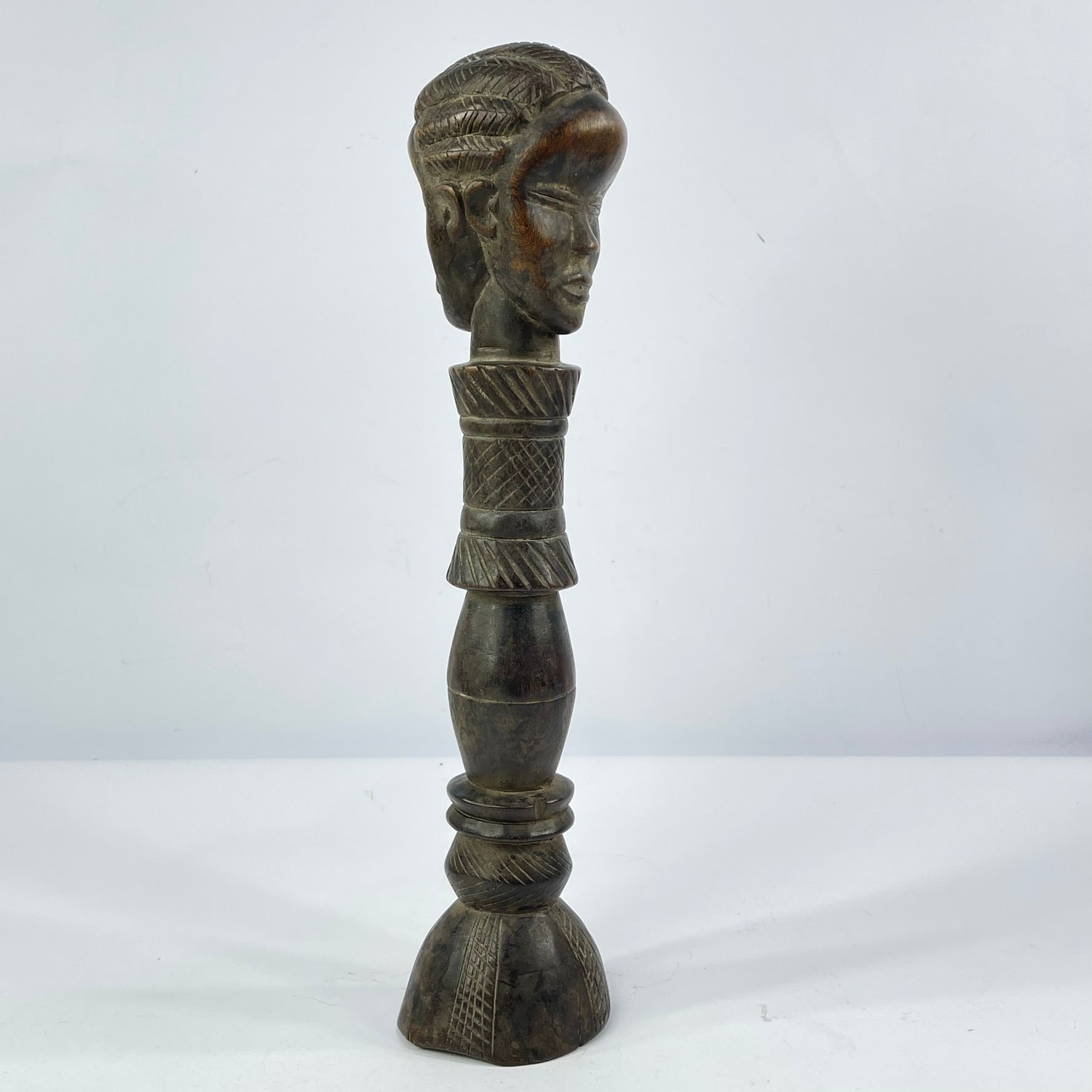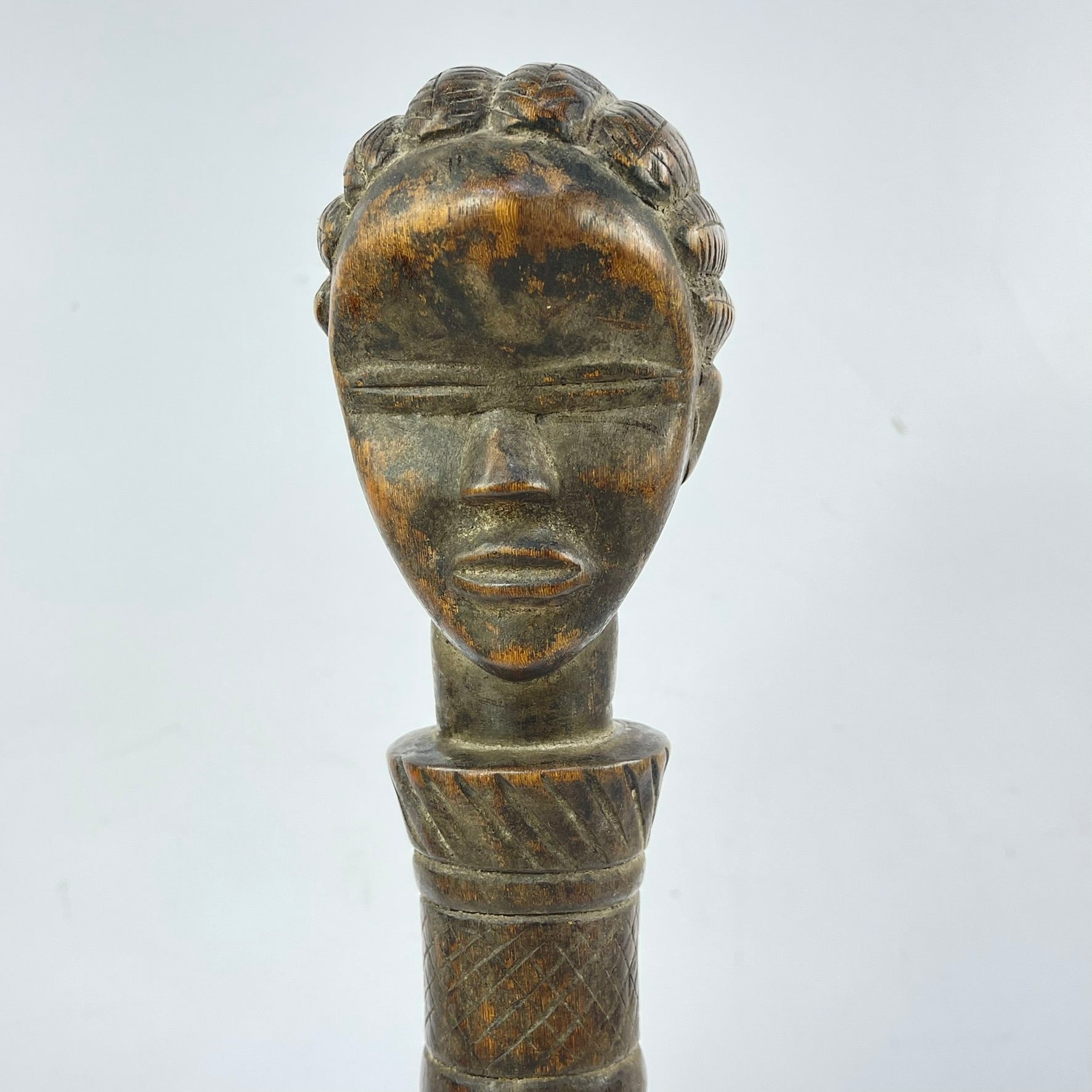 Scepters such as this were often associated with status, leadership, or ceremonial authority, serving as symbols of prestige and social distinction. The smooth, darkened patina suggests age and handling, enhancing its authenticity and sculptural warmth.