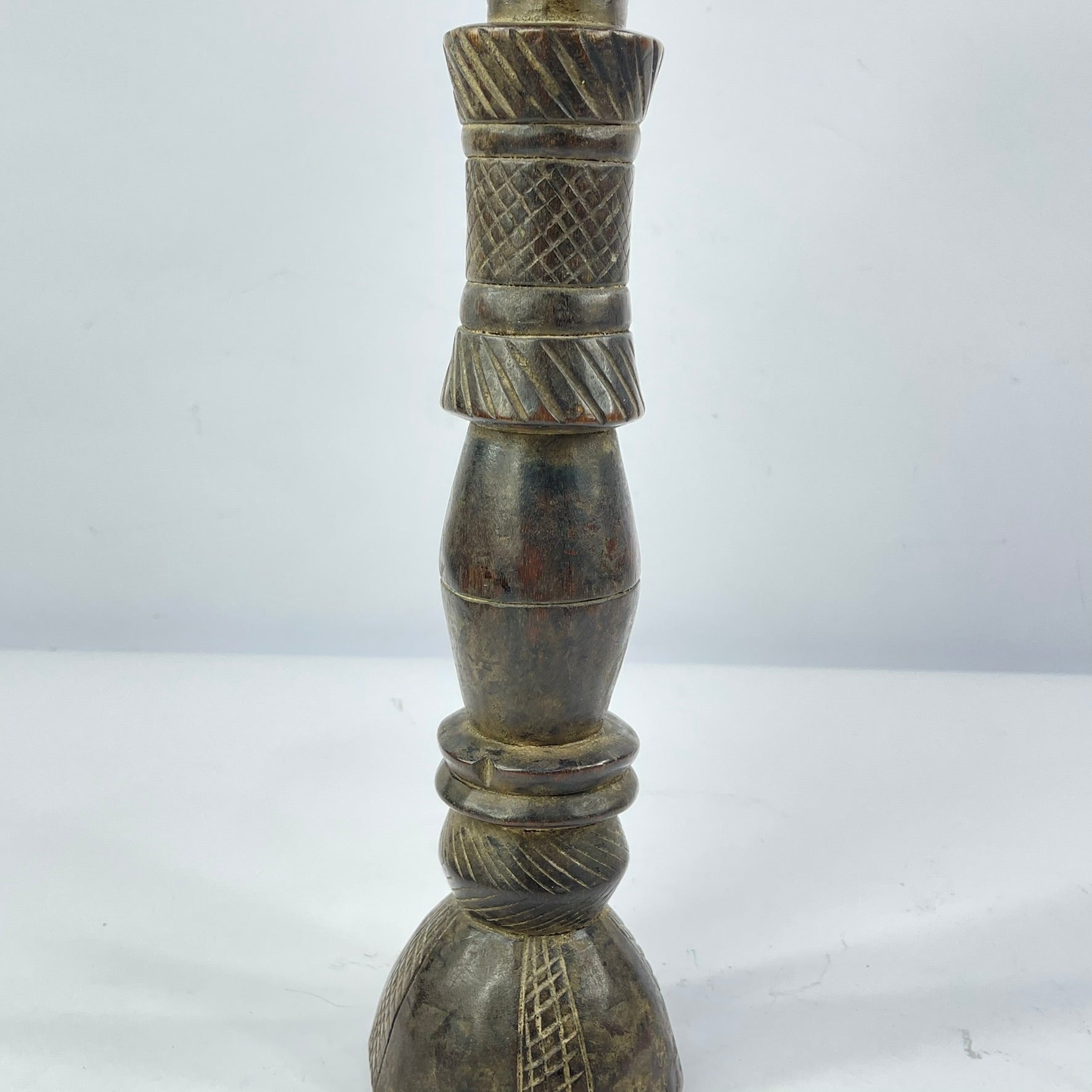 The elongated shaft is rhythmically segmented with geometric carving, including crosshatching and diagonal banding that add both visual texture and tactile depth. The sculpted head transitions into a balanced, tapering handle, giving the work a strong vertical presence and harmonious proportions.