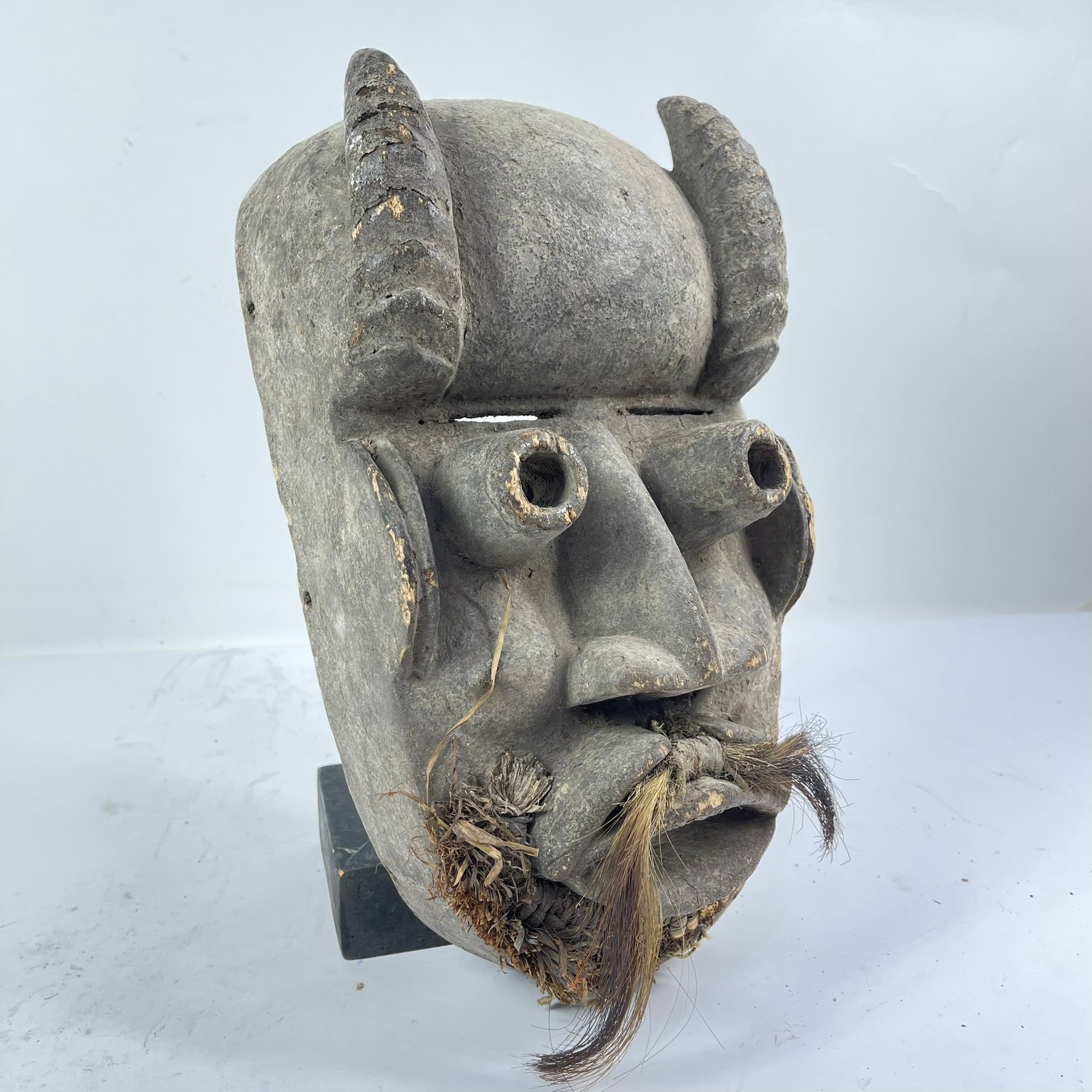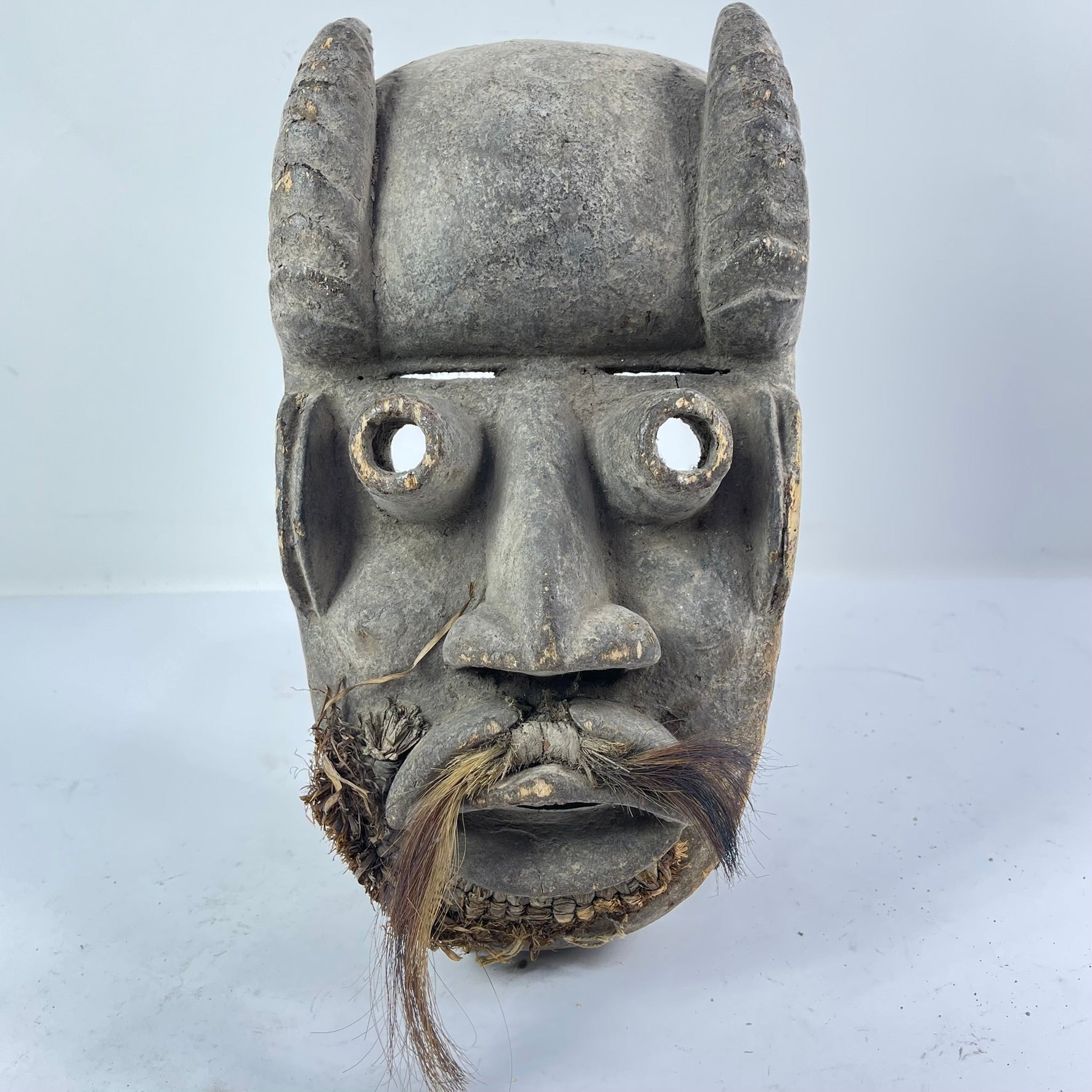 Both the Dan and Wee have dynamic masking associations known as Poro that initiate the young and regulate society. Poro is an exclusively restricted men's society, however, masks between the Wee and their Dan neighbors are divided into male and female categories based on their form and details. Female masks are rounded or oval, with narrow eyes and finely delicate non-challenging features, whereas the male mask is larger in size, and grosser in proportions, with an open and challenging mouth with teeth, tube-like eyes, fur, and raffia. The exaggerated features of this mask, though vaguely human, refer to forces in the bush whose energy and powers add to the authority of the spirit represented. Whereas female masks appear to entertain, male masks exercise social control, punishing wrongdoers, settling disputes, declaring wars and proclaiming peace. In the past, they are also said to have been in the bush camps when the boys were being initiated. Wee masks like this were meant to instill fear through their appearance combining human and animal features and remembrance of the masks's aggressive behavior in the past.
