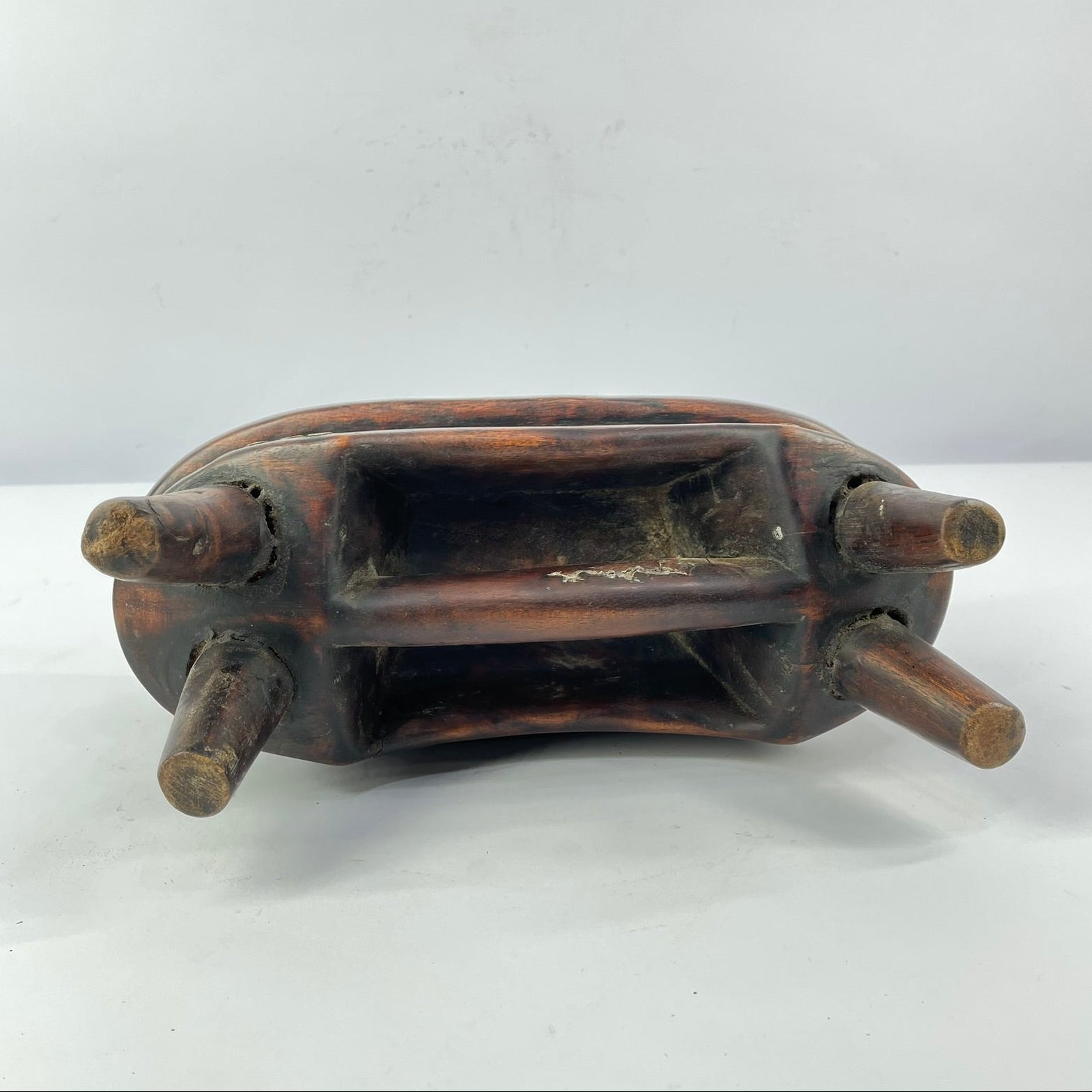 The Dinka nomadic lifestyle is reflected in their art. In fact, the Dinka have excelled in the production of small objects, easy to carry. Stools and headrests are among these precious objects. Dinka headrests or neck rests are carved from a single piece of yellowish-brown wood and consist of three to four-legged stable legs, sometimes carved separately from one another. In most cases like here, the all piece is made from one single piece of wood. The upper level parts have various forms and are usually narrow, curved with rounded corners, slightly concave along their length, and convex across their width, with a convex underside. Some have zoomorphic motifs which include birds, antelopes, and giraffes.