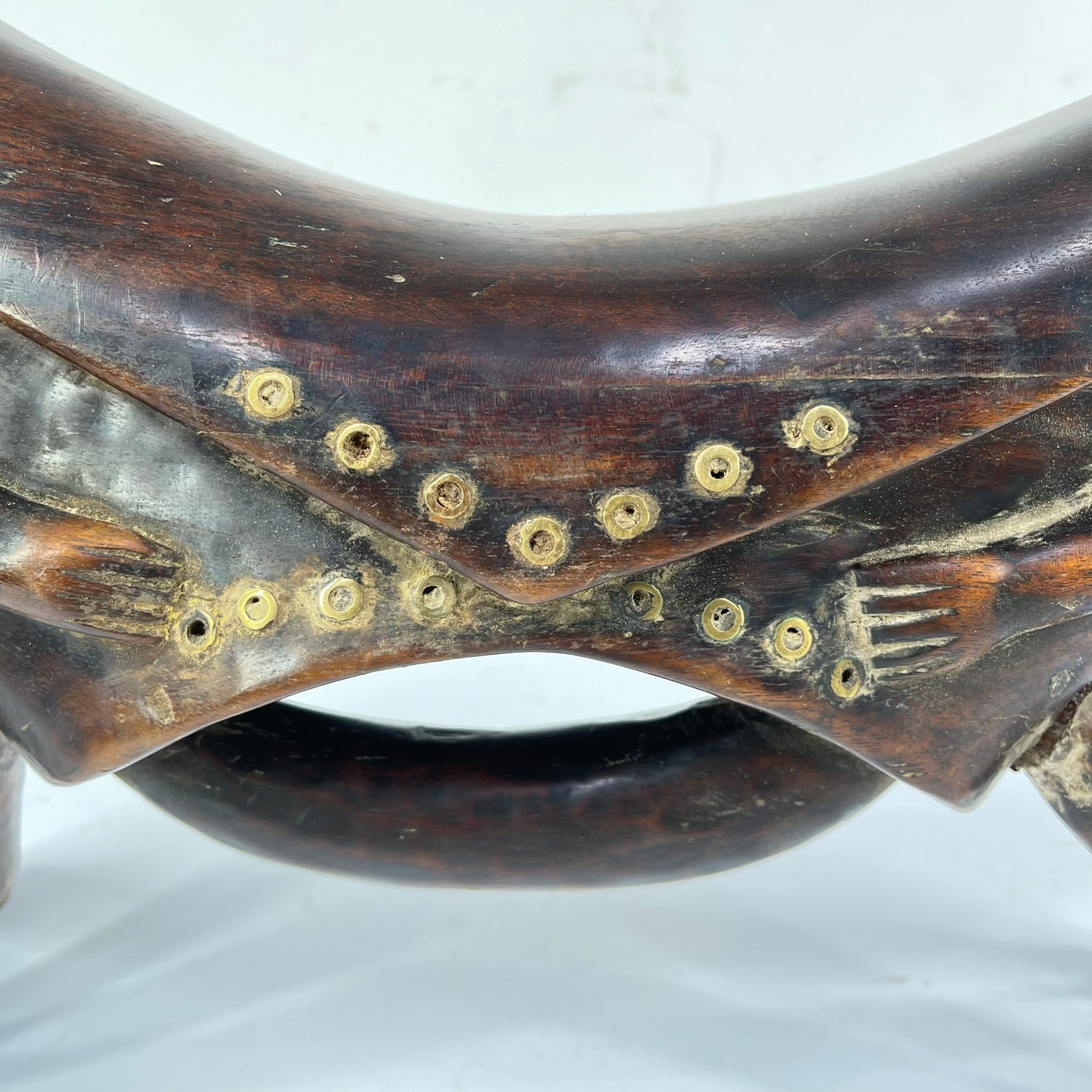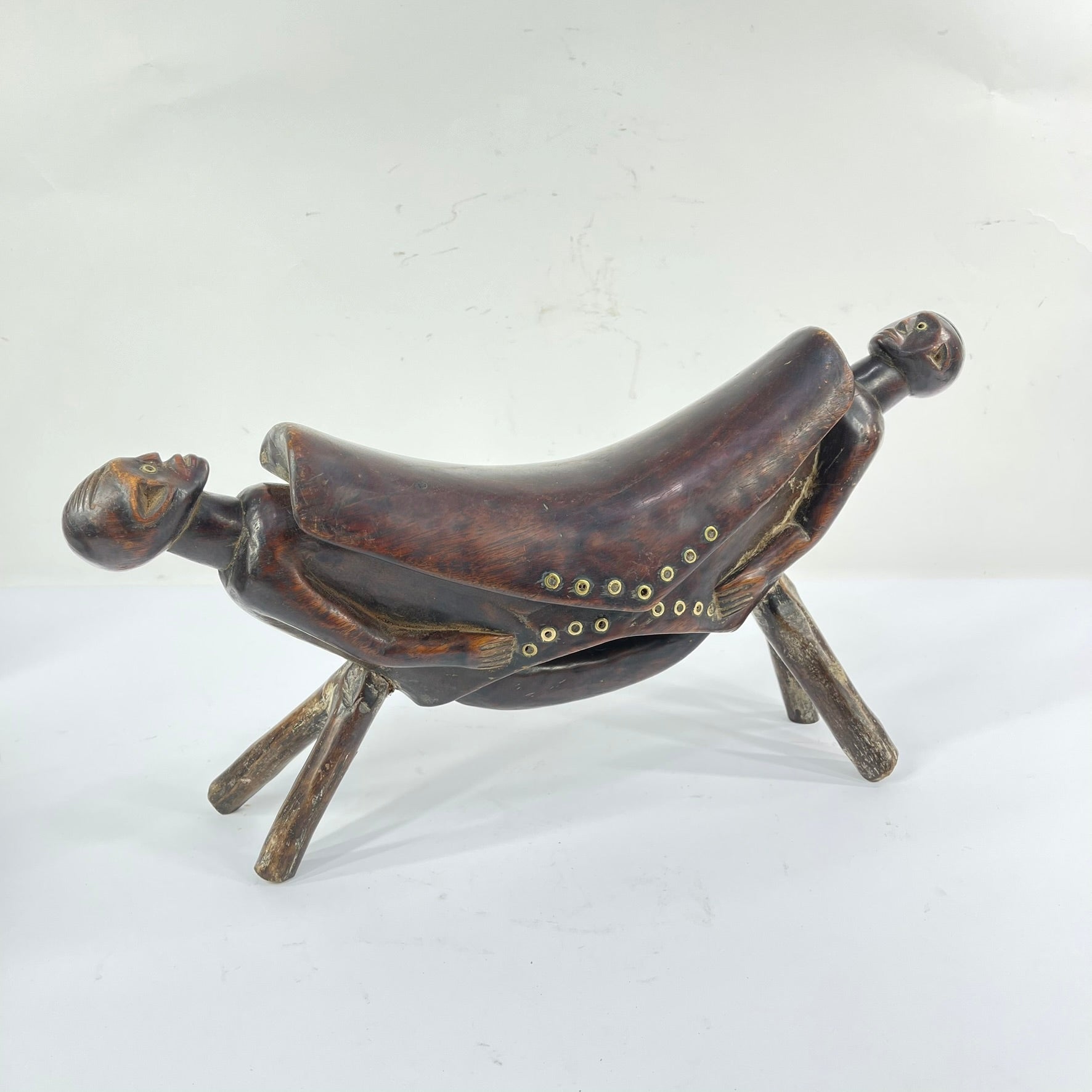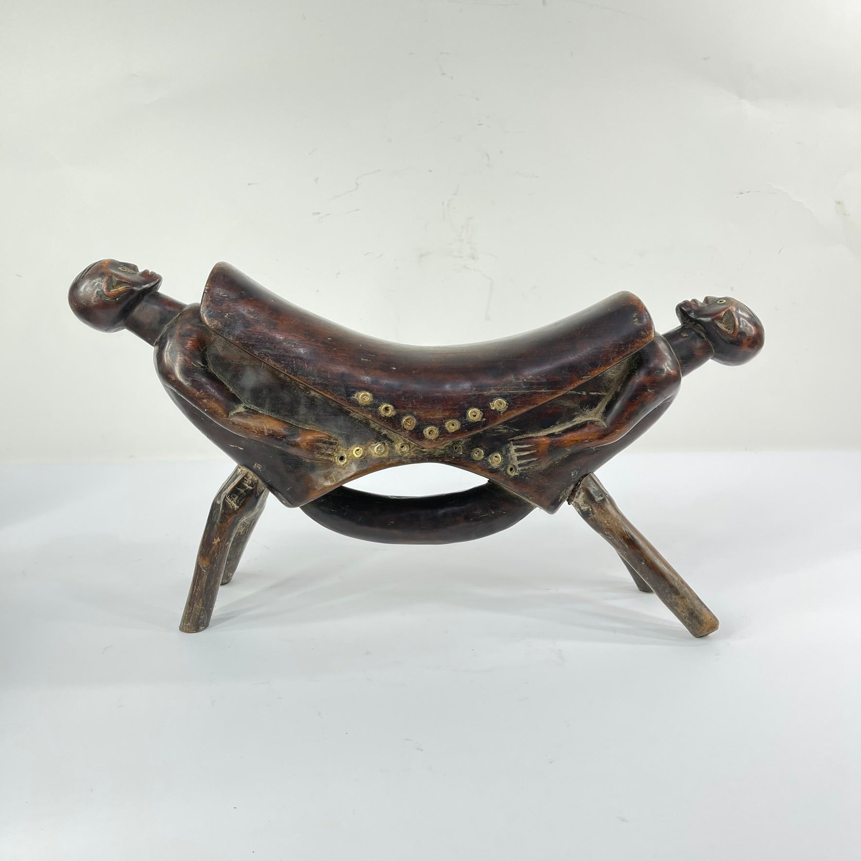 The Dinka nomadic lifestyle is reflected in their art. In fact, the Dinka have excelled in the production of small objects, easy to carry. Stools and headrests are among these precious objects. Dinka headrests or neck rests are carved from a single piece of yellowish-brown wood and consist of three to four-legged stable legs, sometimes carved separately from one another. In most cases like here, the all piece is made from one single piece of wood. The upper level parts have various forms and are usually narrow, curved with rounded corners, slightly concave along their length, and convex across their width, with a convex underside. Some have zoomorphic motifs which include birds, antelopes, and giraffes.