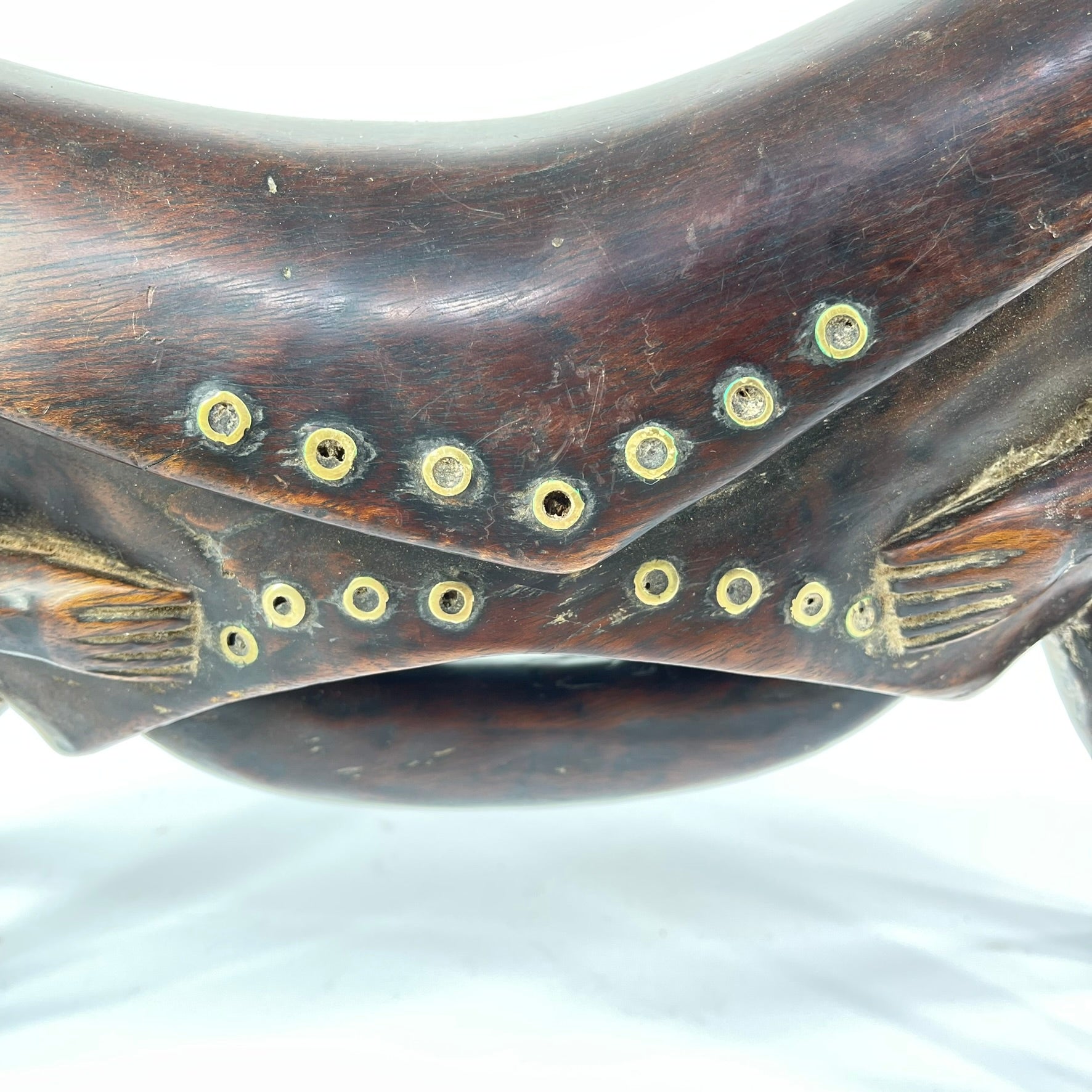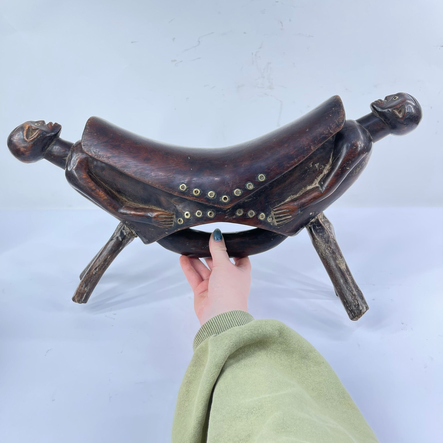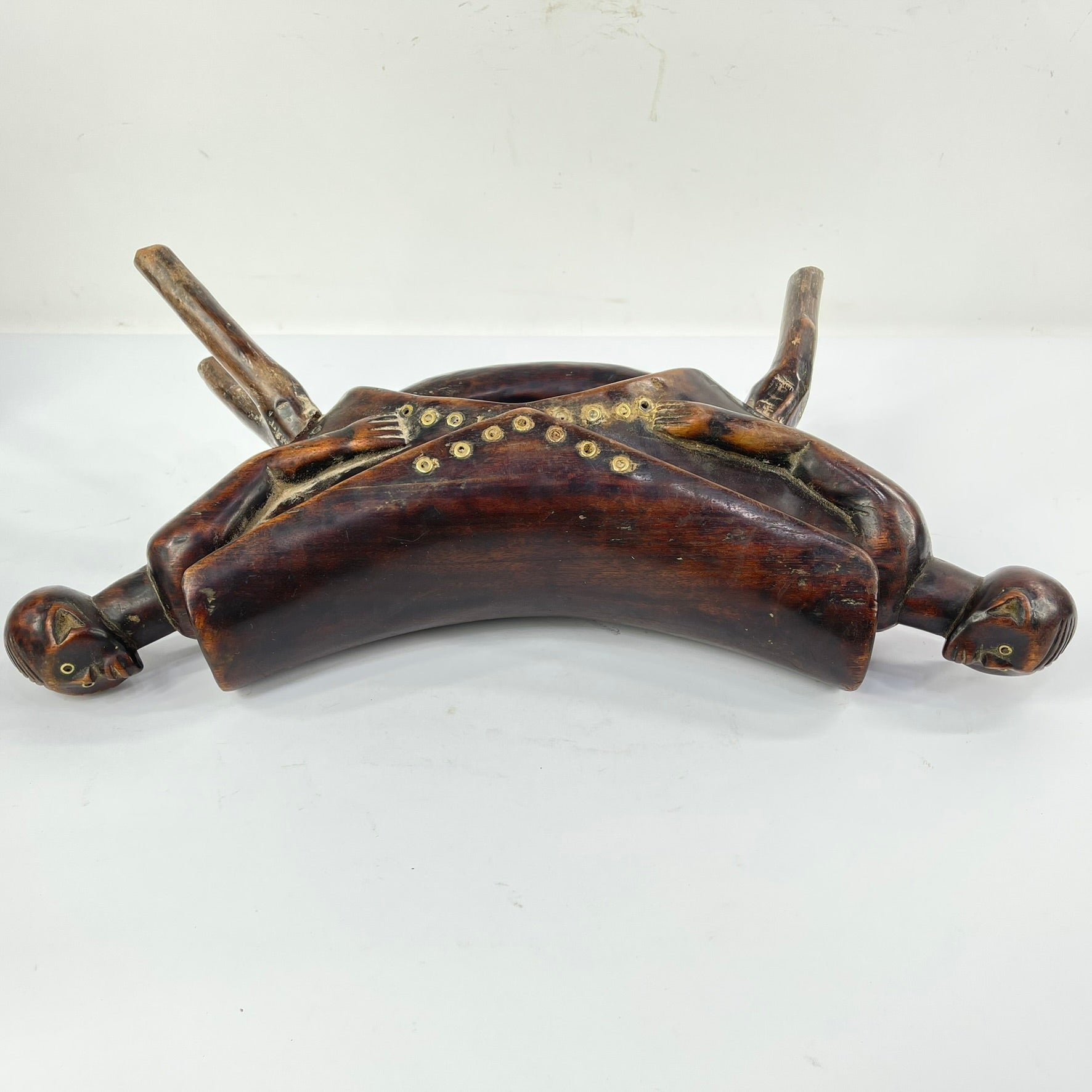 The Dinka nomadic lifestyle is reflected in their art. In fact, the Dinka have excelled in the production of small objects, easy to carry. Stools and headrests are among these precious objects. Dinka headrests or neck rests are carved from a single piece of yellowish-brown wood and consist of three to four-legged stable legs, sometimes carved separately from one another. In most cases like here, the all piece is made from one single piece of wood. The upper level parts have various forms and are usually narrow, curved with rounded corners, slightly concave along their length, and convex across their width, with a convex underside. Some have zoomorphic motifs which include birds, antelopes, and giraffes.