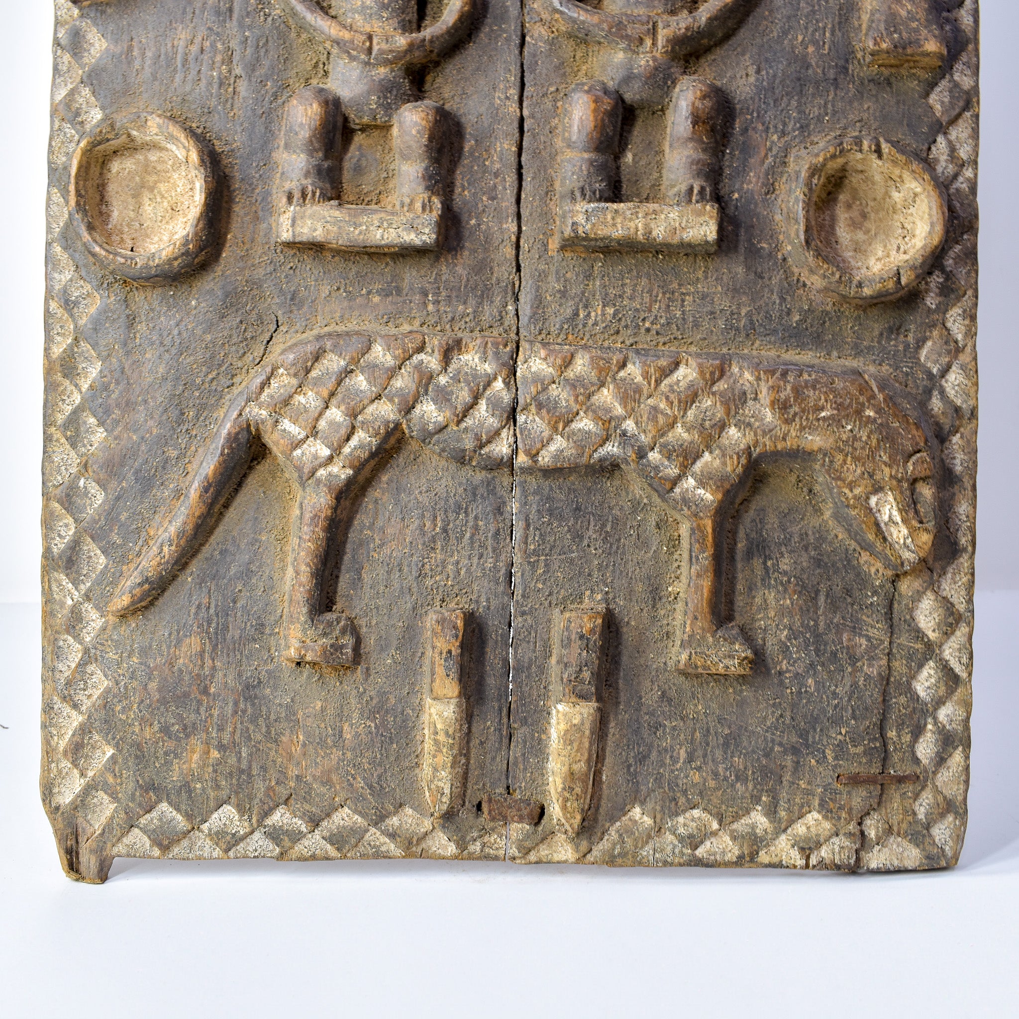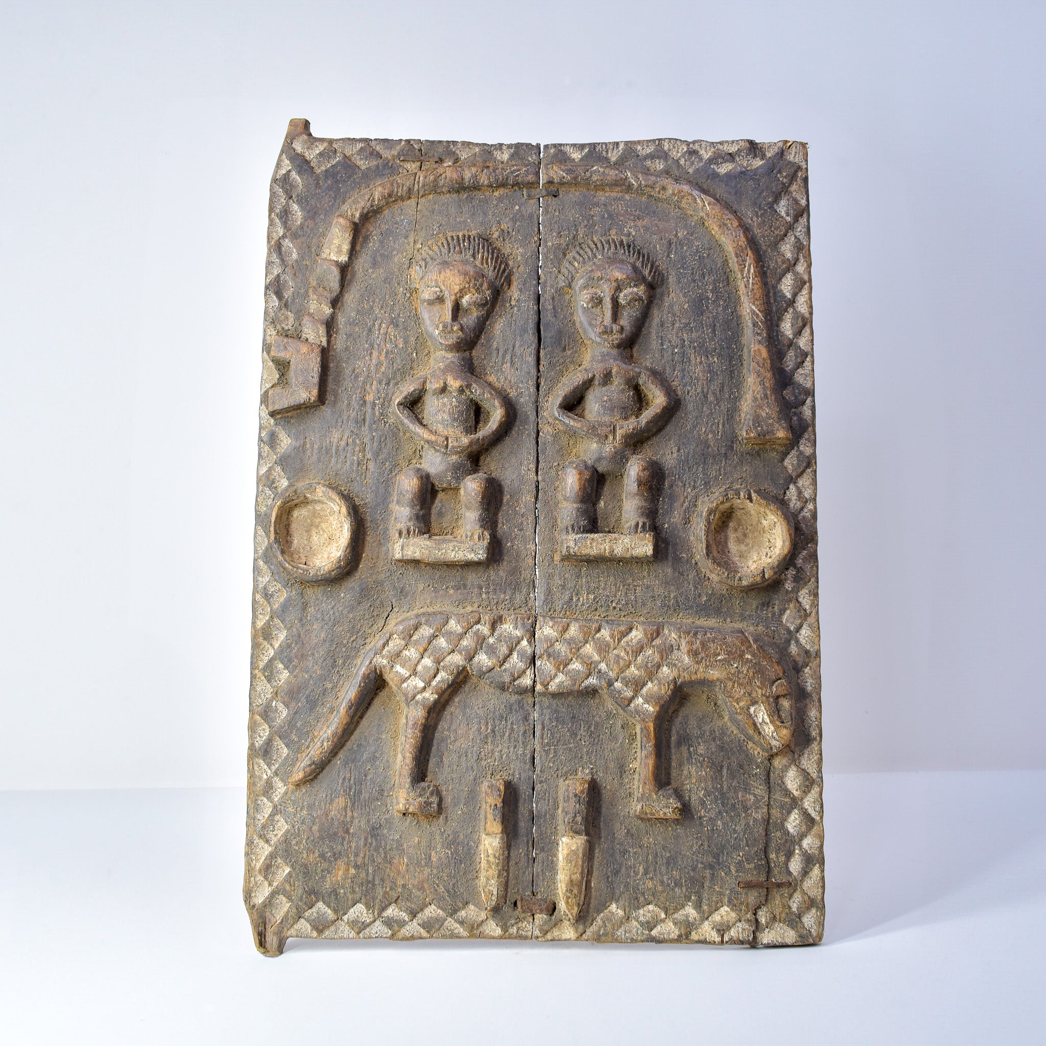 These doors boast symbolic carvings—breasts denoting fertility, masks signifying rituals, herringbone patterns representing water and light vibrations, and ancestral figures emphasizing unity. Dogon Doors are functional, symbolic, and decorative, believed to possess spiritual significance by offering protection against malevolent spirits. This art stands as a crucial emblem of Dogon culture, revered globally for its uniqueness, deep symbolism, and historical importance.