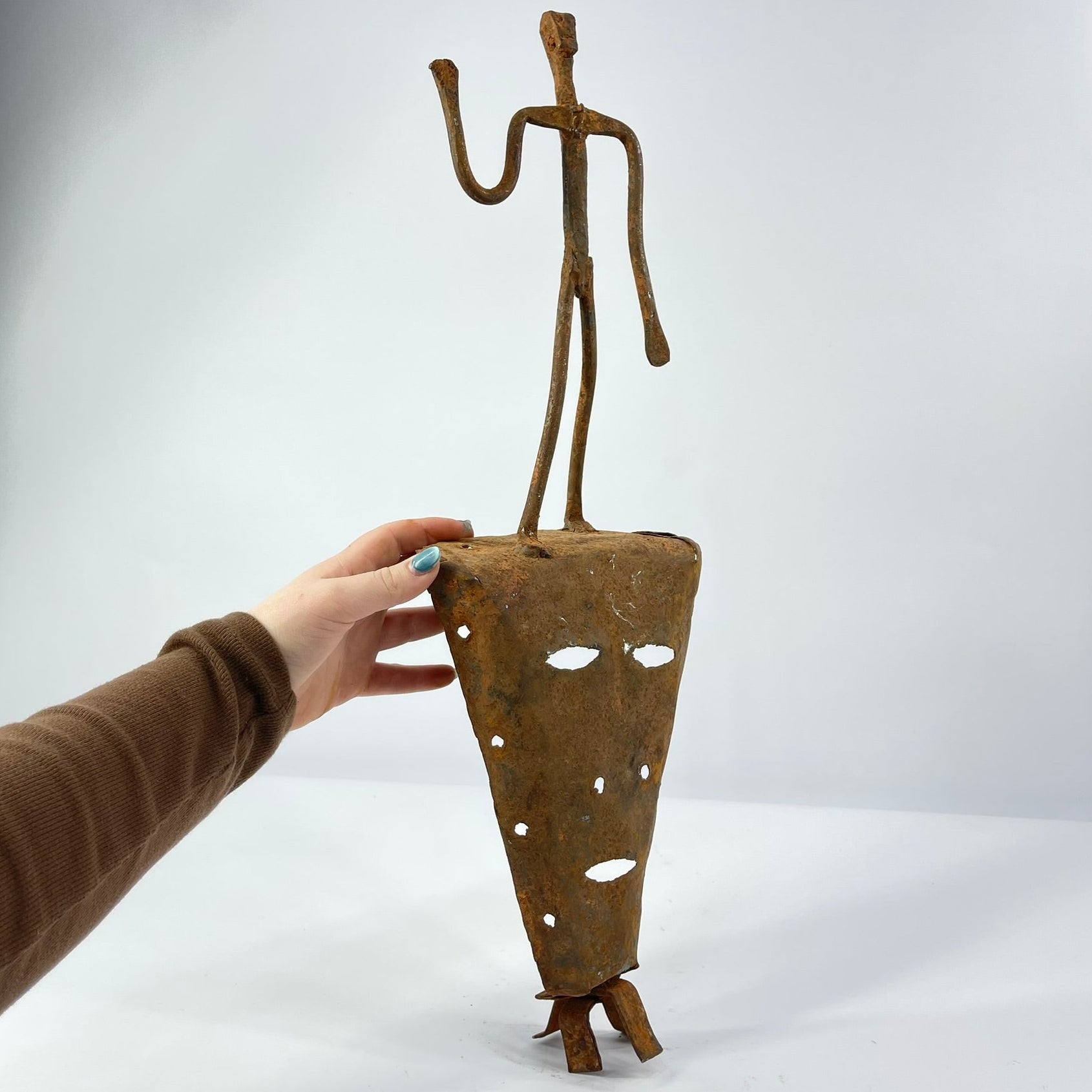 The mask is formed from a hammered iron sheet with a tapering silhouette, pierced eyes, nose, and mouth, and a richly aged surface that preserves visible hammer marks. Surmounting the mask is a stylized iron figure, likely referencing ancestral presence or the Nommo—primordial beings central to Dogon creation myths.