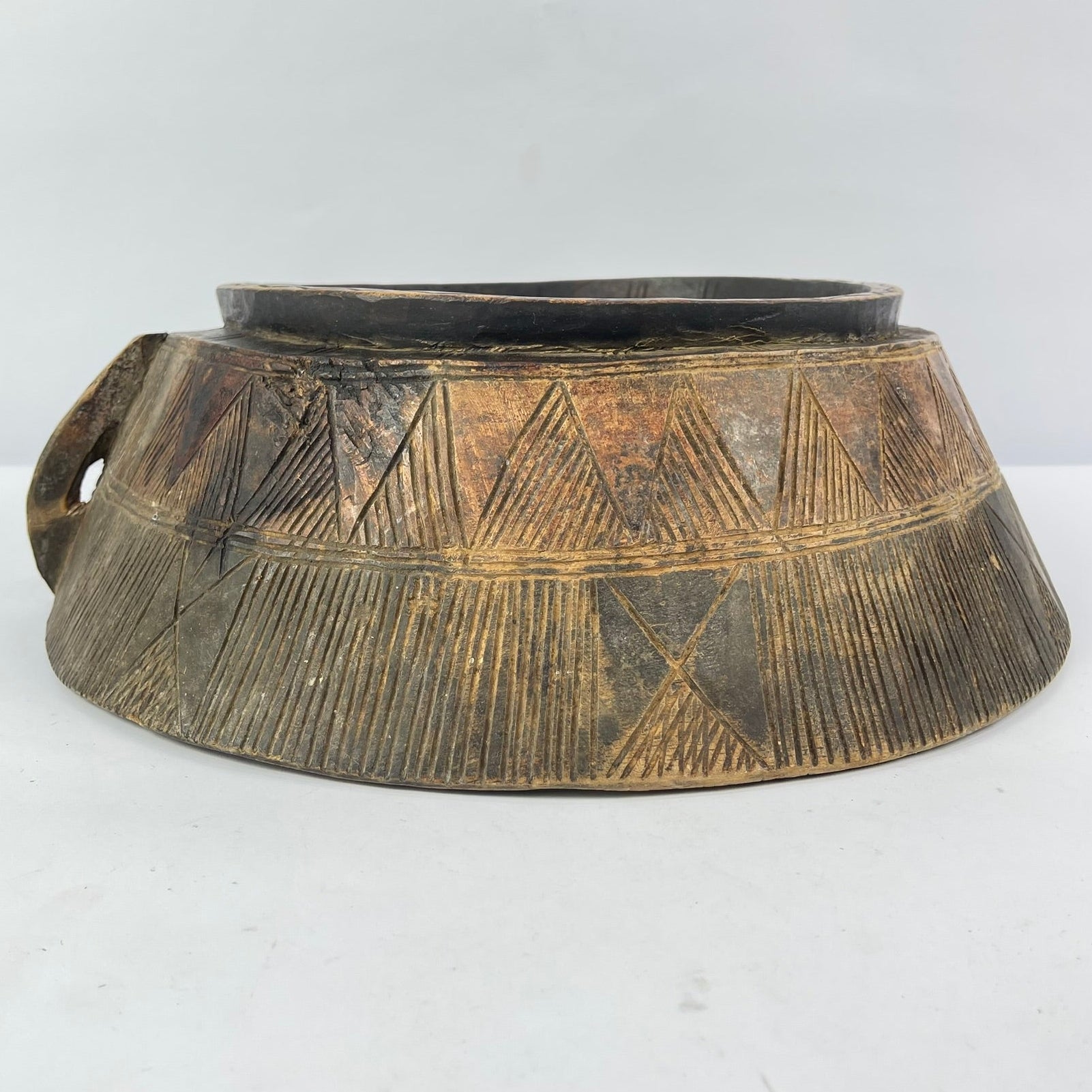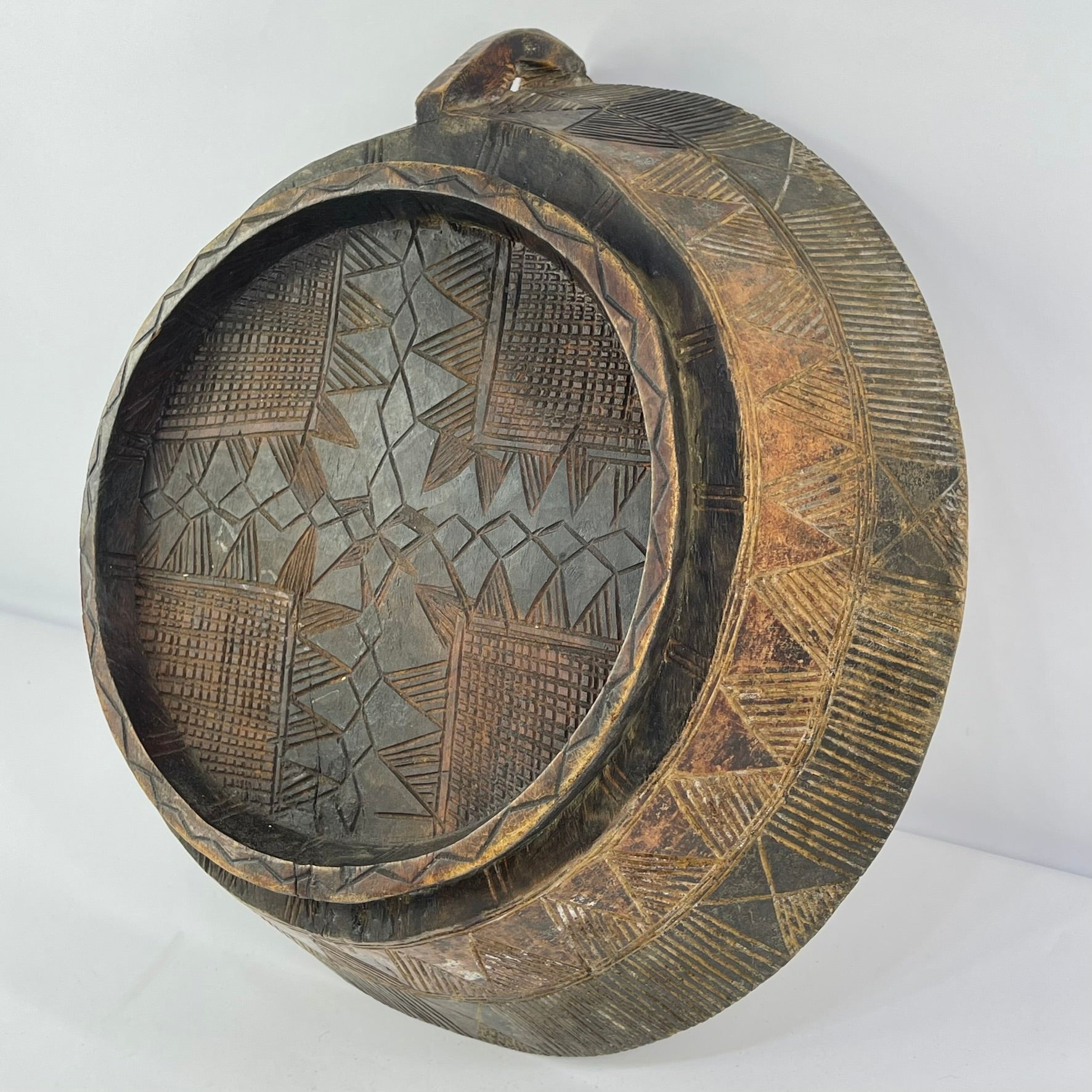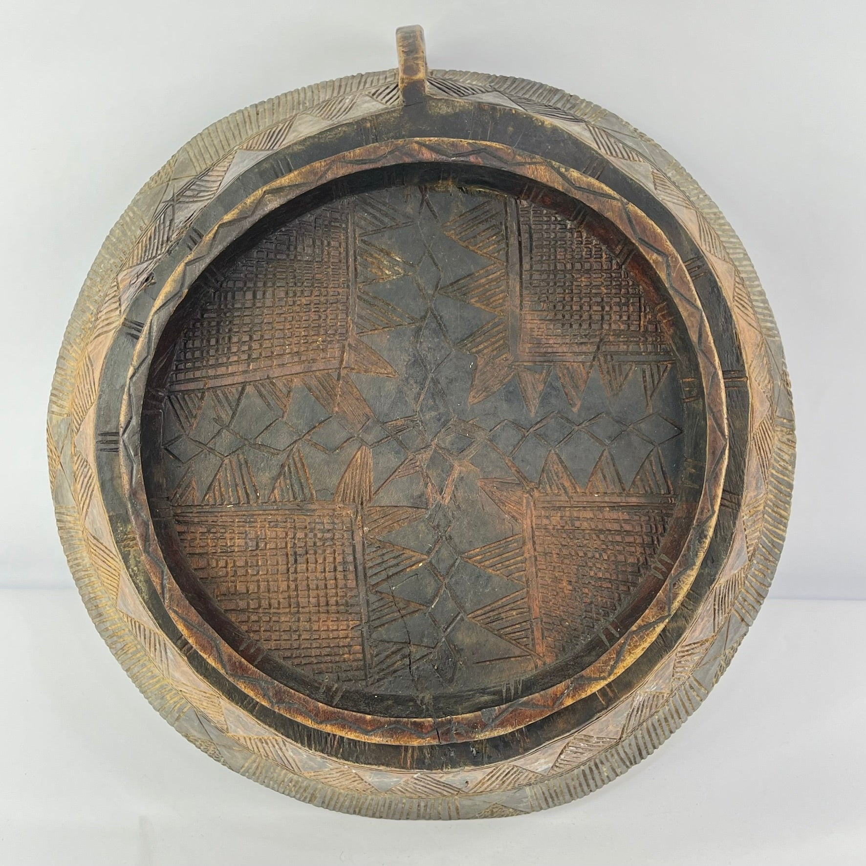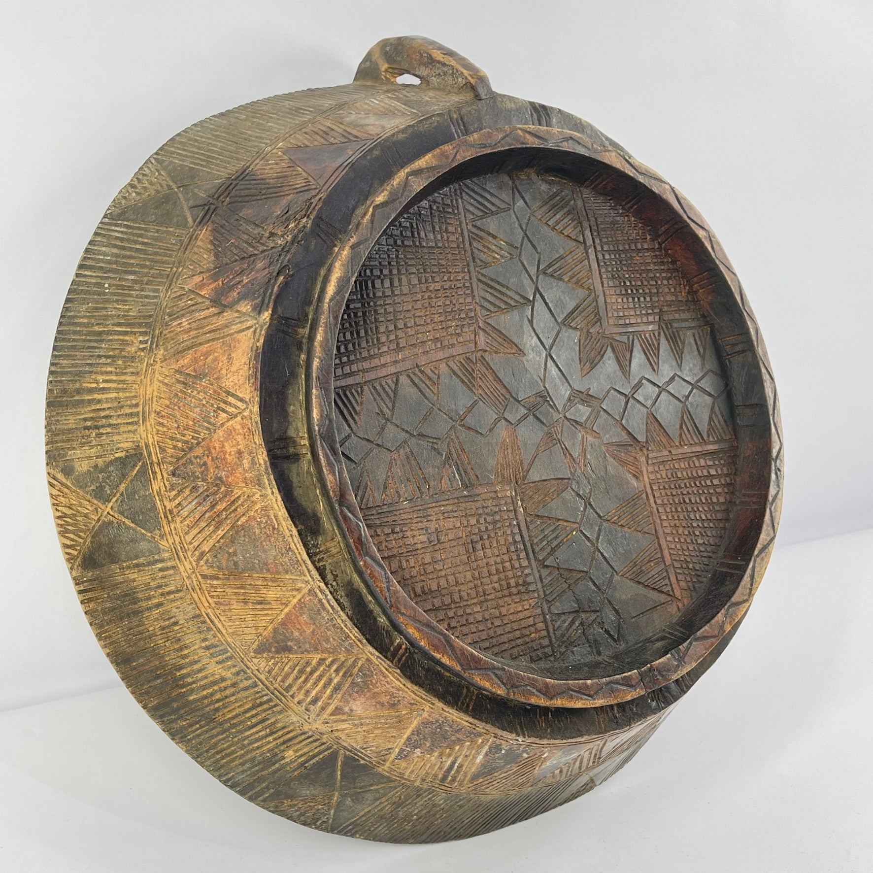 This mid-20th century Ethiopia chopping bowl is hand-carved from a single piece of hardwood, featuring bold geometric patterns that highlight traditional craftsmanship. Originally used for food preparation, it shows a rich, warm patina from years of use, adding to its character and authenticity. The integrated handle enhances both function and display, making it a versatile piece that works beautifully as wall décor or a rustic centerpiece.
