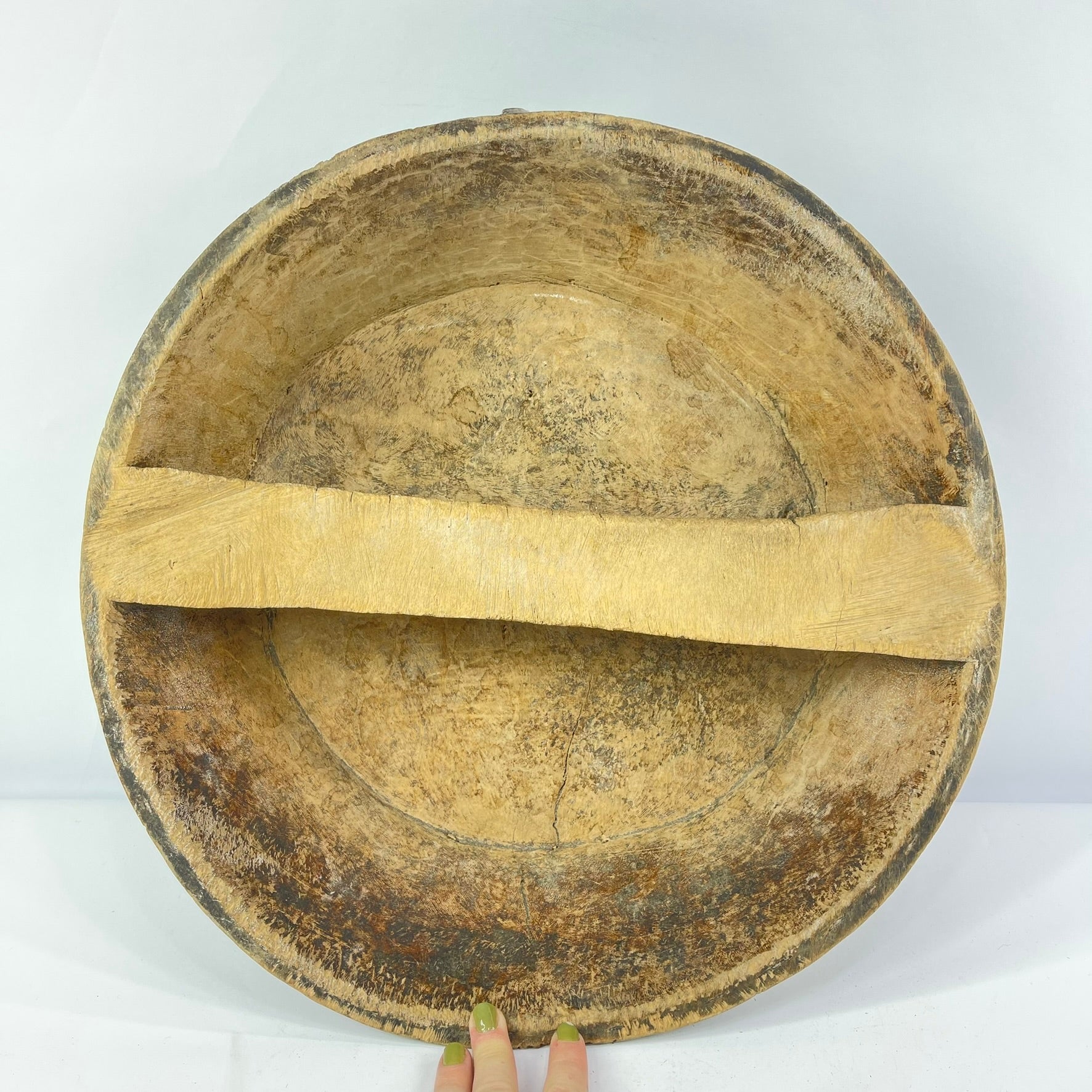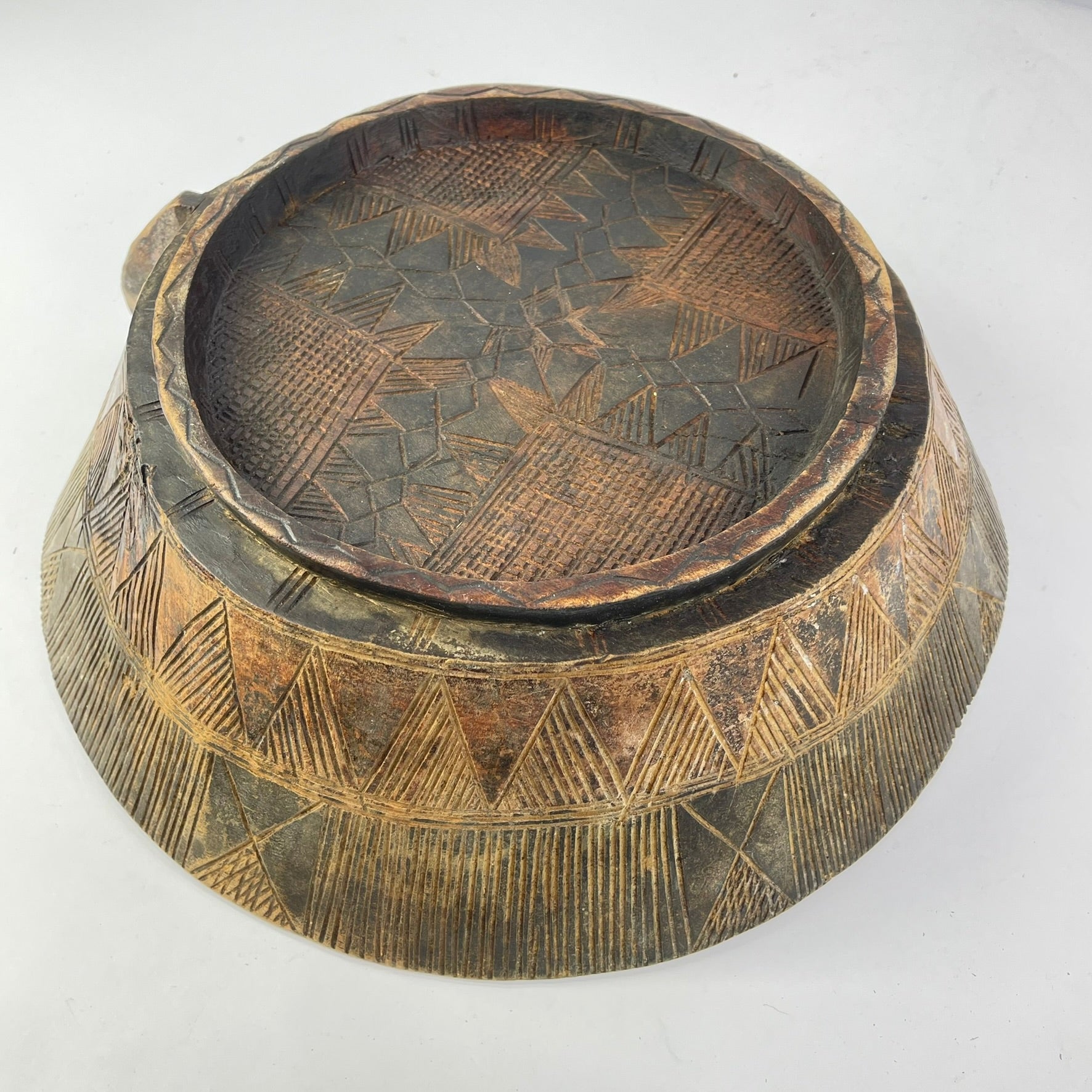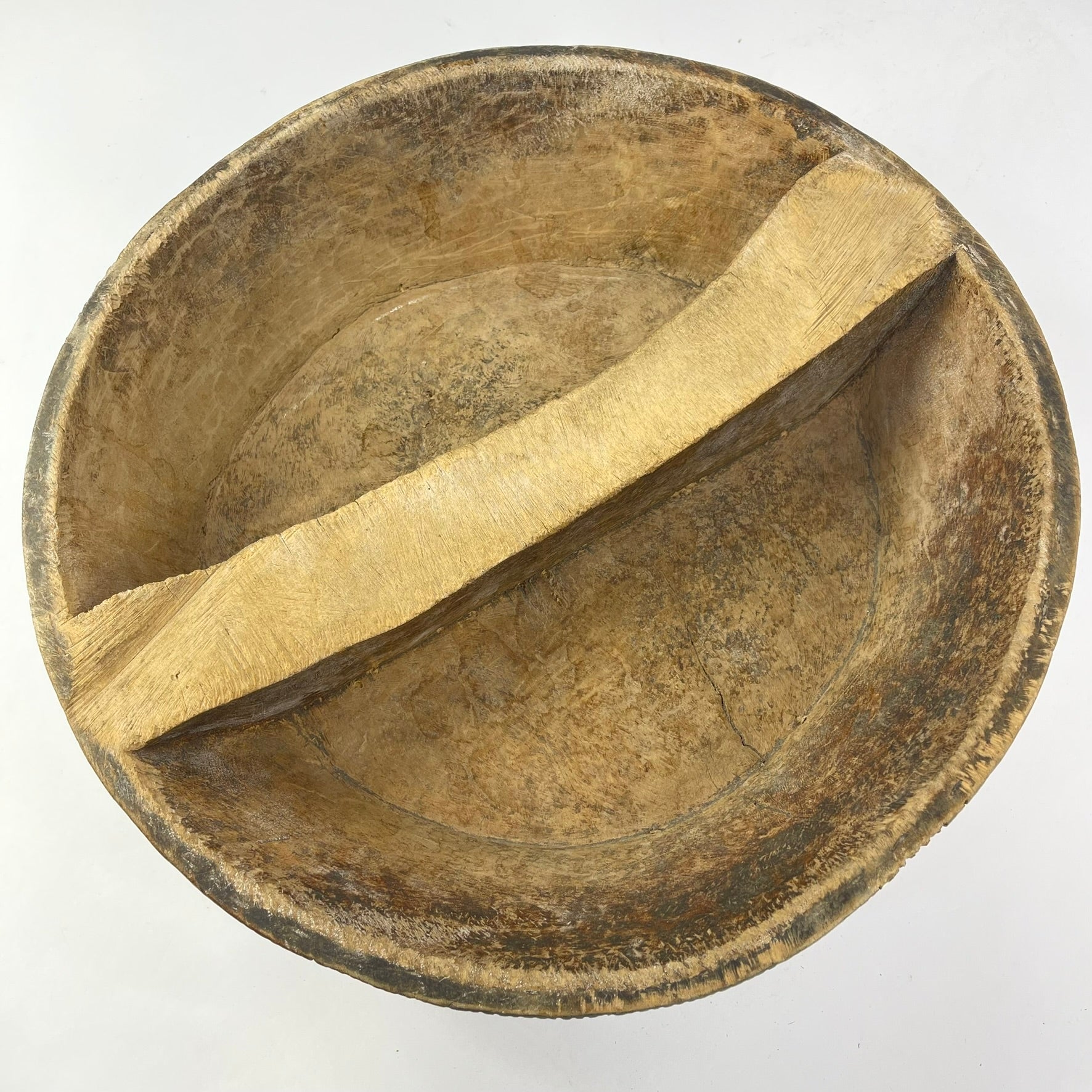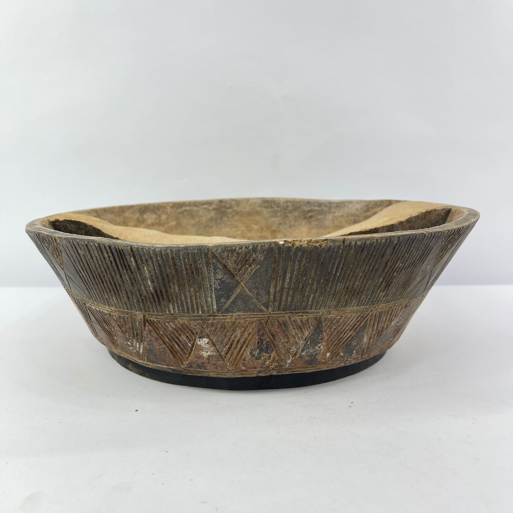 This mid-20th century Ethiopia chopping bowl is hand-carved from a single piece of hardwood, featuring bold geometric patterns that highlight traditional craftsmanship. Originally used for food preparation, it shows a rich, warm patina from years of use, adding to its character and authenticity. The integrated handle enhances both function and display, making it a versatile piece that works beautifully as wall décor or a rustic centerpiece.