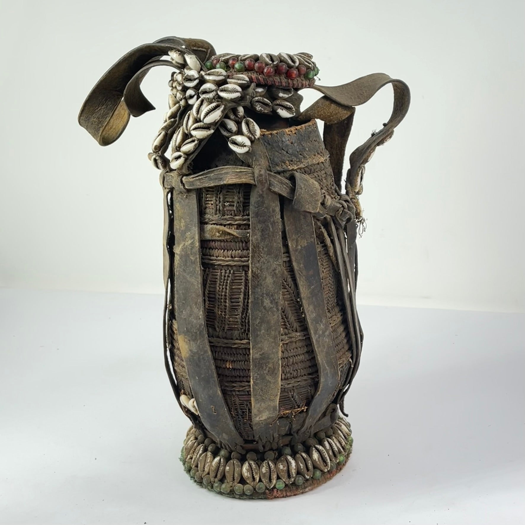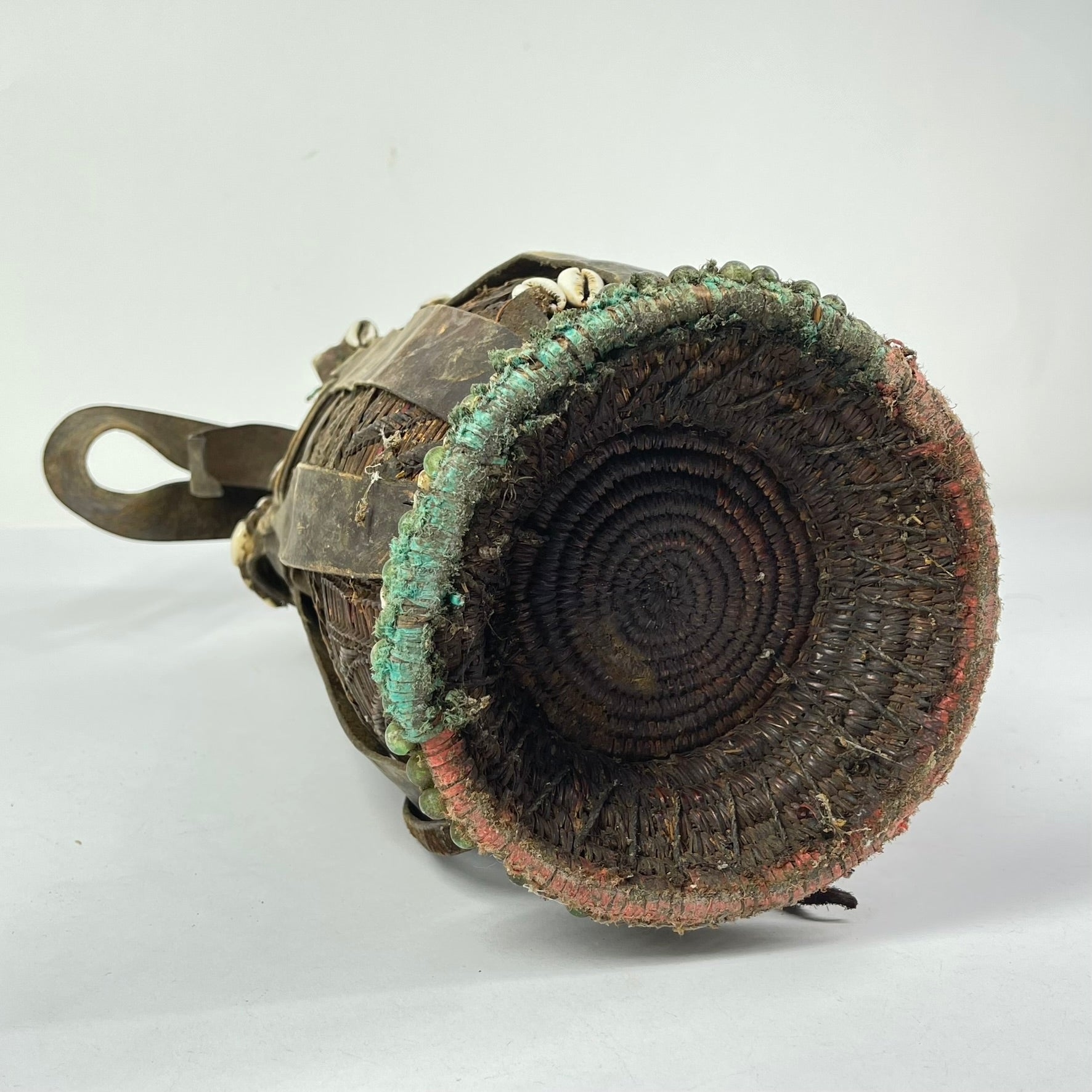 The jug features intricate basketry work, with the body tightly woven for durability and wrapped in aged leather bands for structure and protection. Around the neck and base, decorative embellishments of cowrie shells and beads add a touch of cultural symbolism—cowries often represented wealth and fertility in East African societies. They also have repurposed everyday items, such as the inside of flashlights and plastic containers.